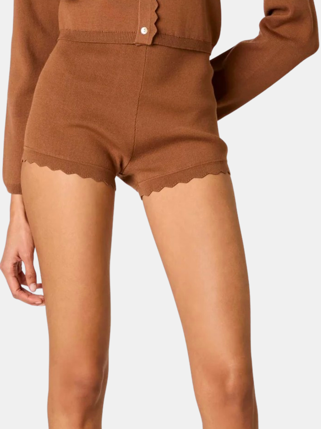 Designed for downtime, elevated by detail. The Mazzy Knit Short is cut from soft ribbed knit with a scalloped hem and an easy pull-on fit. Its mid-rise waistband and subtle texture balance ease with a tailored feel. Complete the look with the Roxie Cardigan for a matching set moment. Shown in Navy and Nougat.