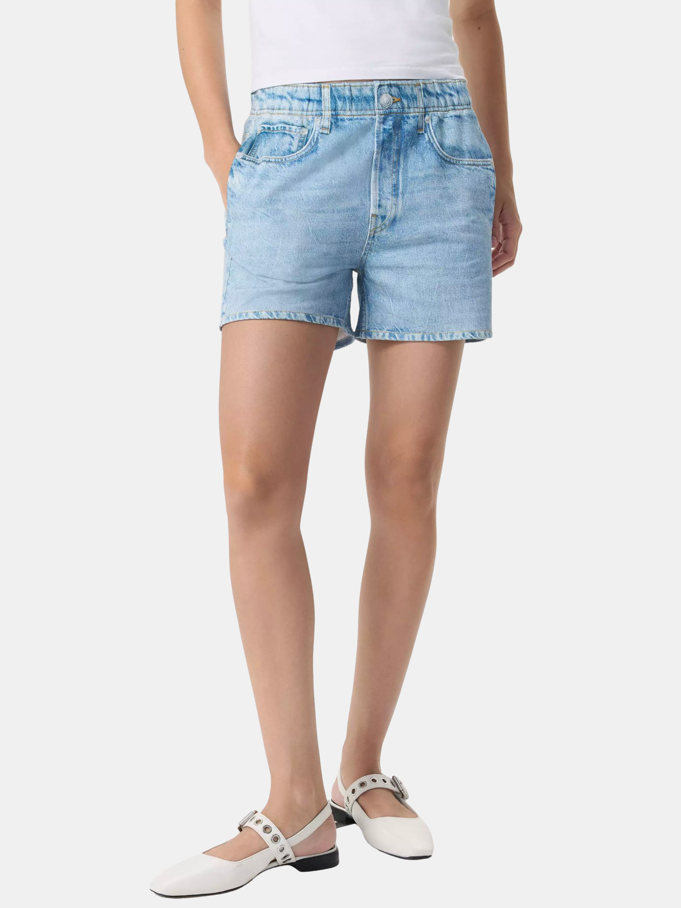 Miramar, a revolutionary printing technique, makes any material look like denim. These walking shorts are individually cut and sewn from cotton terry cloth that's ultra-soft on the inside and printed on the outside to look like your favorite jean shorts. Featuring a 4" inseam plus a pull-on elastic waistband and hidden side-seam pockets, the mid-rise style further achieves its comfortable fit and feel with the other pockets and denim details digitally printed on the fabric. Shown in Seneca and Kacy.