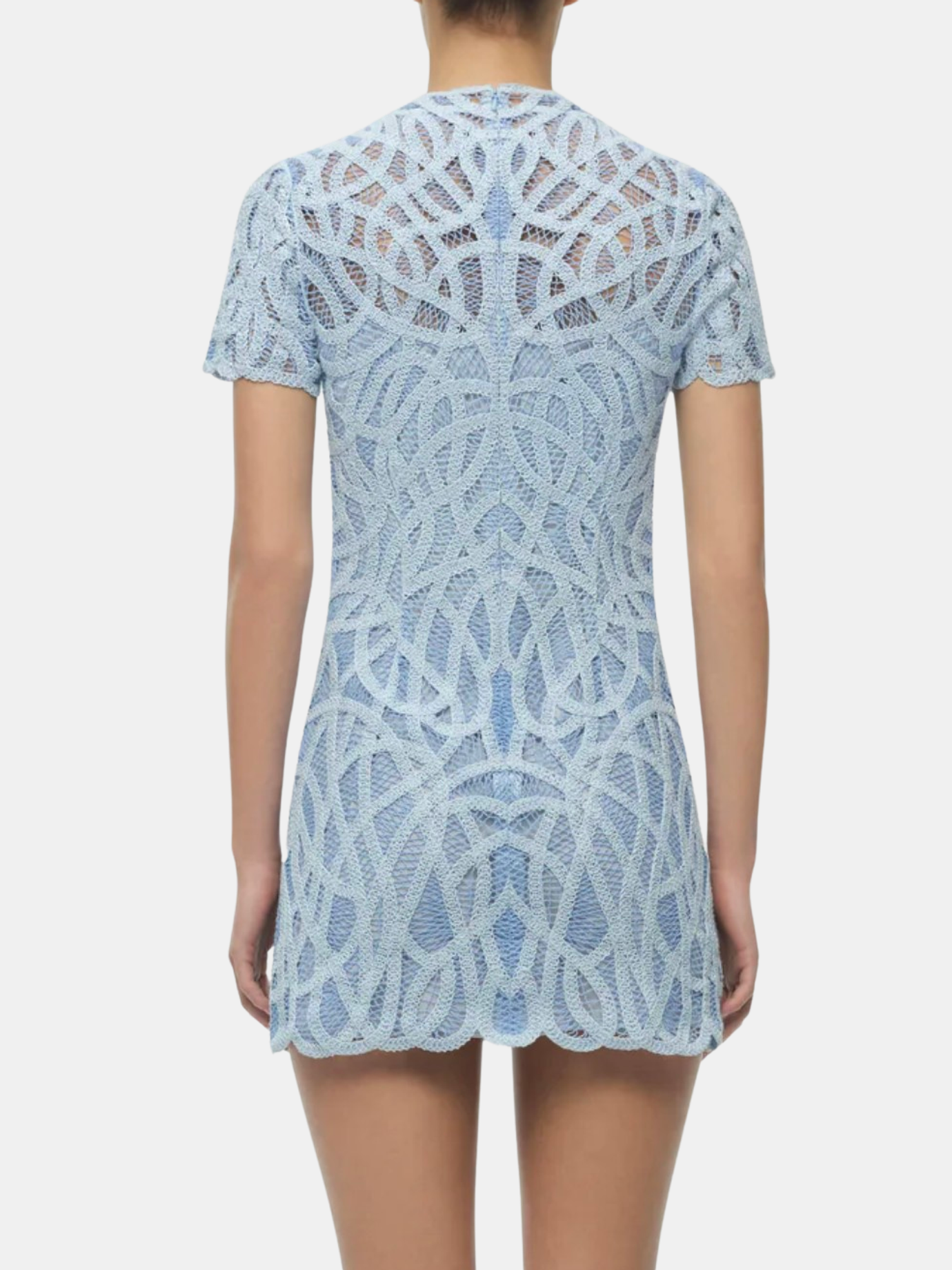 Crafted in botanical macramé embroidery, this mock-neck mini dress balances structure with sleek elegance. Short sleeves and precise detailing define a refined silhouette. Shown in Periwinkle and White.
