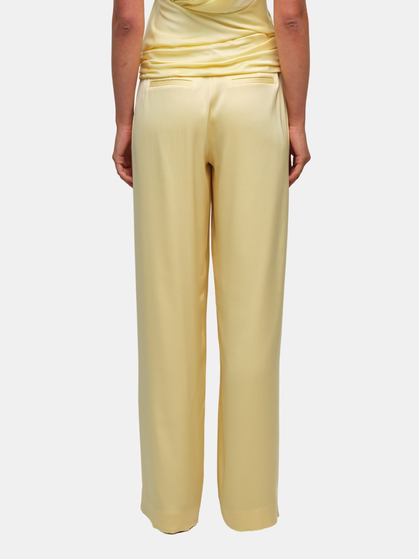 Cut in satin, these wide leg pants sit high on the waist with a clean front. The leg opens into a sweeping line finished with a crisp hem. Tailored ease with a subtle sheen. Pair with the coordinating Samira Satin Cape Top. Shown in Buttercream.