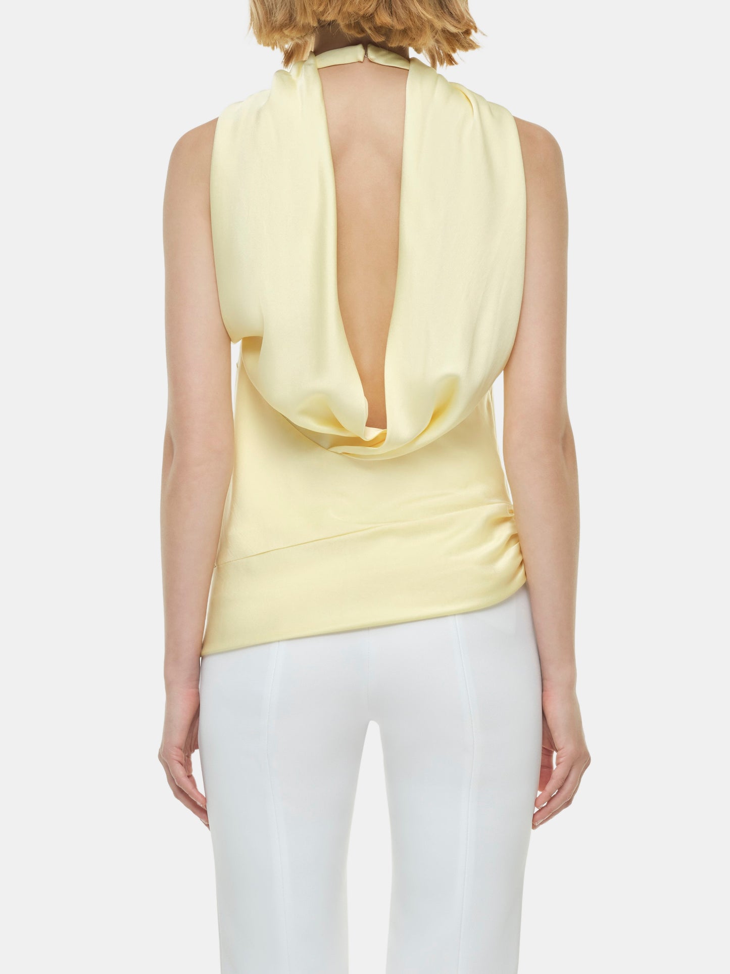 This woven satin top features a halter-inspired cape design. Gathered detailing at the hem creates fluid movement, balancing a sculpted silhouette with effortless sophistication. Pair with the matching Kyra Wide Leg Pant. Shown in Buttercream.