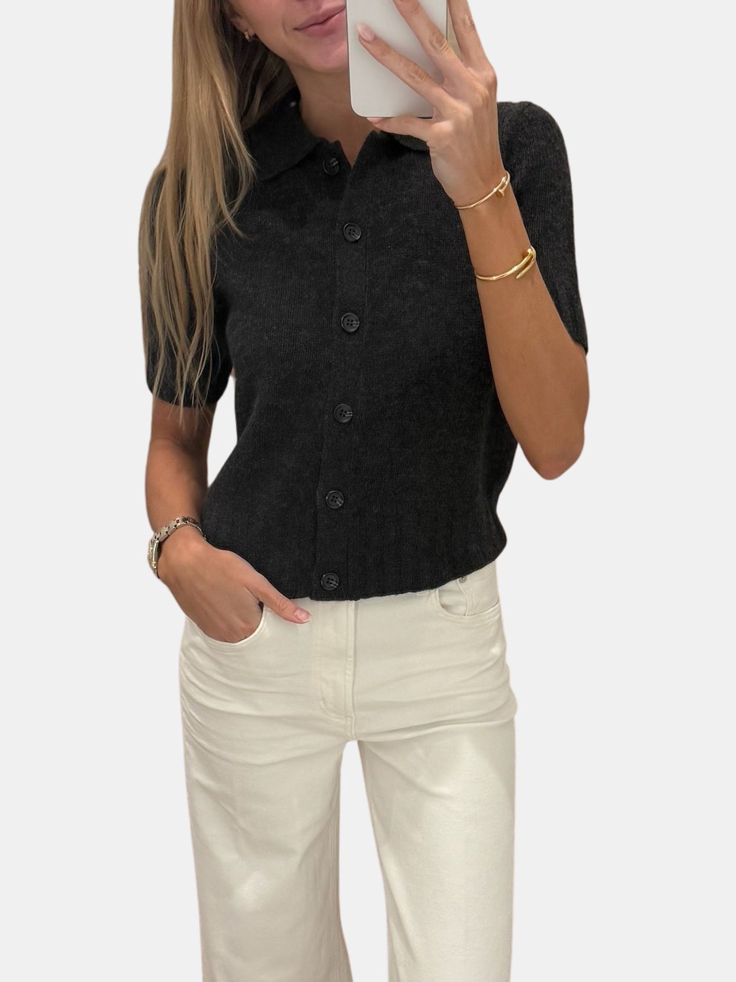 The perfect blend of a polo and a cozy cardigan, the Cashmere Short Sleeve Collared Sweater is a versatile wardrobe staple. This top is designed with a flattering fit, tonal buttons, and a structured collar that adds an air of sophistication to its plush cashmere feel. Pair it with high-waisted trousers or your favorite denim for an effortless, high-end look. Shown in Oat and Smoke.