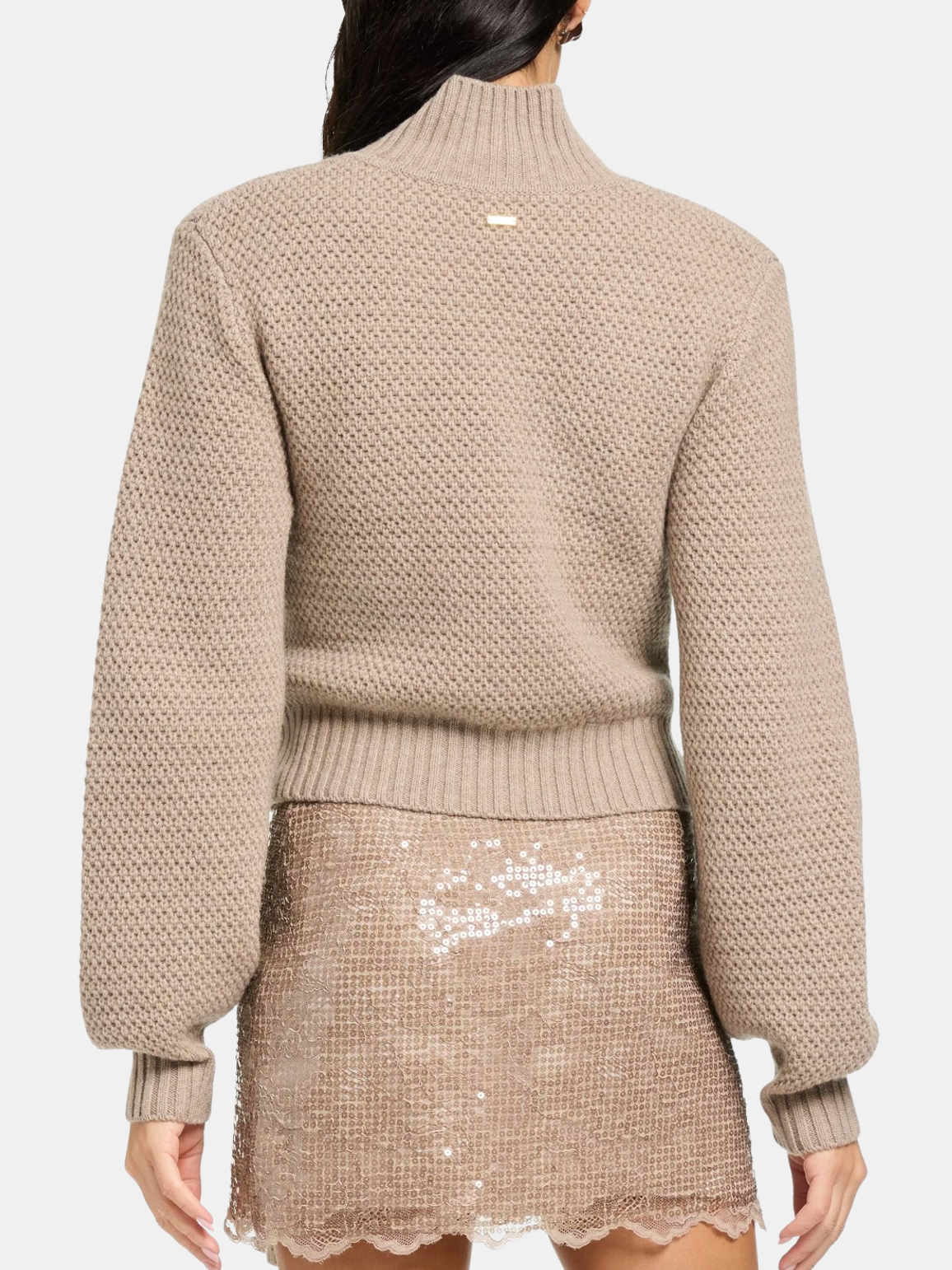 The Aspen is a mock-neck pullover sweater crafted from a soft cashmere blend, featuring a tie-front detail and subtly puffed sleeves. Feminine and refined, it brings a touch of romance to everyday dressing. Pair it with high-rise denim or a sleek skirt for effortless sophistication. Shown in Mocha.