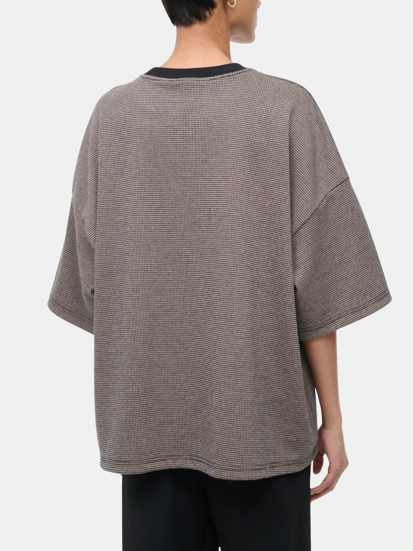 An oversized crewneck shirt in our ponte fabric with a rib neck trim. The Capsule Top is a perfect travel day essential. Shown in Houndstooth.