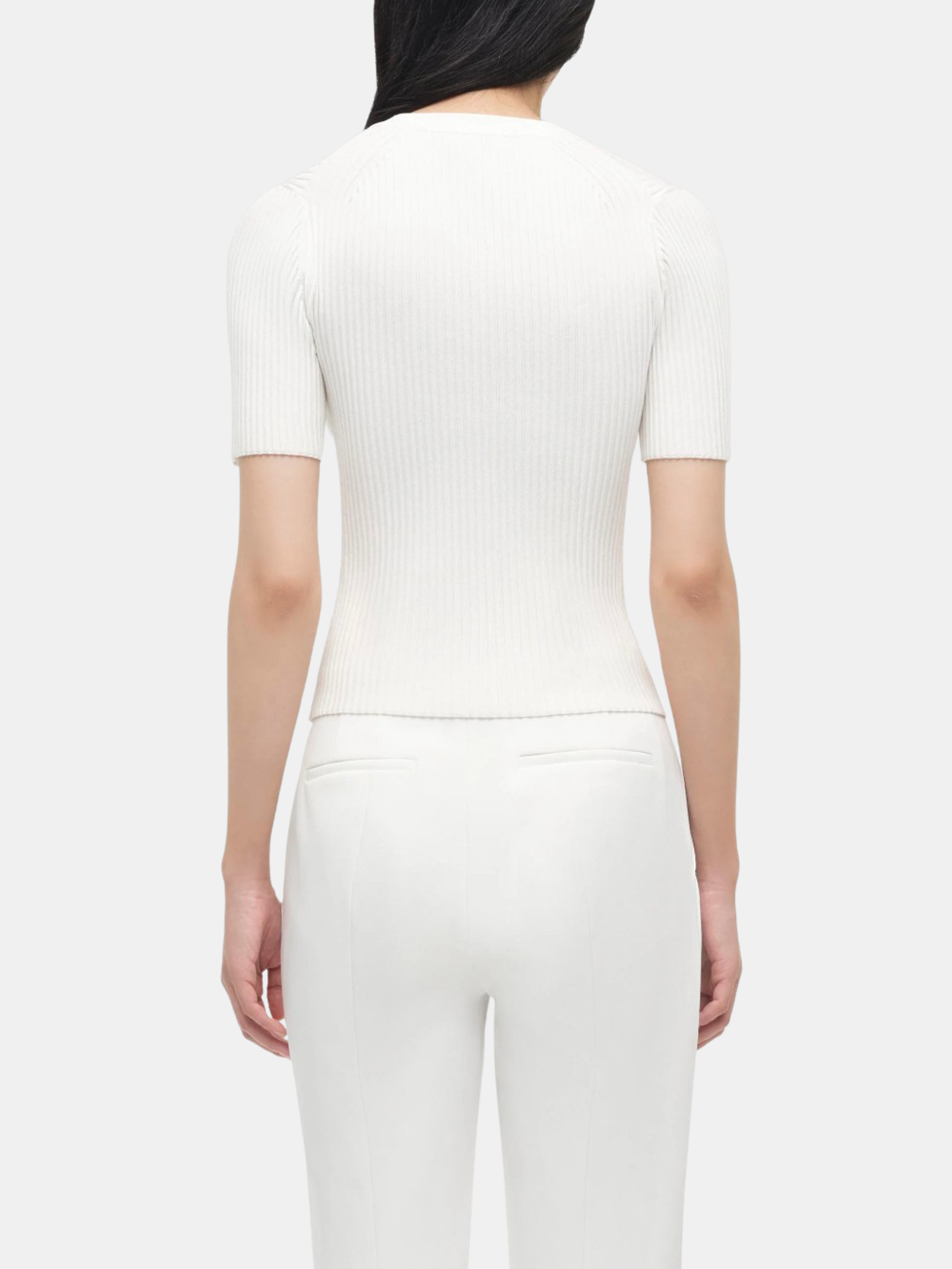 Crafted from a dense rib knit that molds smoothly to the form, this short-sleeve top features a clean open neckline with a minimalist placket detail. Streamlined and versatile, it brings quiet structure to everyday dressing. Shown in Black and Ivory.