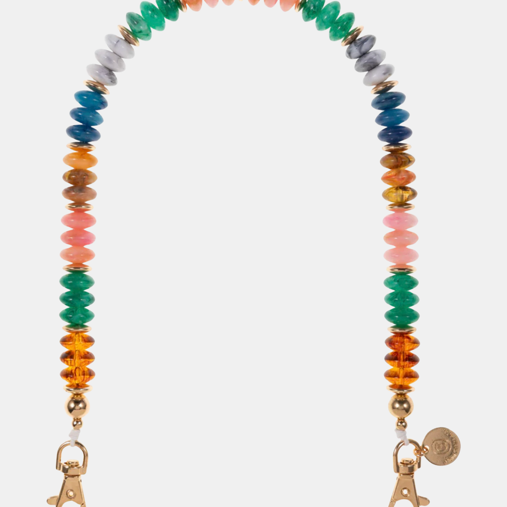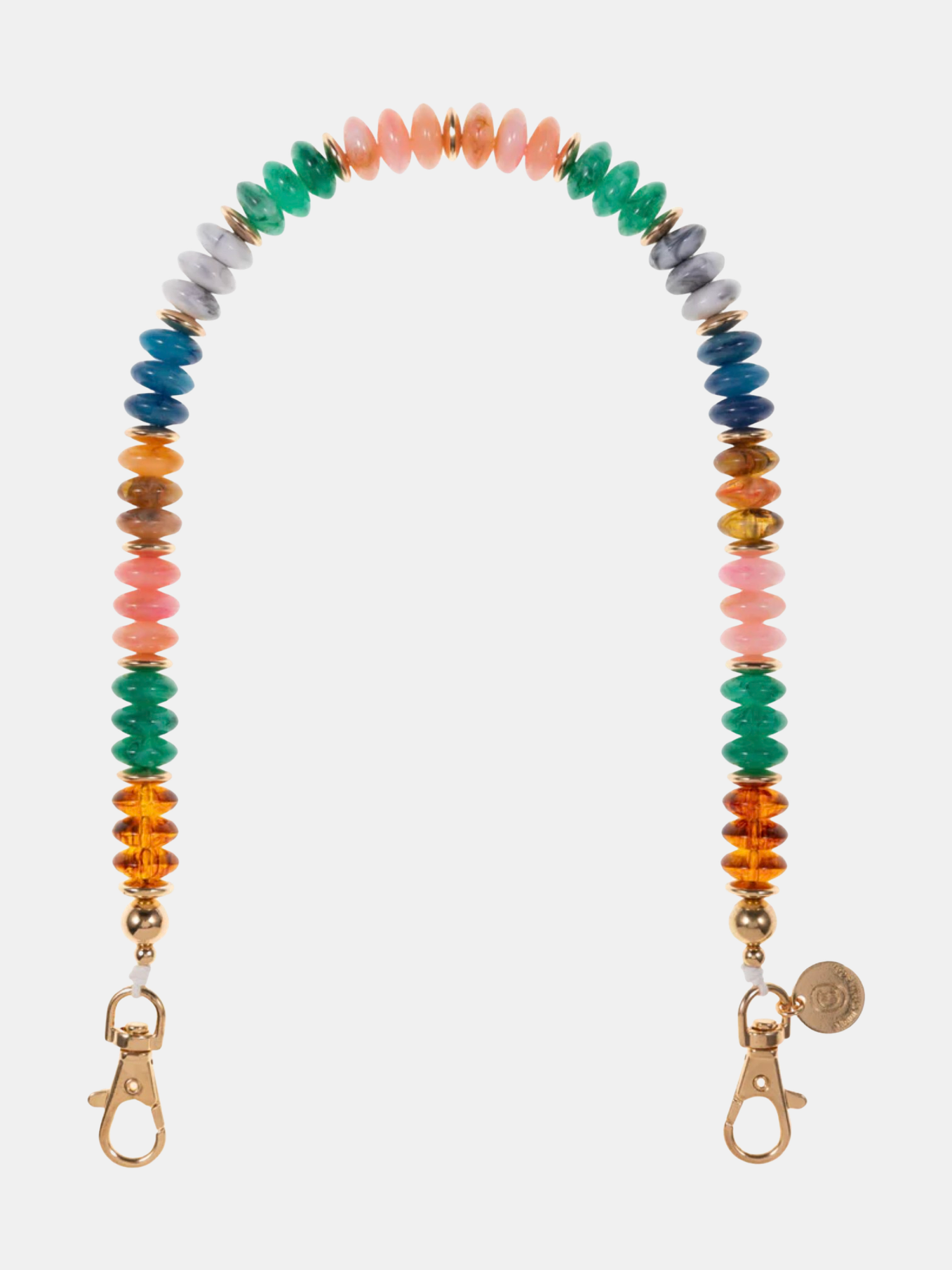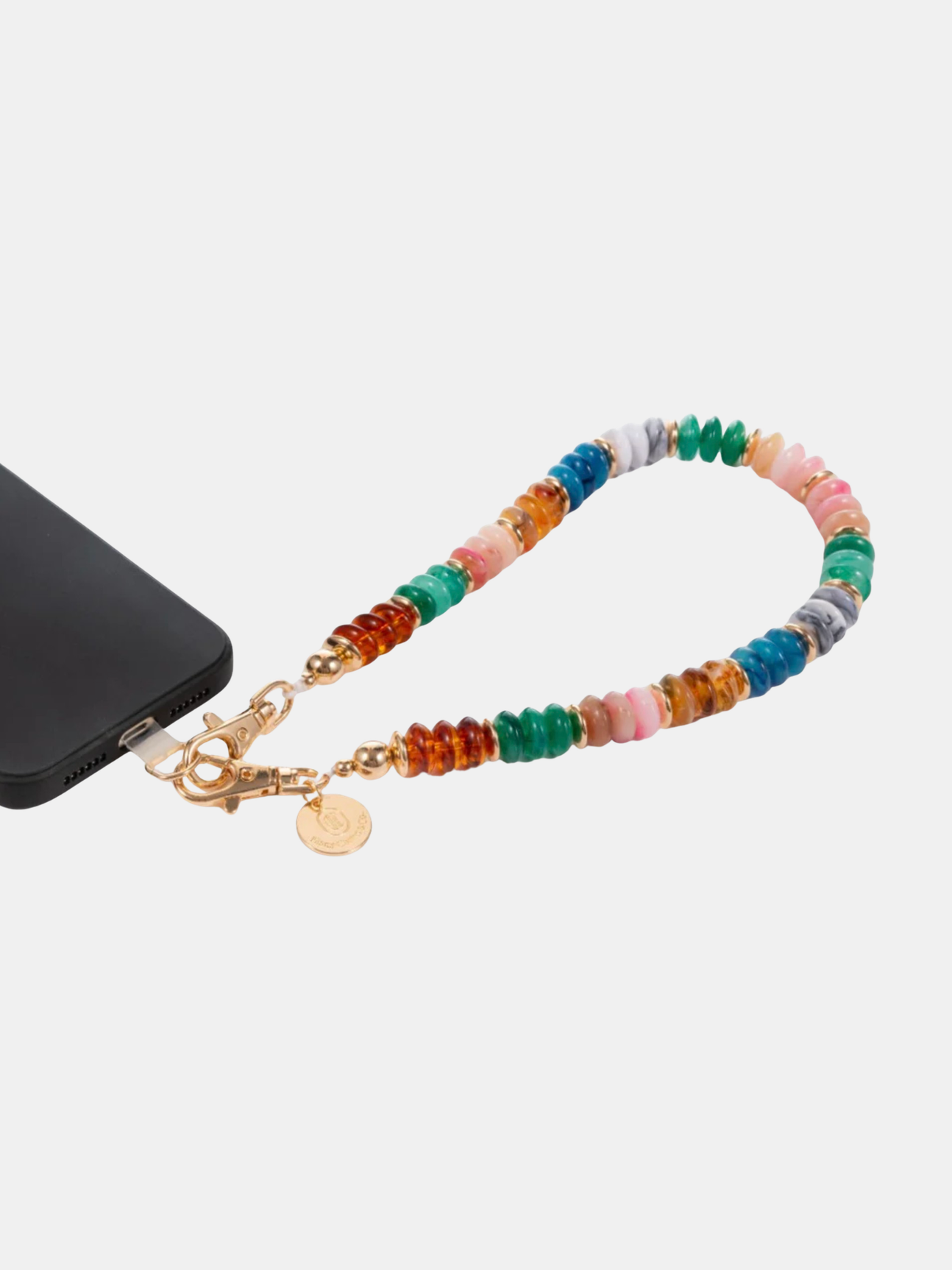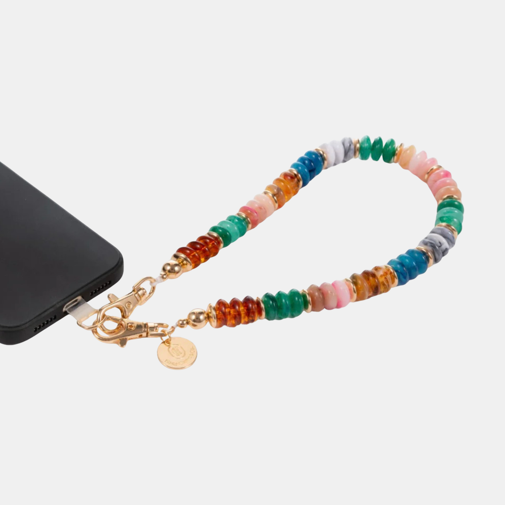 Convenient, stylish, lightweight, and durable. This phone wristlet features 14K gold plated disc beads. Turn your phone into a wearable accessory that keeps you hands-free... think of it as a bracelet for your cell phone! Shown in Pinky Promise, Amalfi, and Desert Disco.