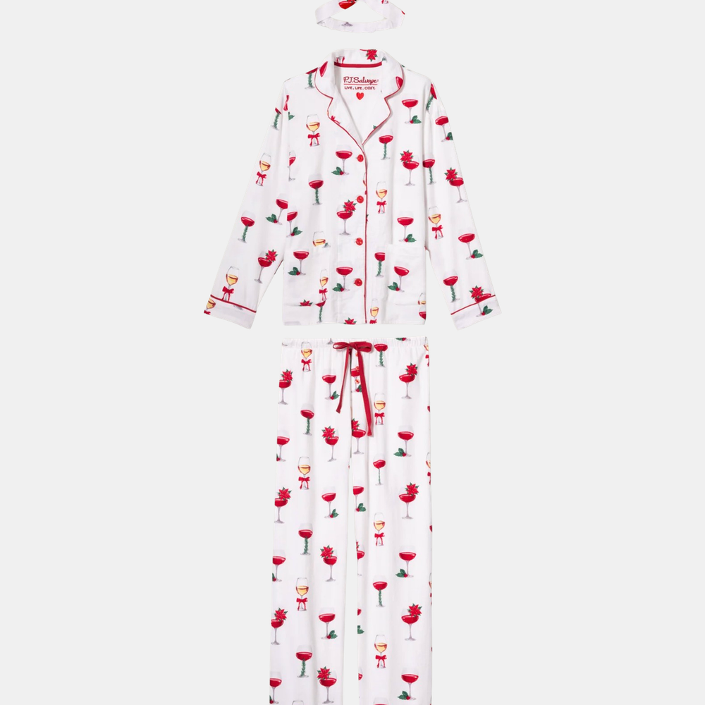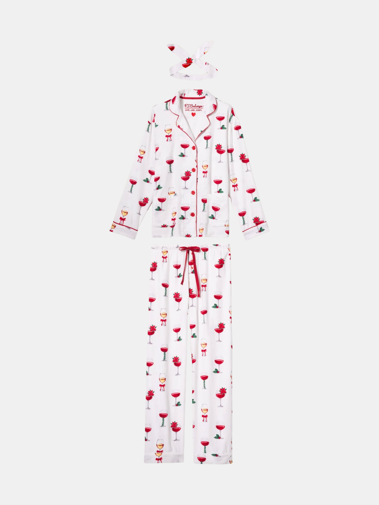 Raise a glass to cozy season in this ivory cotton flannel pajama set, patterned with festive wine glasses topped with poinsettias, bows, and sprigs of holly. This three-piece design includes a button-down top finished with red piping, relaxed drawstring pants, and a matching headband—perfect for holiday happy hours, wrapping marathons, and fireside lounging. Shown in Ivory.