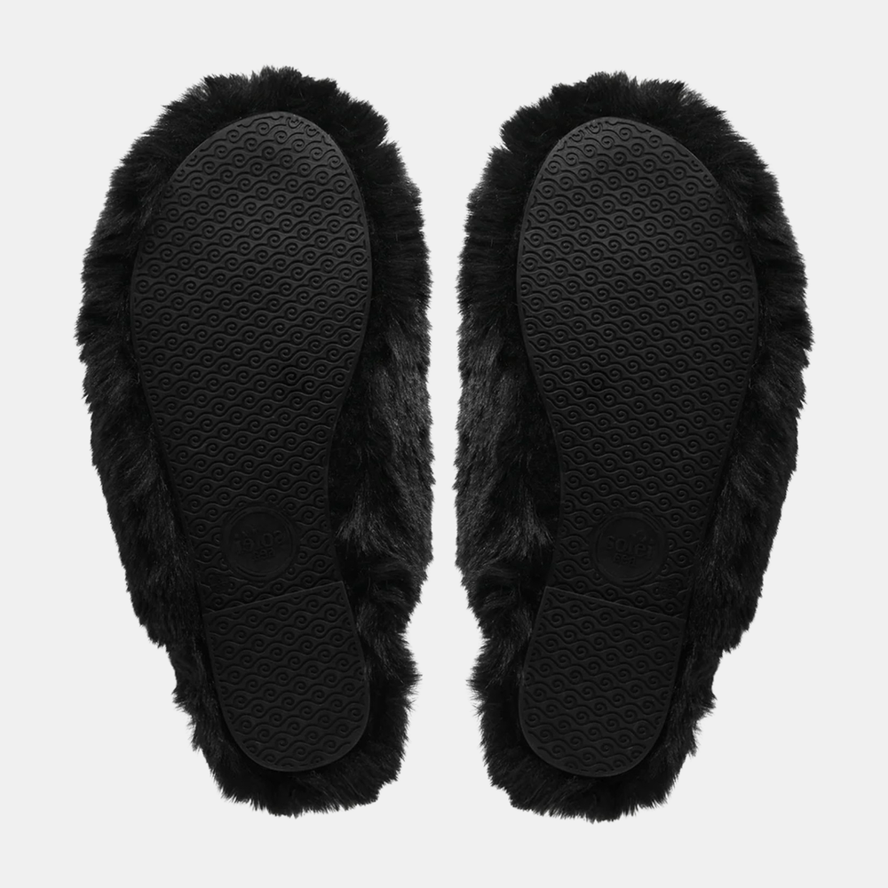 The Wrigley is a true slipper—wrapped in plush faux fur, this slide-on is lush, cozy, and designed for stylish lounging. Equal parts chic and comforting, The Wrigley surrounds your feet in warmth and brings a touch of fashion to your cozy time. Wrapped in soft faux fur with a non-slip sole, it's the stylish choice for chilly, slow mornings and cozy, comfortable evenings. Shown in Black.