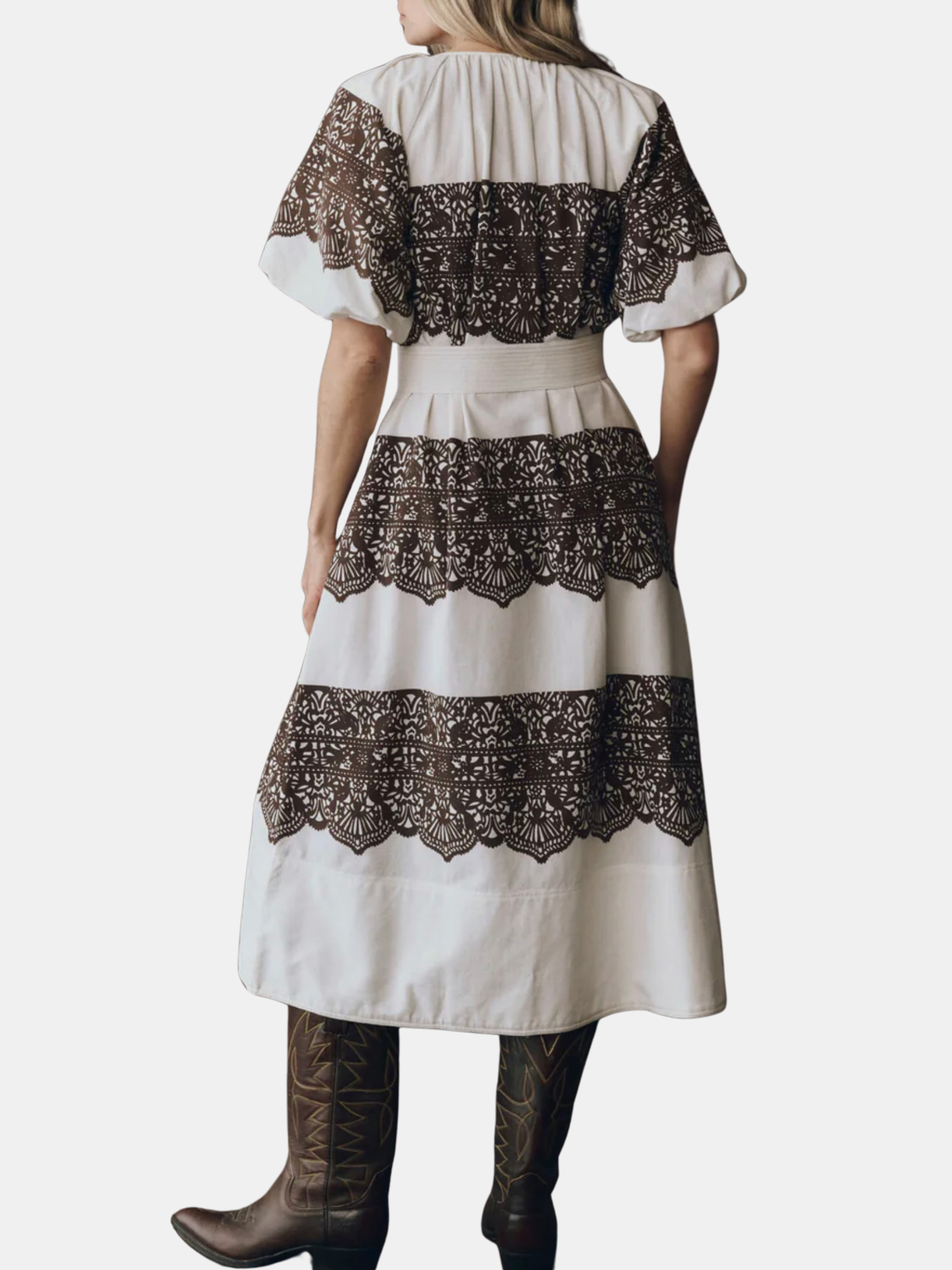 An easy pullover silhouette, The Fairground Dress has a scooped neckline with a deep slit, puffed sleeves lined for structure, and a hem that falls just below the calf. A separate belt lets you define the waist, or leave it relaxed. The western lace print is applied along the cotton surface for a vintage feel with a graphic edge. Shown in Cream.