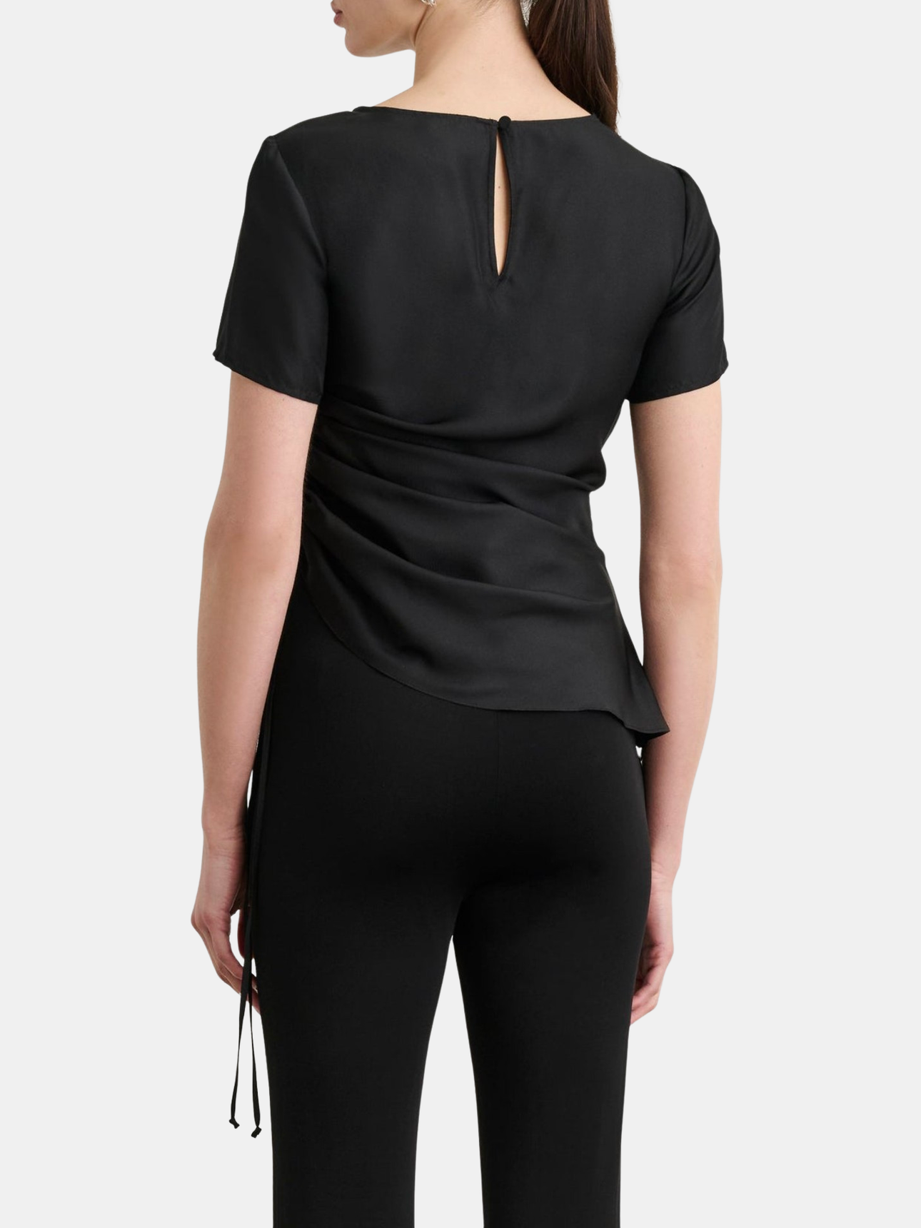 The Uma Short Sleeve Top with Drawstring Detail is a short sleeve boat-neck top with ruched shaping and an asymmetrical drawstring detail for a sleek, sculpted finish. Style it with high-rise trousers and heels for an elevated look, or pair it with denim for effortless everyday polish. Shown in Jet.