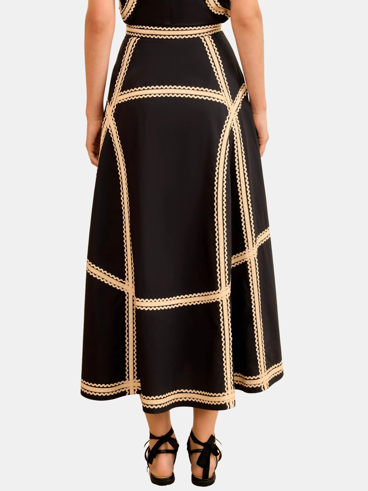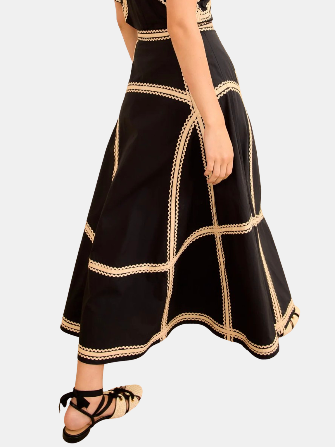 The Norah Skirt is made from signature water-washed poplin that’s re-envisioned with intricate ric-rac and grosgrain ribbons. Alive in texture and depth, this black skirt has a timeless A-line cut with graceful volume at the flared hem. Shown in Noir.