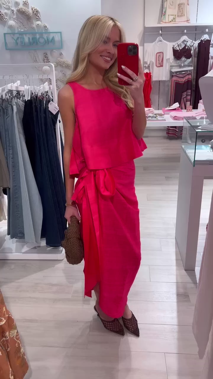 A scoop neck style that is ultra flattering with center back keyhole and self-covered flat button detail. Encased elastic at underarm with pleated panel that adds volume in the perfect way! Making this a voluminous style with tons of attitude so its easy to share and wear throughout your body journey. Cropped but not too cropped… the kind of length that grazes your high waisted classic Levis. Deep hem that can be let out if you so choose! Give her a whirl! Shown in Strawberry.
