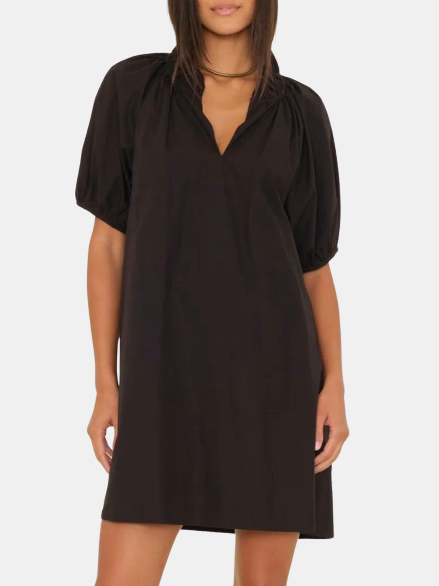 For the Frill of it. Carleigh is made in crisp paper poplin with a refined feel. Carleigh is a femme mini dress featuring a deep V-neck with ruffle detailing, shirred puff sleeves, and side seam pockets. Shown in Black.