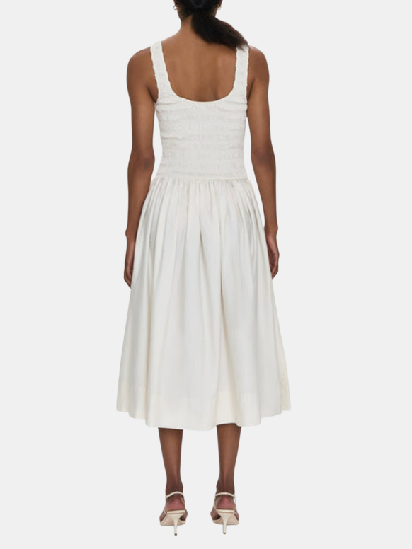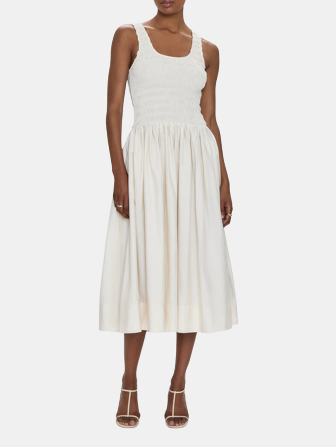 Textured day dress crafted from a lightweight fabrication designed with warm weather in mind. Featuring a smocked tank style bodice that falls into a ruched waistband and a fully proportioned midi skirt. Shown in Shell.
