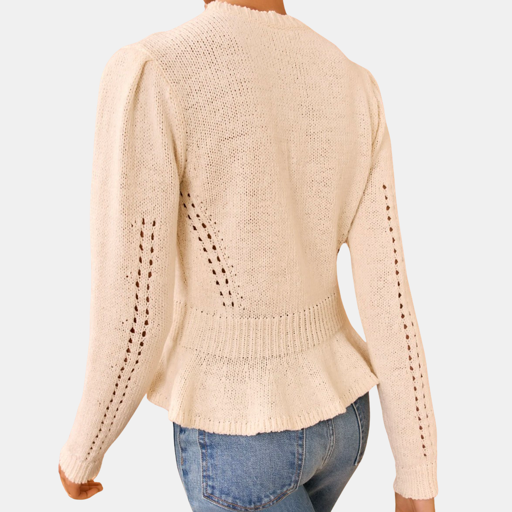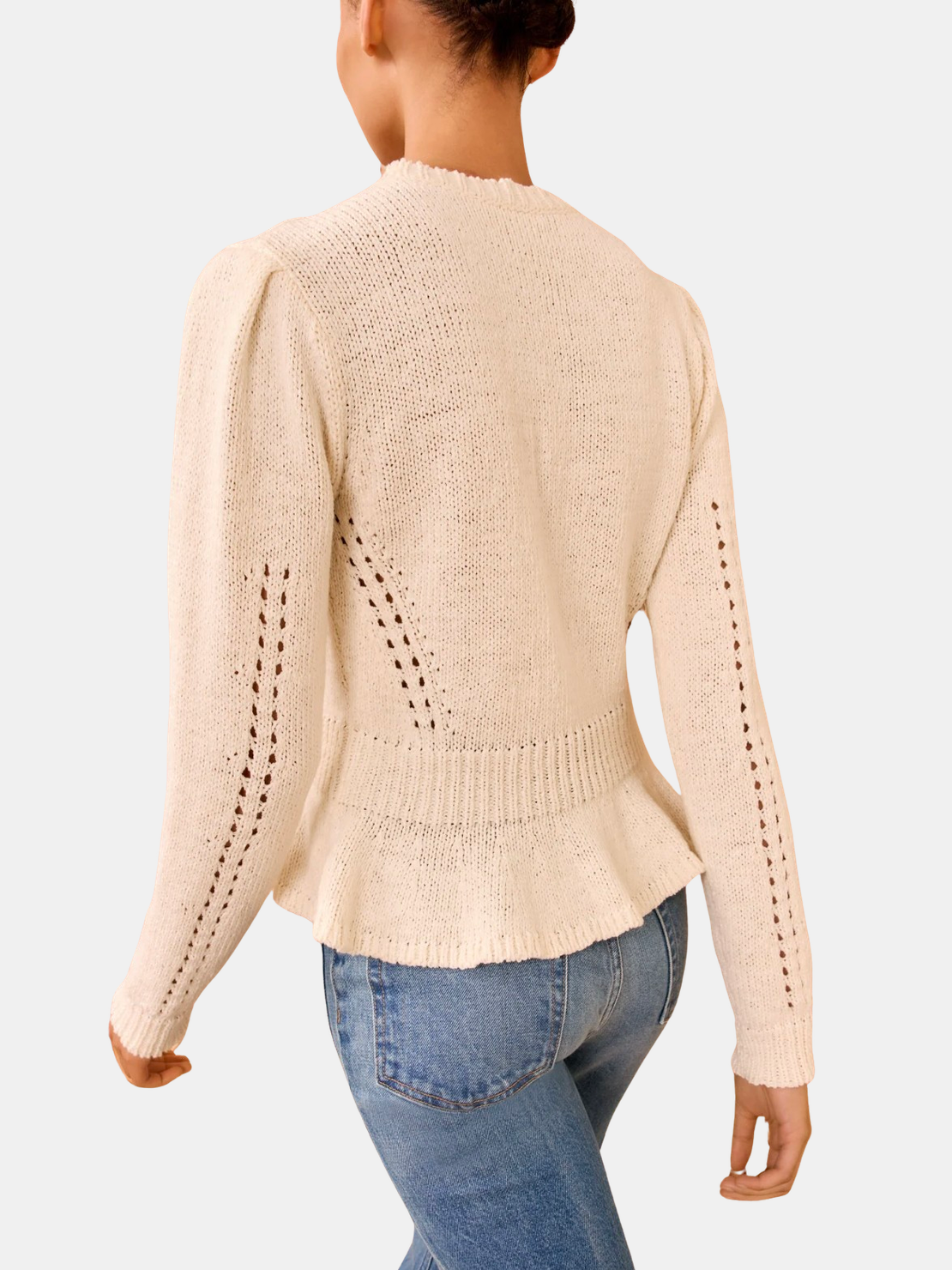 Cozy elegance defines the Aurelie Pullover, knitted from a soft cotton-blend adorned with delicate pointelle trims. This white crewneck has subtly puffed sleeves that are balanced by a flared peplum hem. Shown in Cowrie.