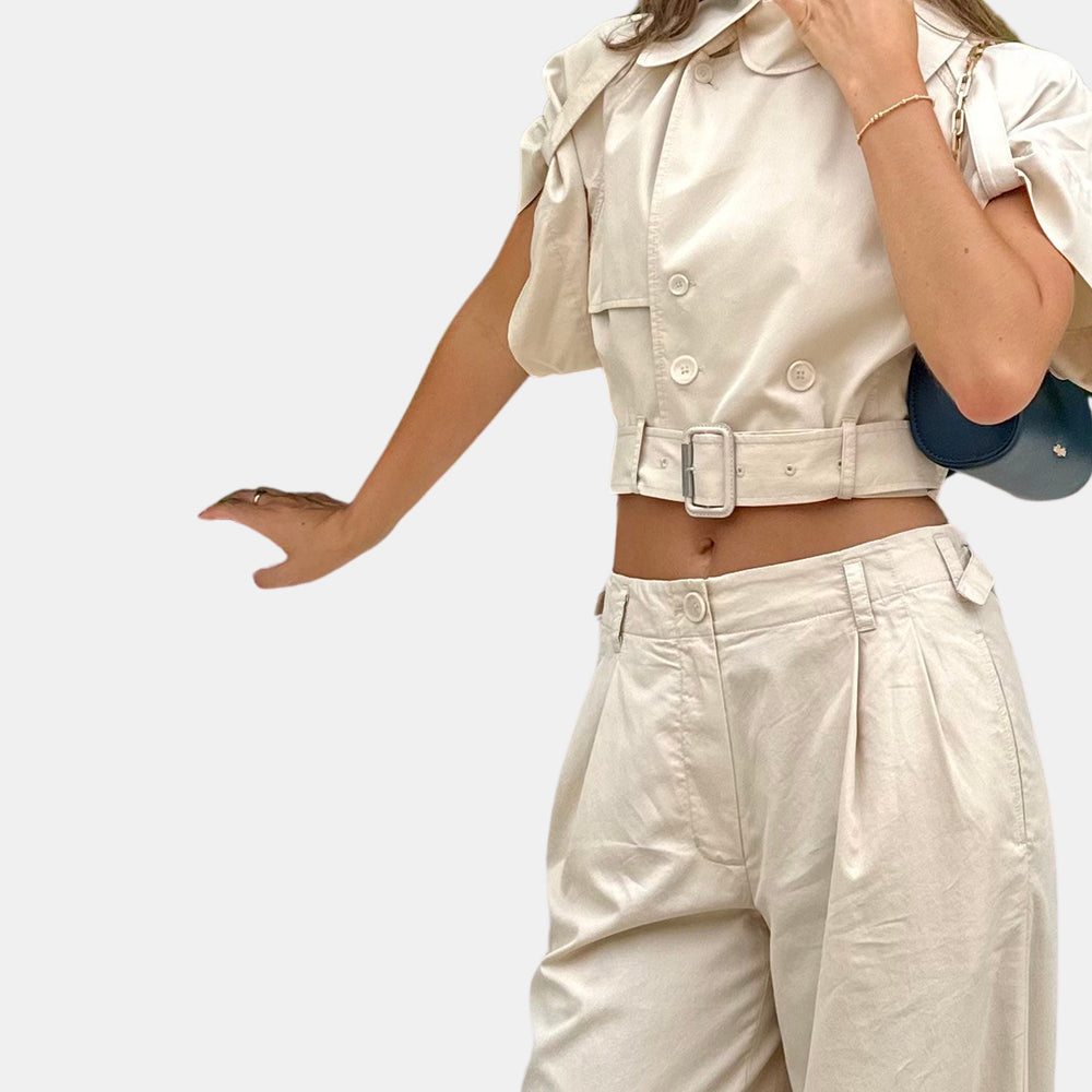 A linen top designed with a utilitarian notch collar and double-breasted closure that features exaggerated armholes and a belted hemline. Pair with the Haydin Wide Leg for a matching look. Shown in Sand.