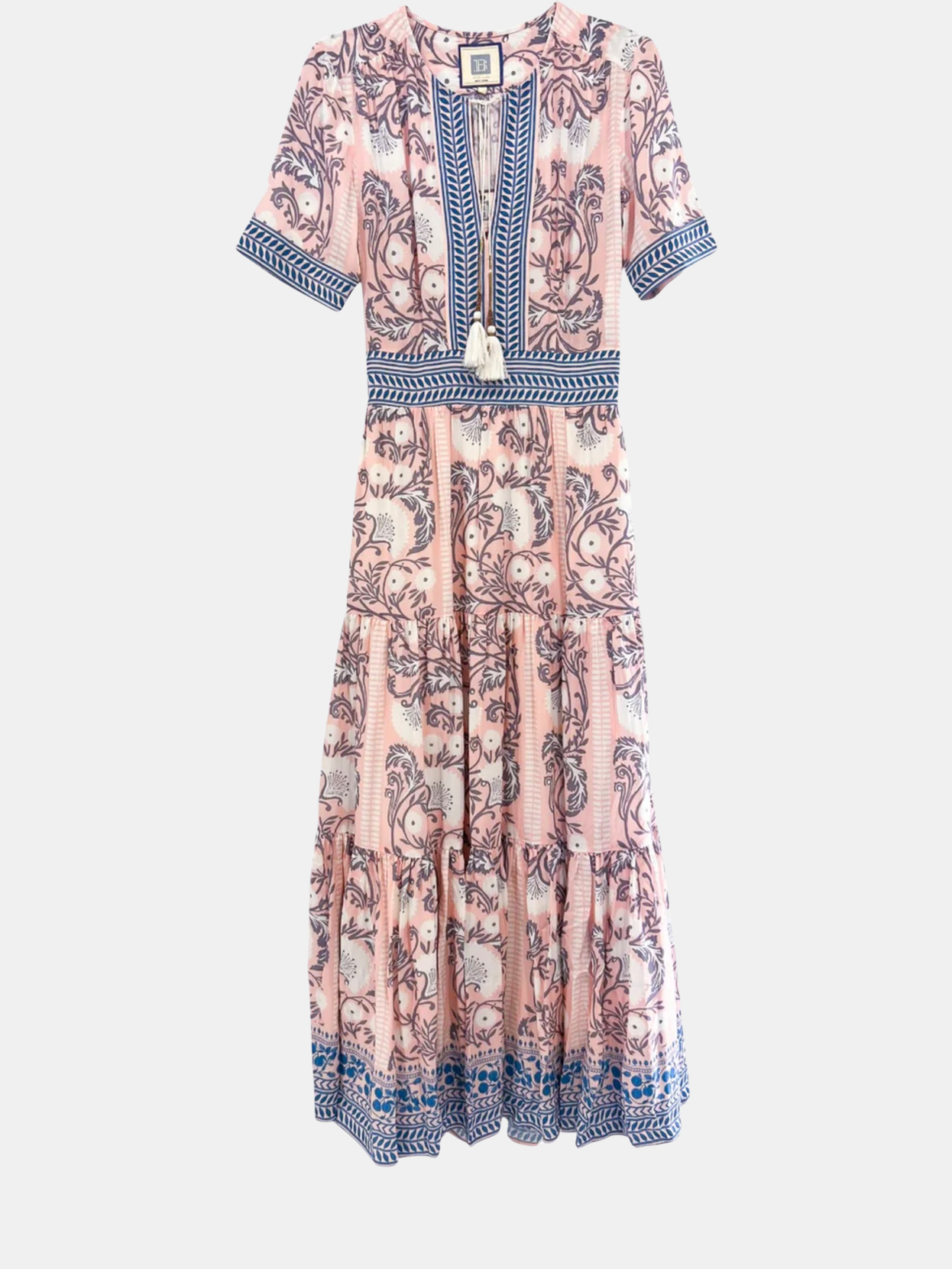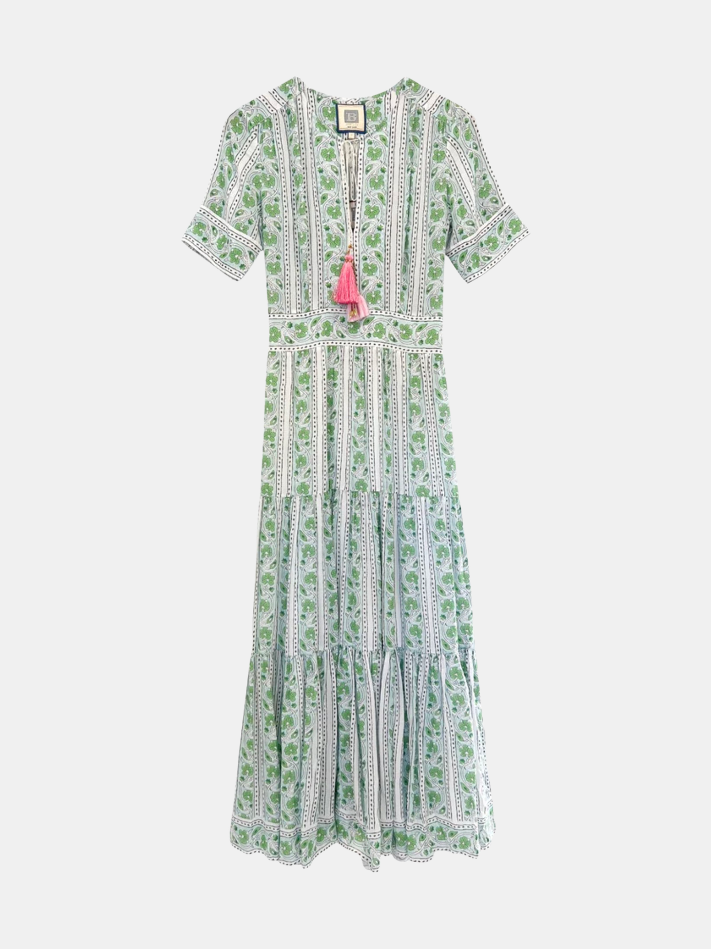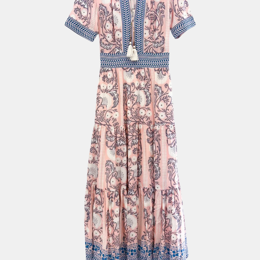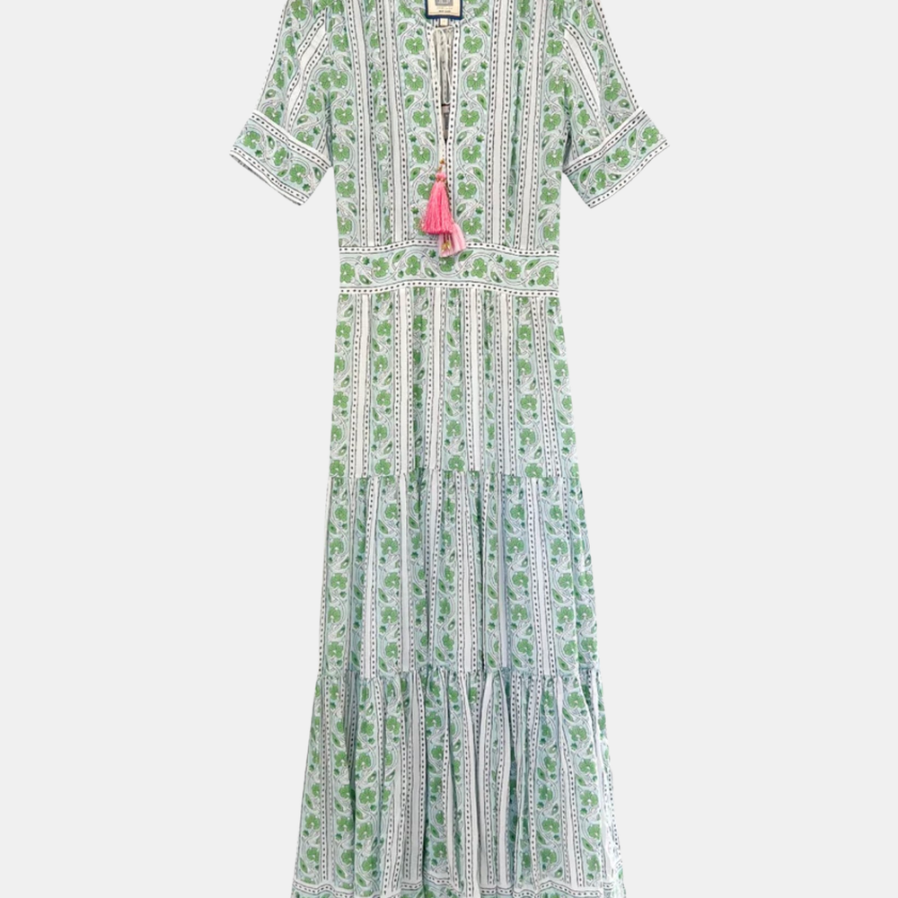 A vibrant short-sleeve maxi dress featuring a fun, eye-catching print and playful tassel detailing. The relaxed fit and bold design make it a perfect choice for a stylish yet comfortable look. Shown in Green Turquoise and Salmon Teal.