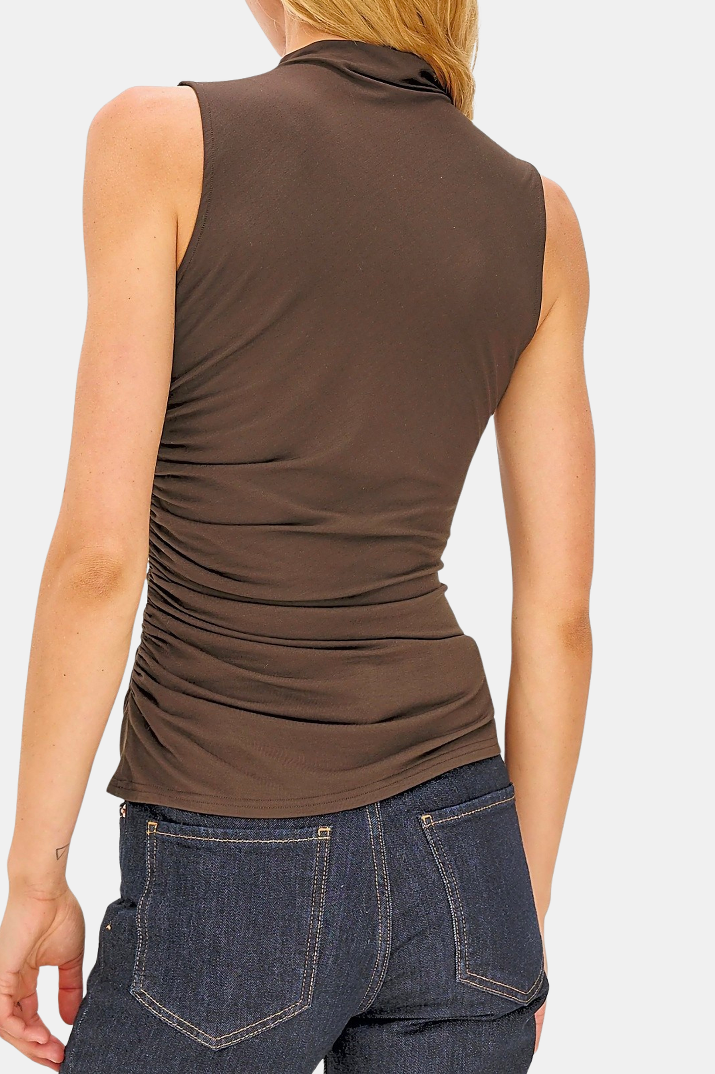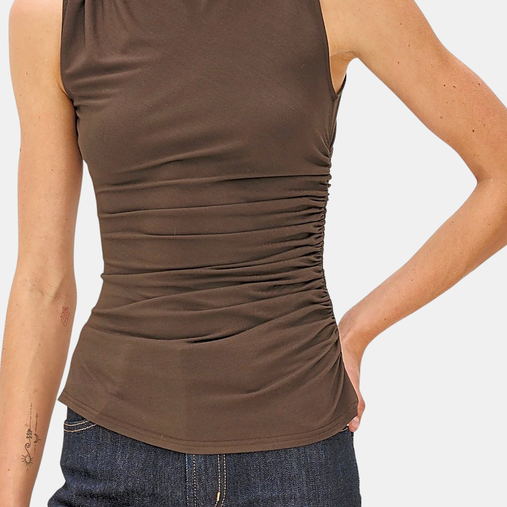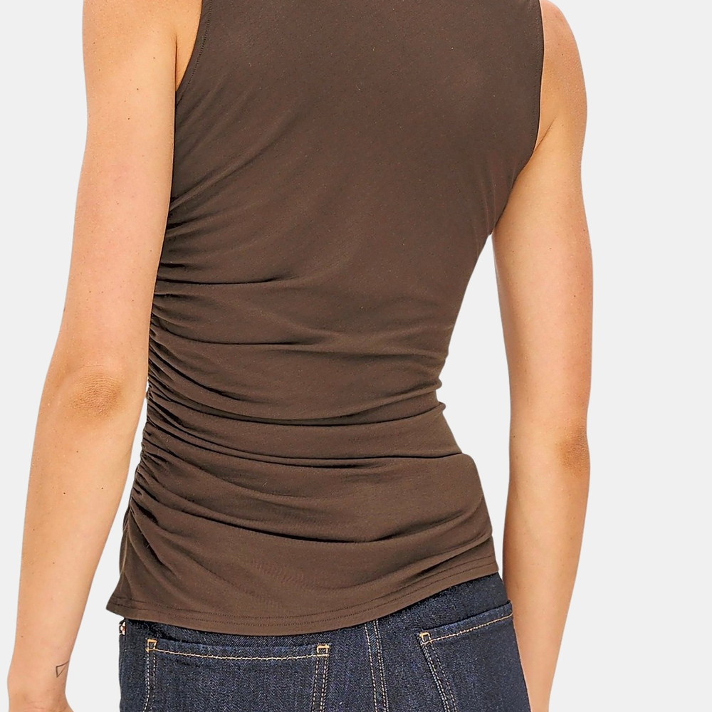Meet your new, favorite season-less tank. Cut from a supple brushed tissue with a mock neck, slight stretch, and light ruching at the seams, the Christen fits and flatters any figure seamlessly. Dress up or down for any occasion, it is a timeless staple. Shown in Espresso and Black.