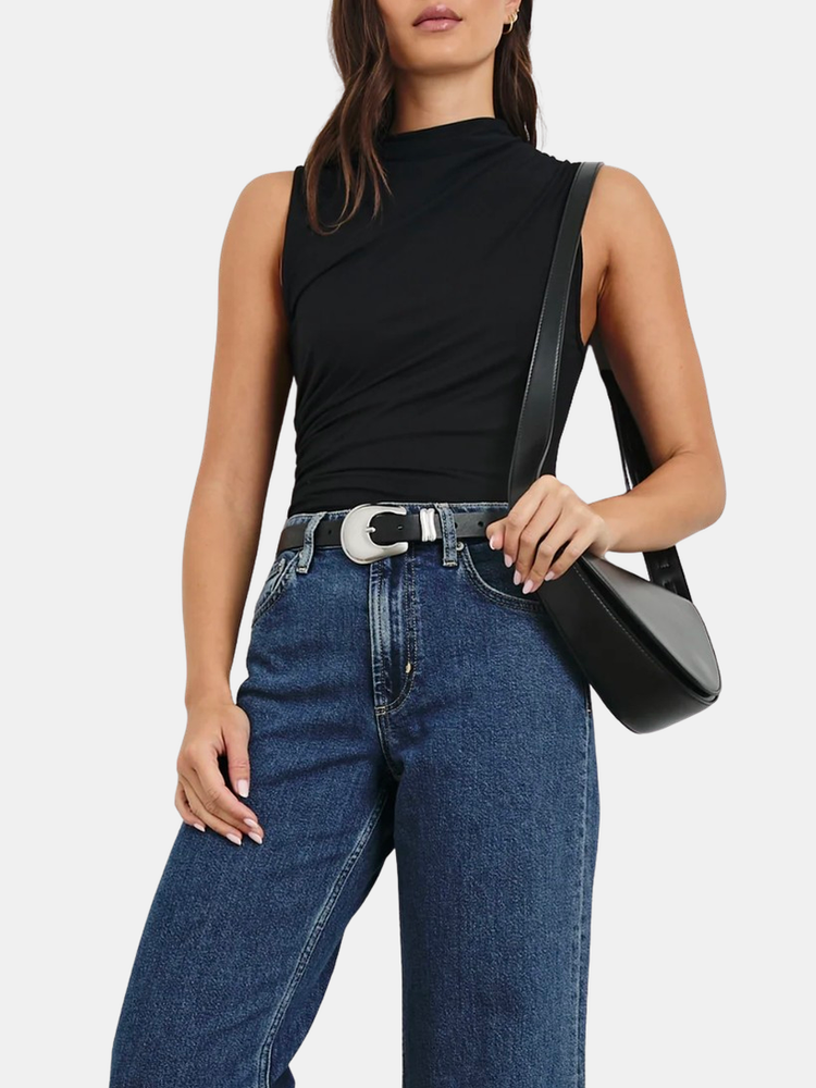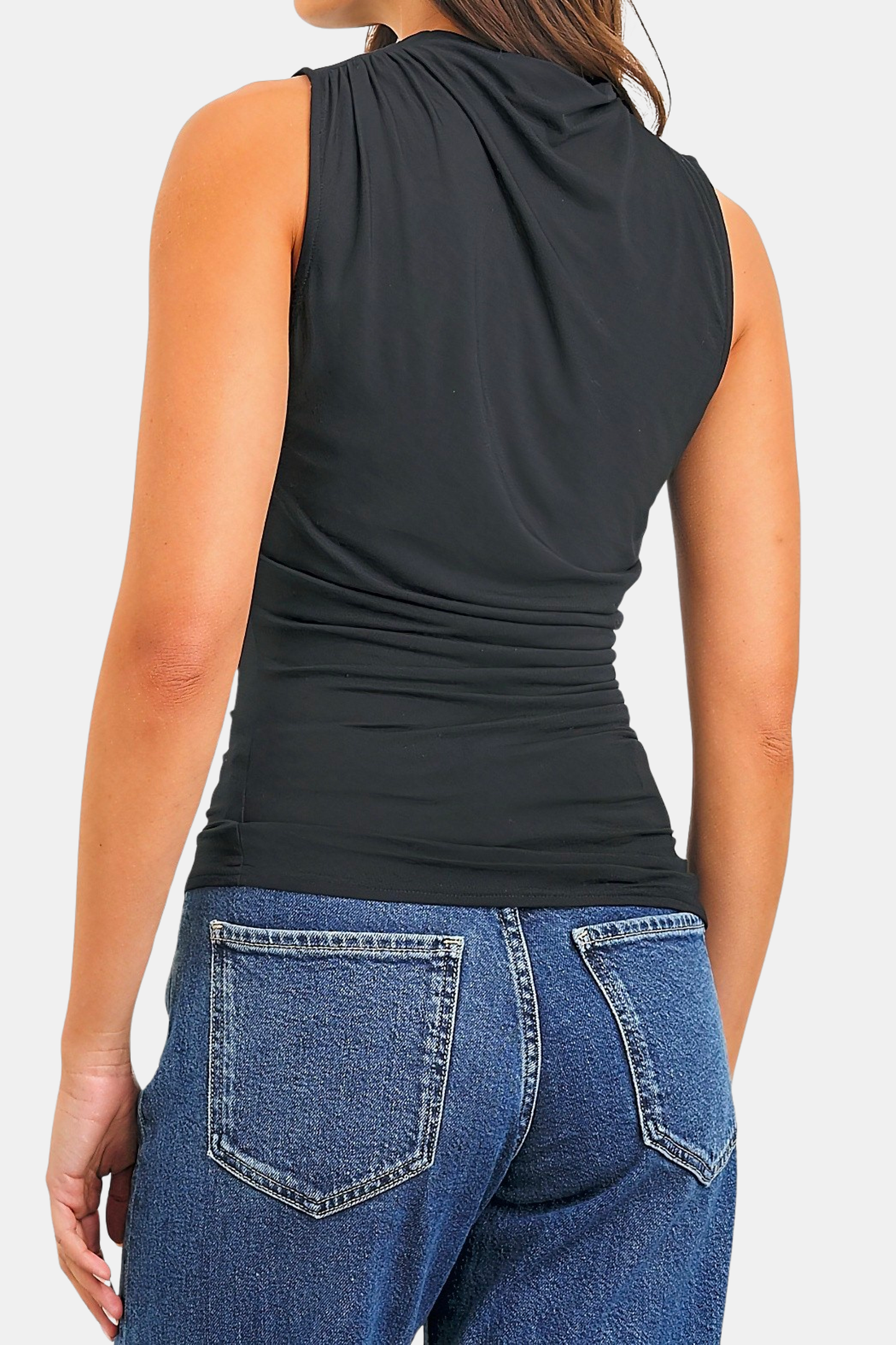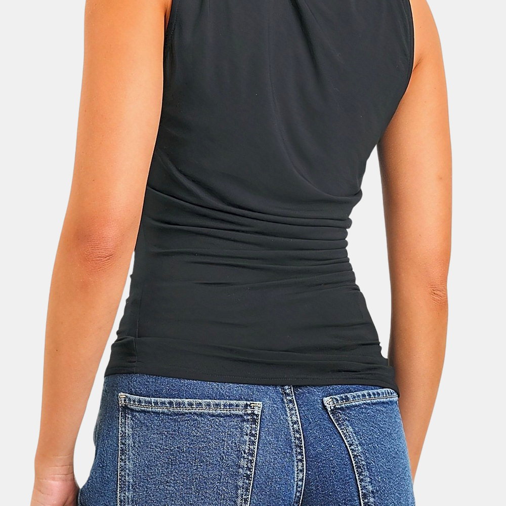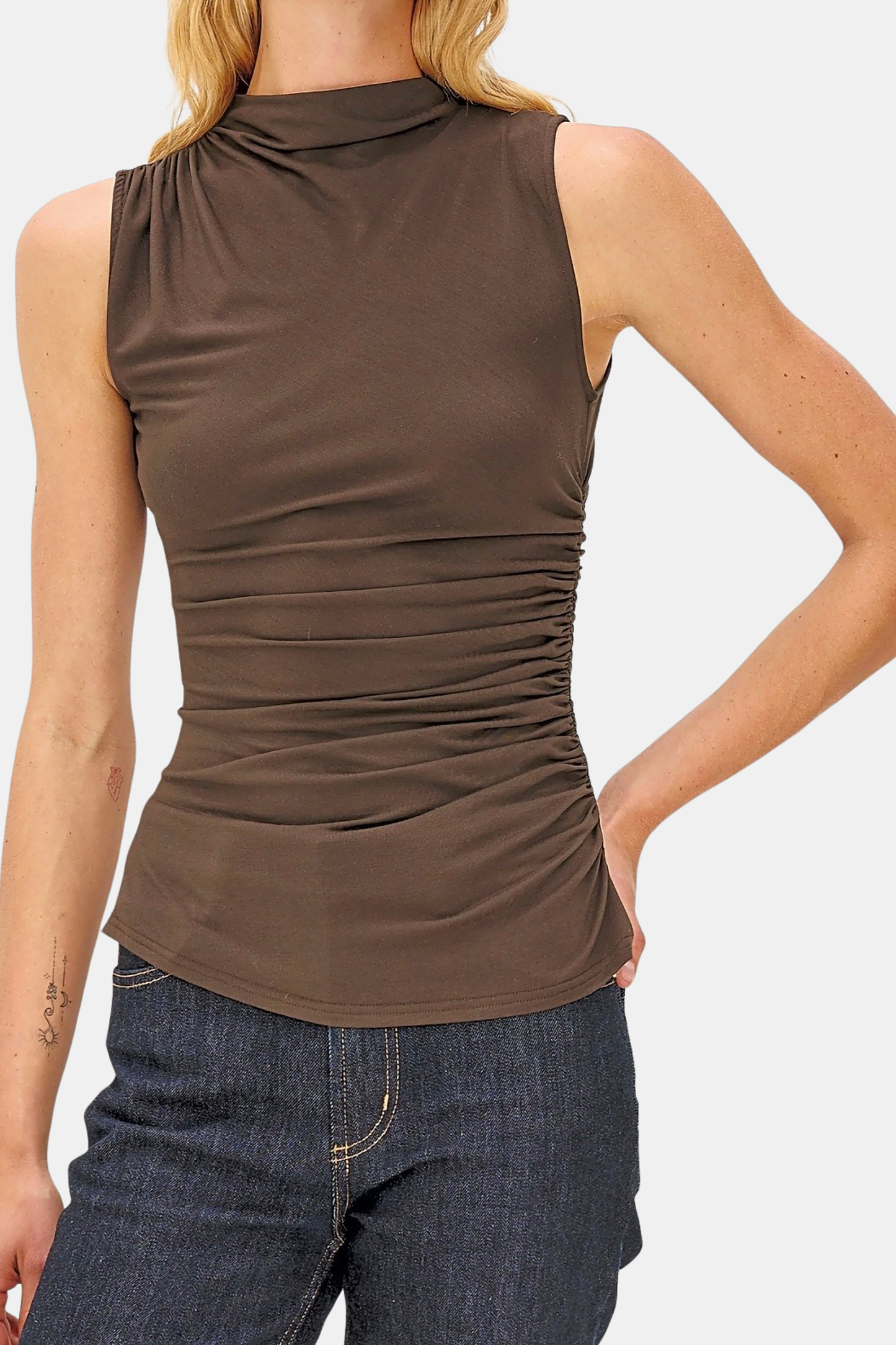 Meet your new, favorite season-less tank. Cut from a supple brushed tissue with a mock neck, slight stretch, and light ruching at the seams, the Christen fits and flatters any figure seamlessly. Dress up or down for any occasion, it is a timeless staple. Shown in Espresso and Black.