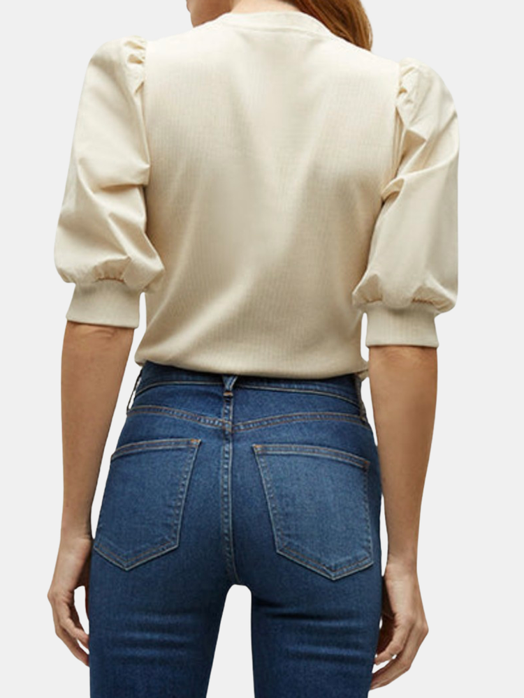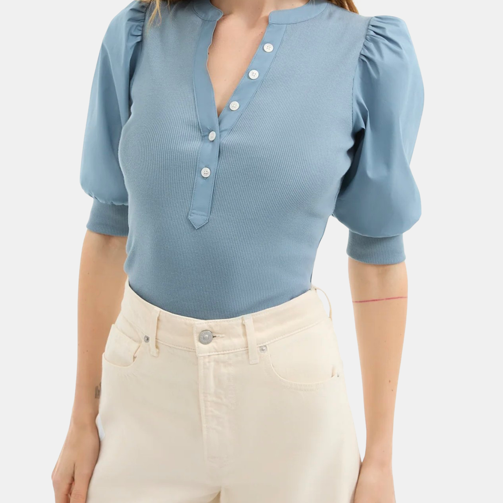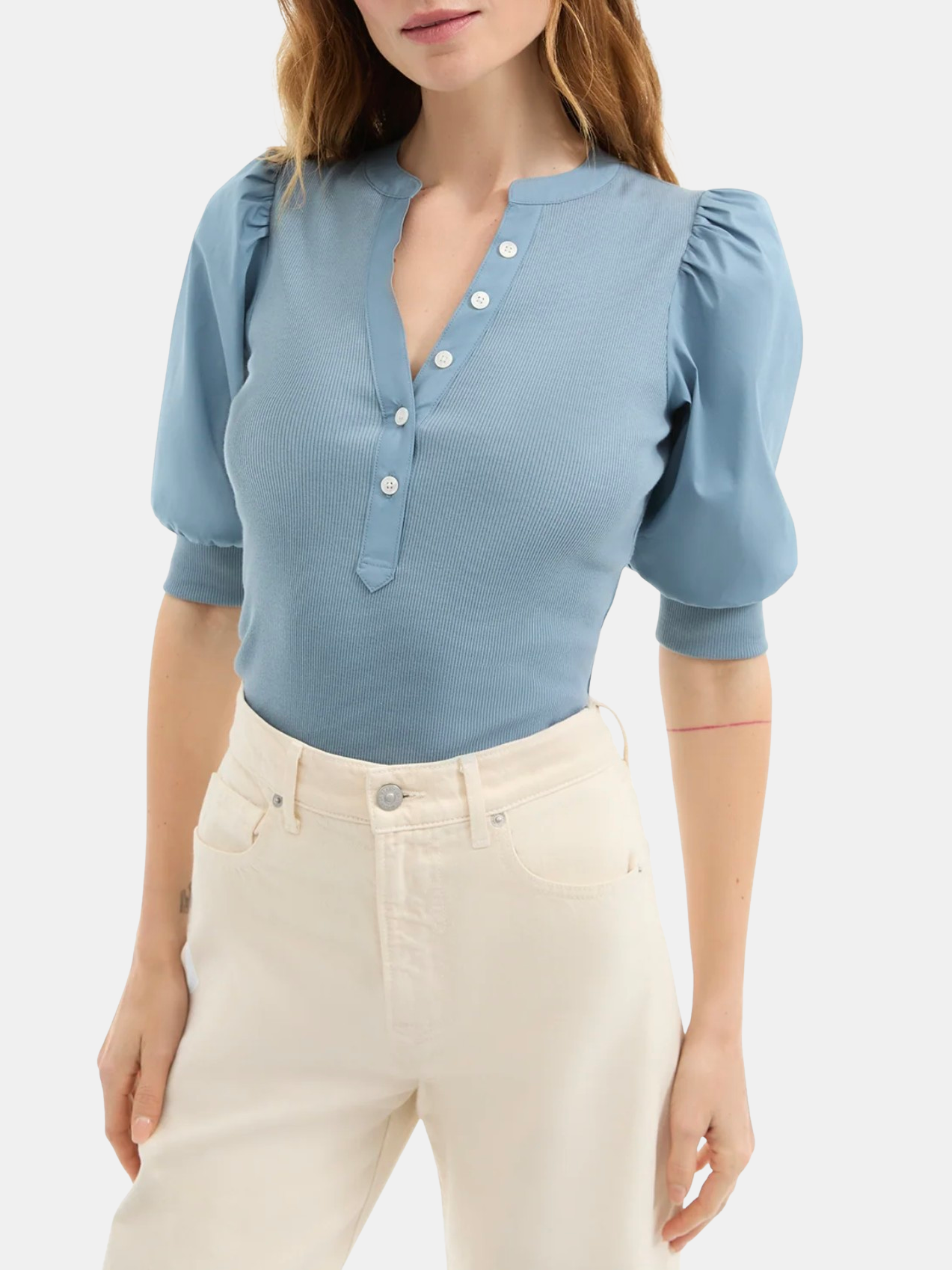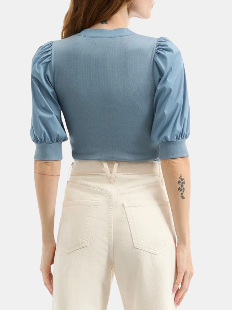 Veronica Beard's Coralee top offers a ribbed construction and complementary poplin puff sleeves. The top also features a band collar, elbow-length puff sleeves, banded cuffs, and a pullover style. Shown in White and Lake Mist.