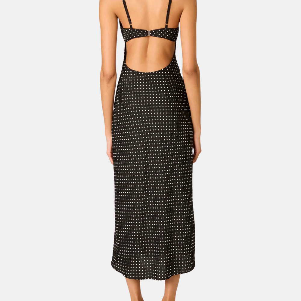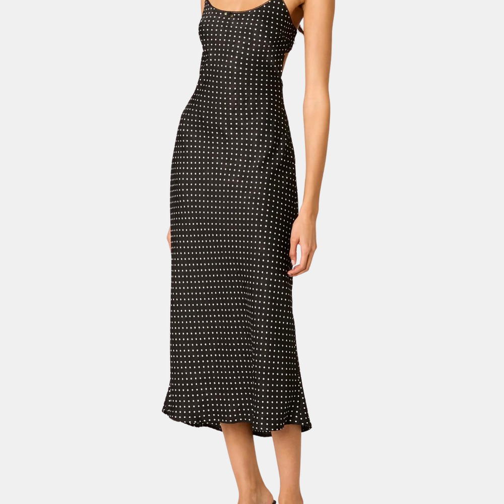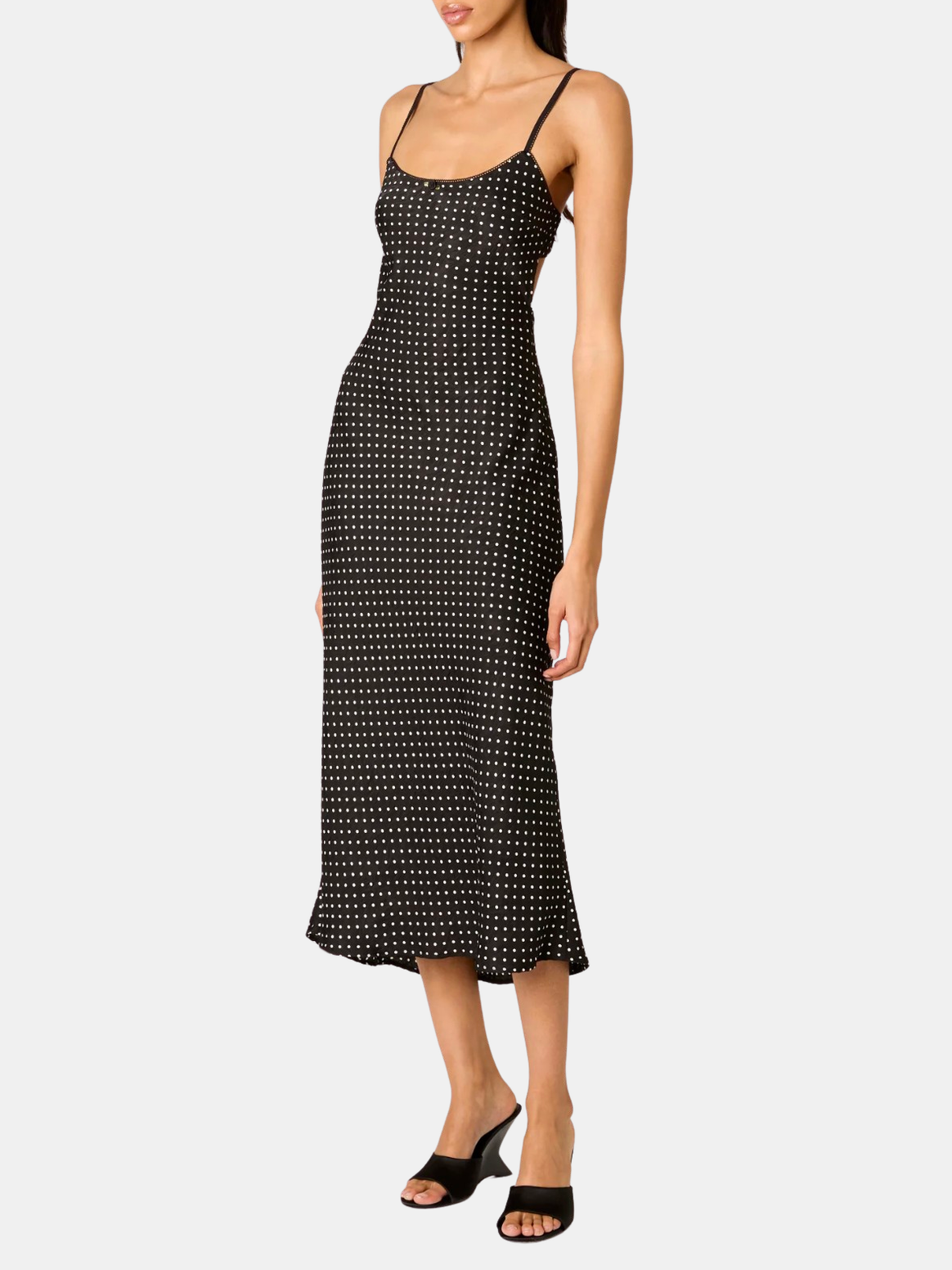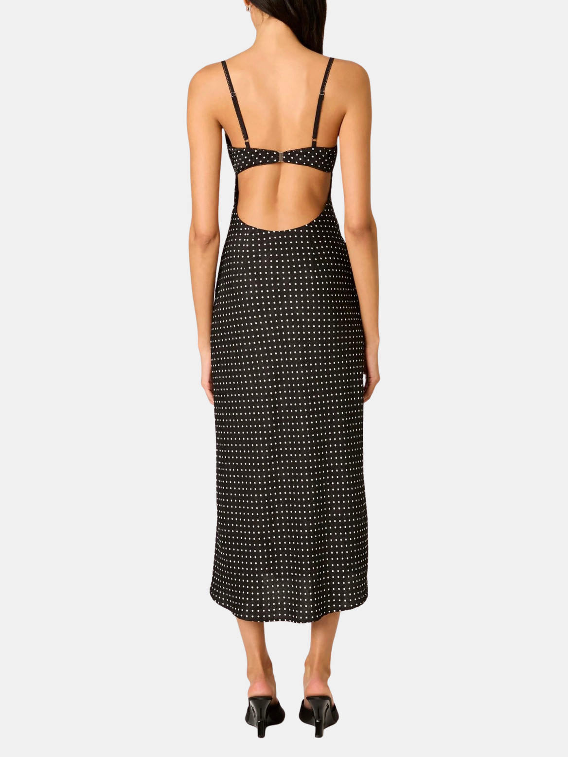 A romantic nod to vintage slip styles, the Doheny Dress is crafted in a dotted chiffon that brings soft texture and playful charm. It features a bias-cut silhouette with a flattering scoop neckline, delicate lace trim, and a dainty bow accent at the bust. Fitted through the hips, the skirt gently releases into a subtle flared hem for graceful movement. Adjustable contrast straps cross over an open back, with a supportive band and center back zipper for a tailored fit. Shown in Black.