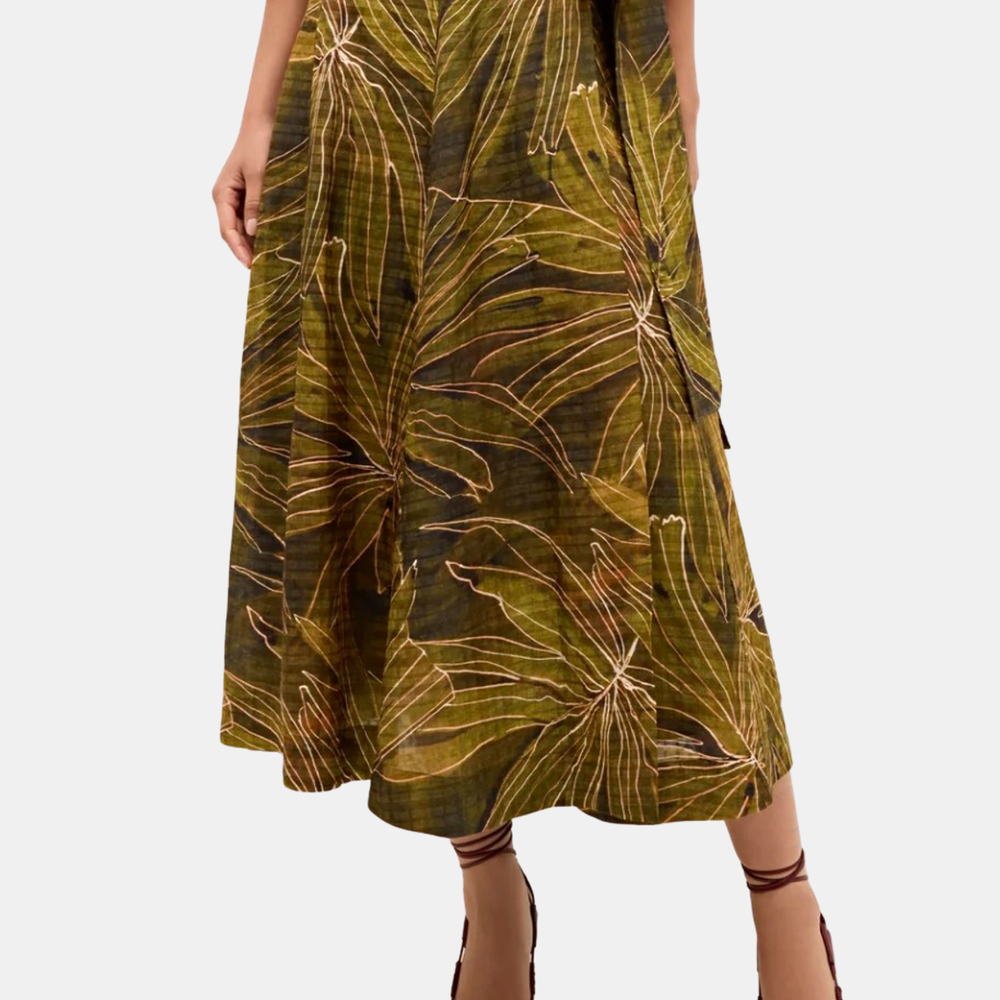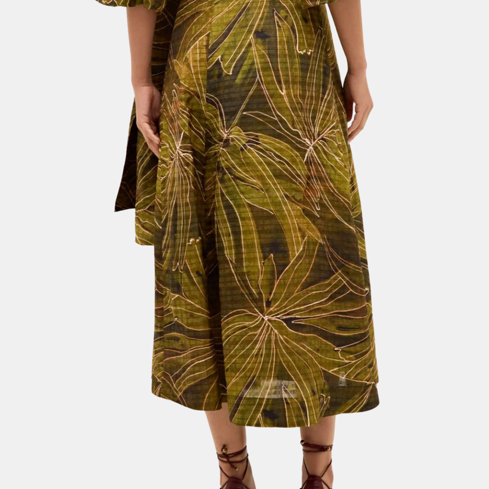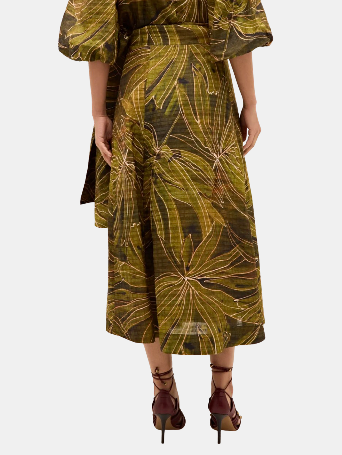 Universally flattering, the signature Estine Wrap Skirt is a perennial favorite. This season, a moody olive palm motif lends an earthy edge to the classic silhouette, finished with adjustable sash ties that can be knotted or looped into a statement bow. Style it with the matching Harly Top. Shown in Canopy.