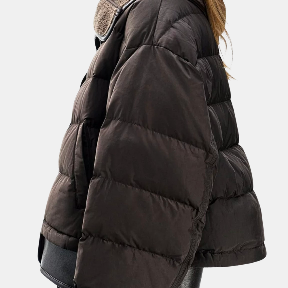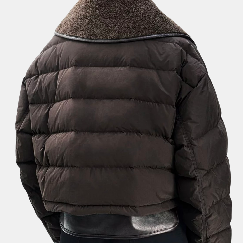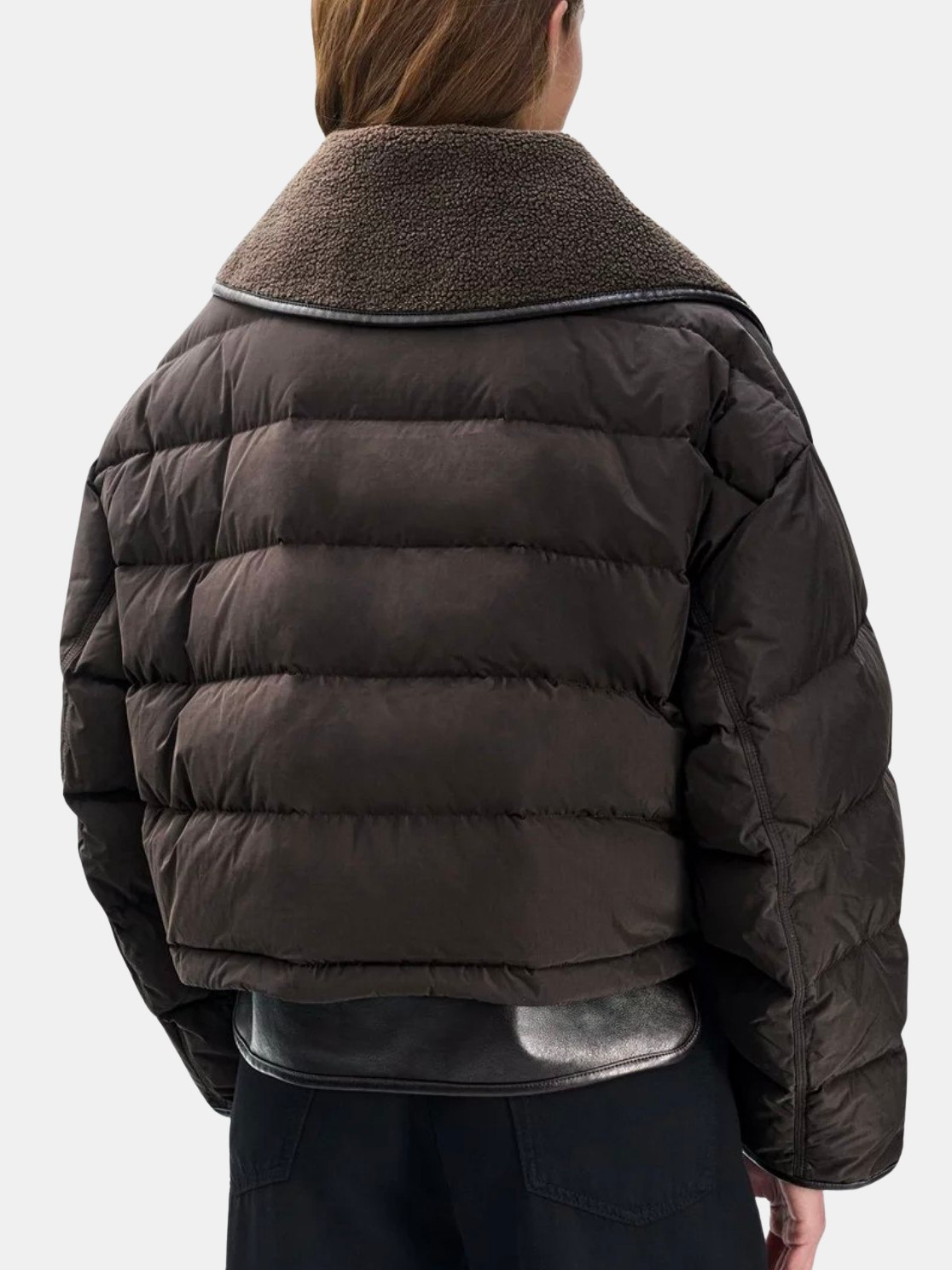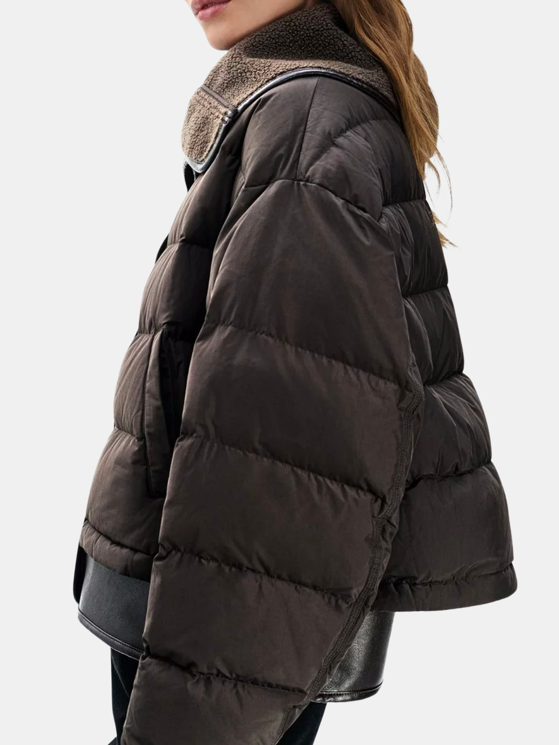 Your new favorite puffer. This essential cold-weather jacket plays with texture and dimension to create intrigue, like an oversized sherpa-lined collar and faux leather trim throughout. Down filling and an elastic hem ensures a cozy, comfortable fit when you're buttoned up. Shown in Brown.