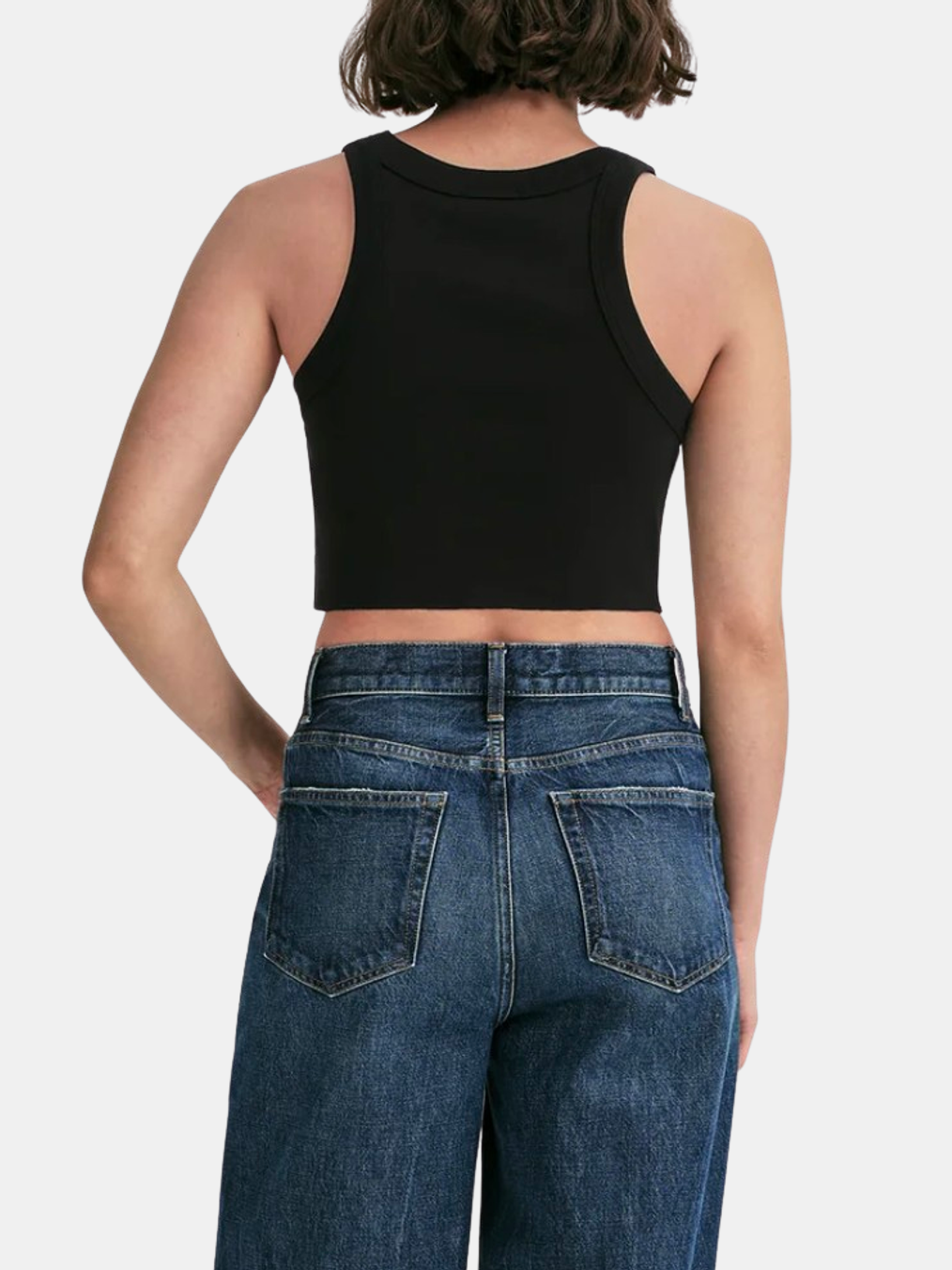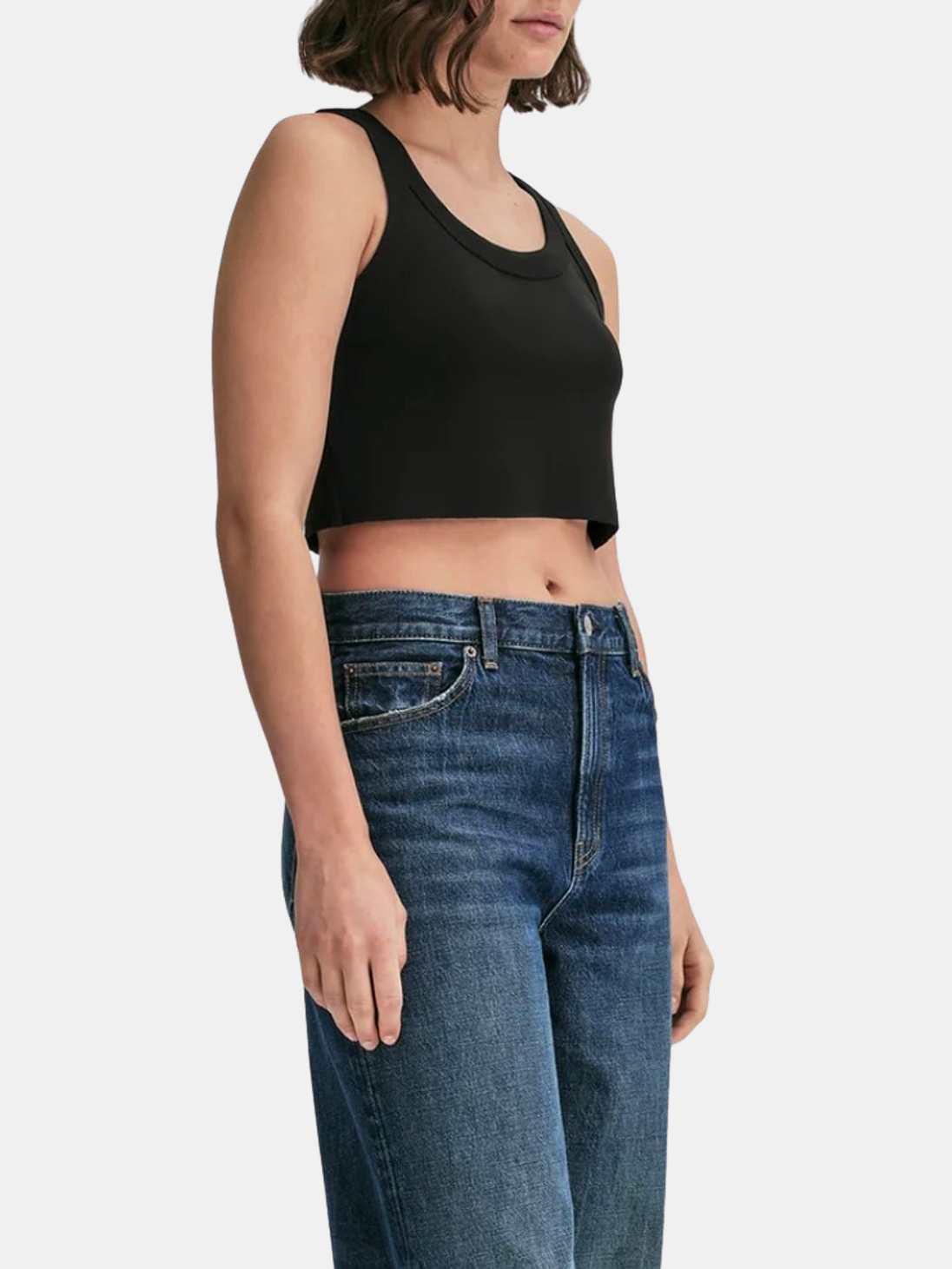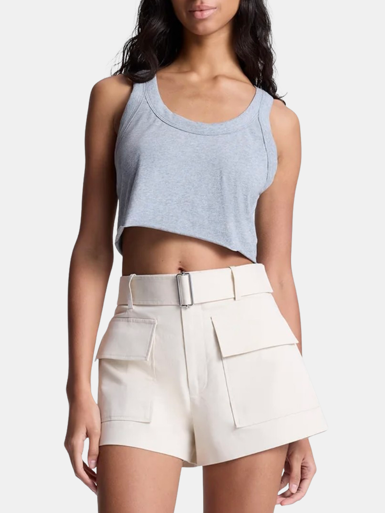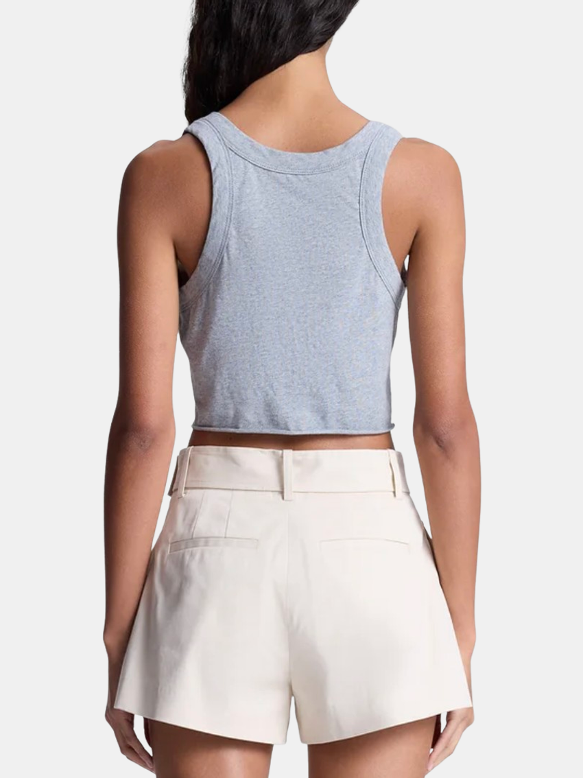 The Halsey Tank by ALC features a scoop neckline, thick straps, and a raw hemline. Shown in White, Grey Melange, and Black.