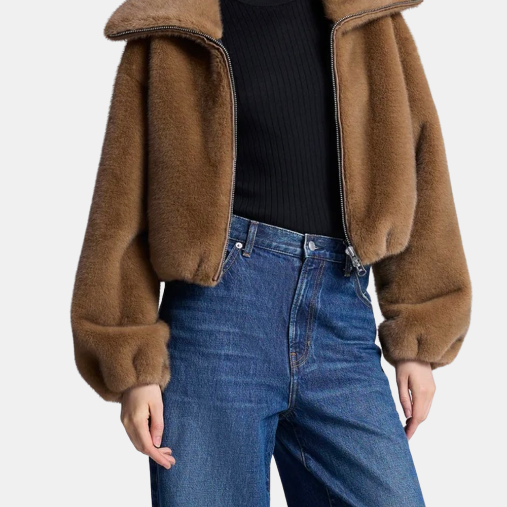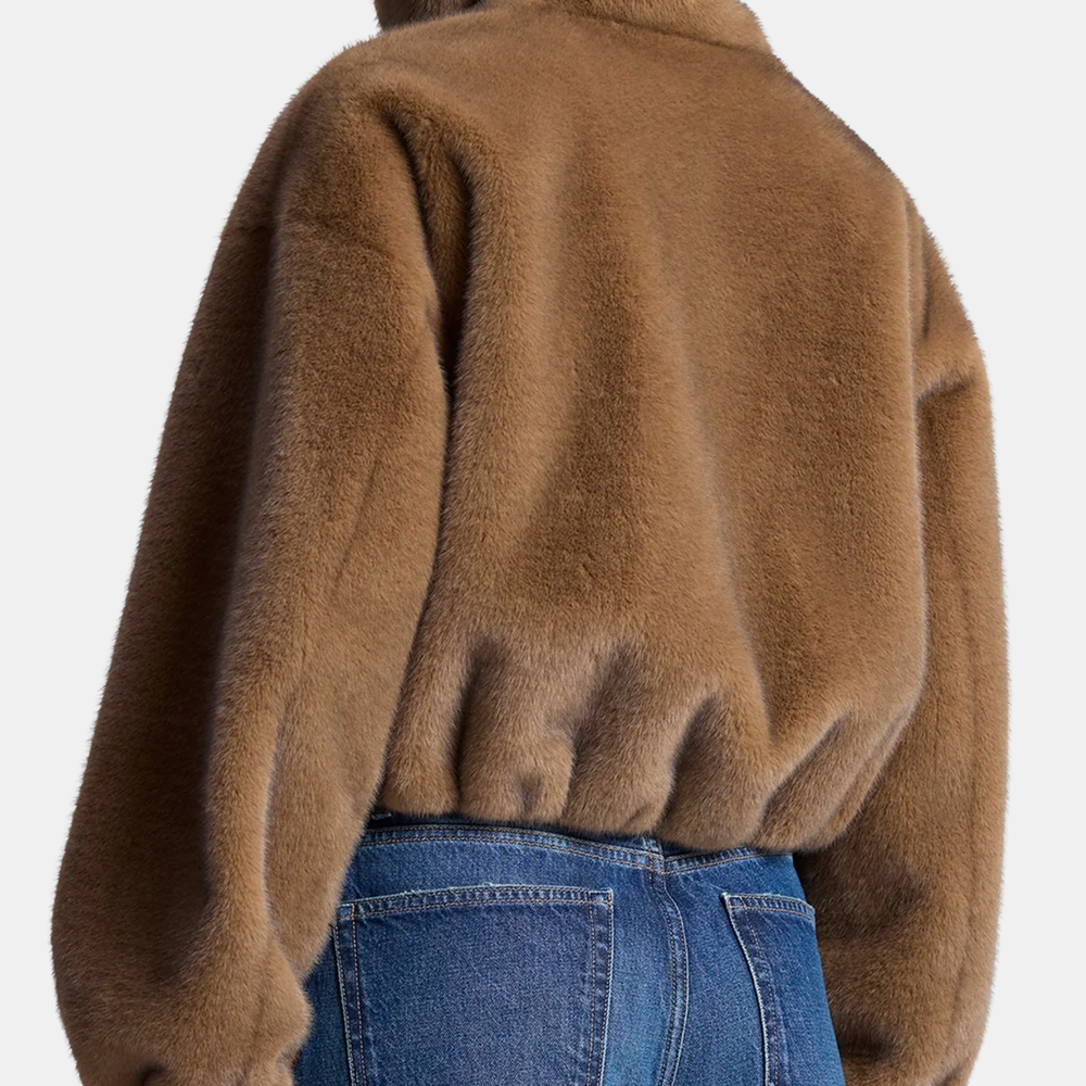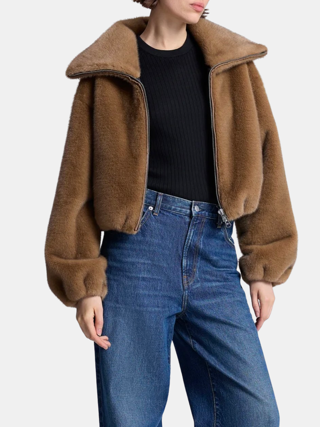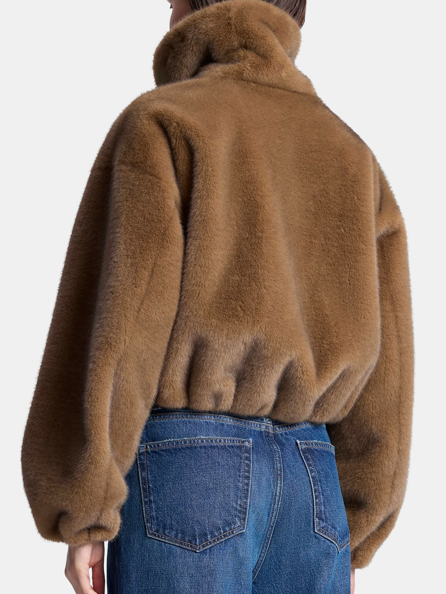 Sumptuously soft, the camel-hued Hazel Jacket is rendered in sheared faux fur. A refined take on directional layering, the shrunken silhouette features a high collar, double-sided zipper and a gathered waistband. Shown in Camel.
