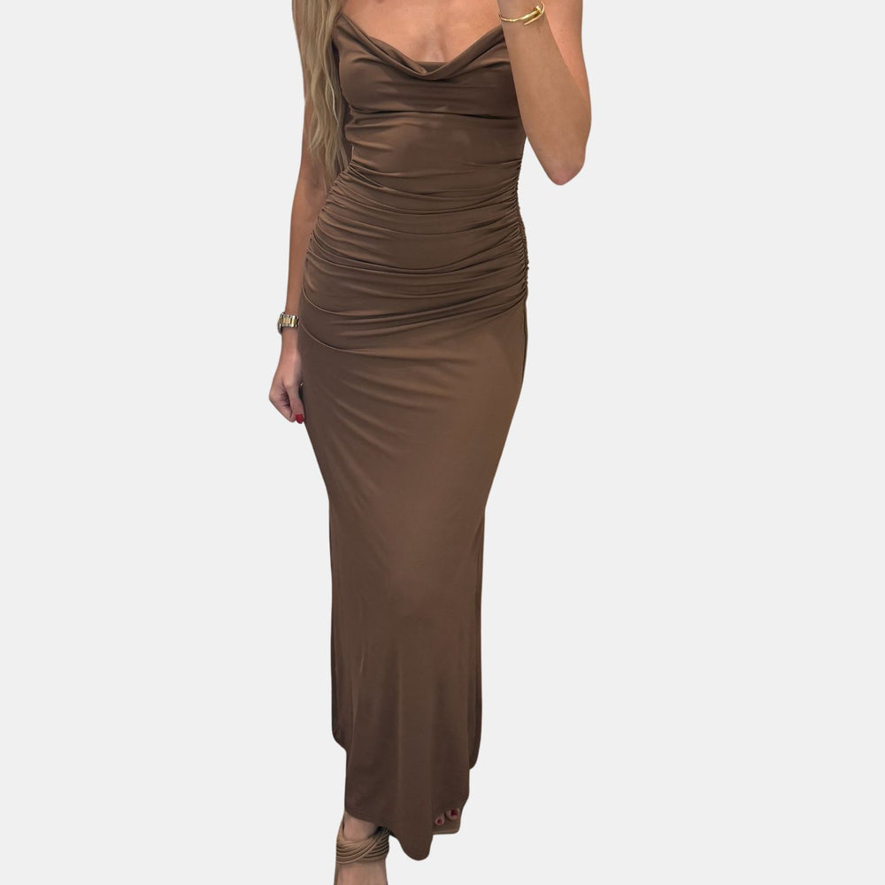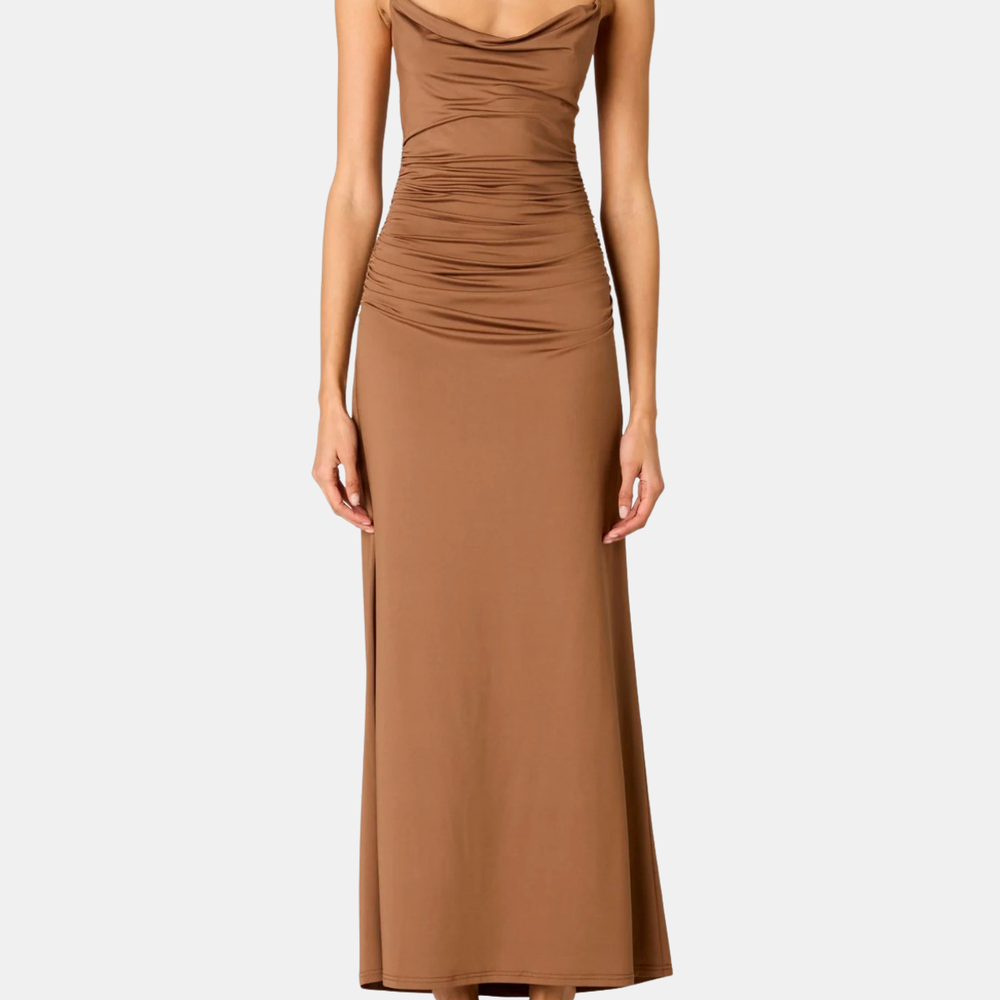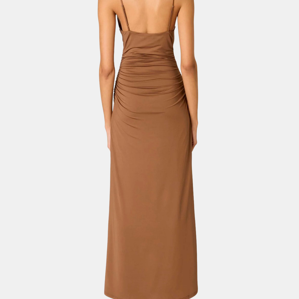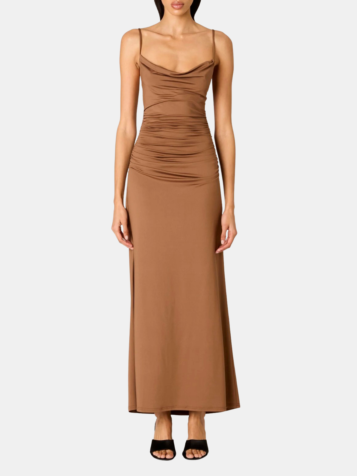 Soft, sultry, and effortlessly elegant. The Ina Dress is a figure-hugging maxi with delicate ruching that flatters in all the right places. A draped cowl neckline and adjustable straps create a refined silhouette, while the flowing hemline adds a touch of grace to every step. Made for candlelit dinners, rooftop soirées, and everything in between. Shown in Cranberry and Mocha.