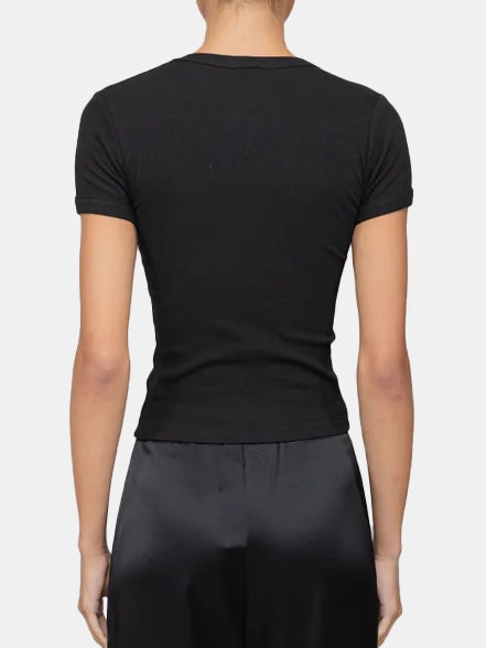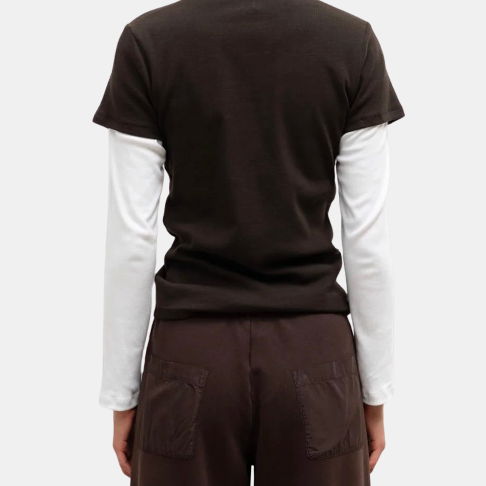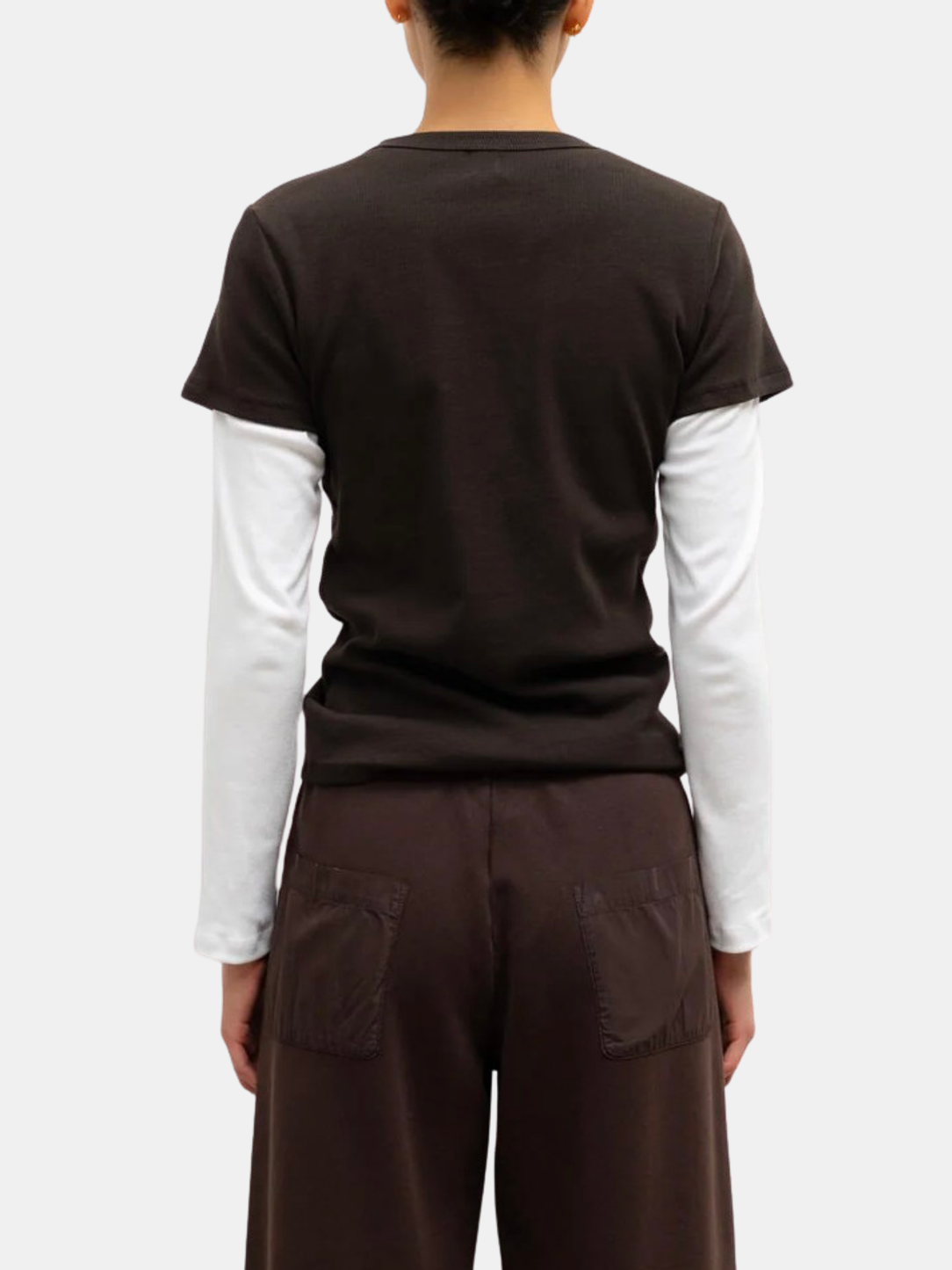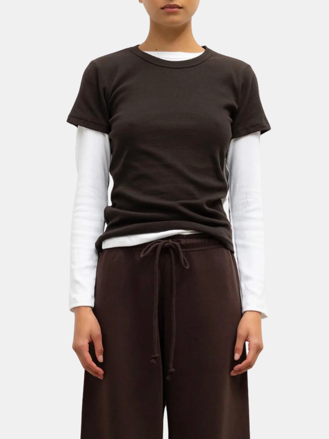 The Kelly Slim Fit Tee by LESET is a classic full length top with a figure-skimming crewneck silhouette and tailored short sleeves, perfect on its own for the warm summer months or as a comfortable under-layer during the winter. Shown in Chocolate, Black, and White.