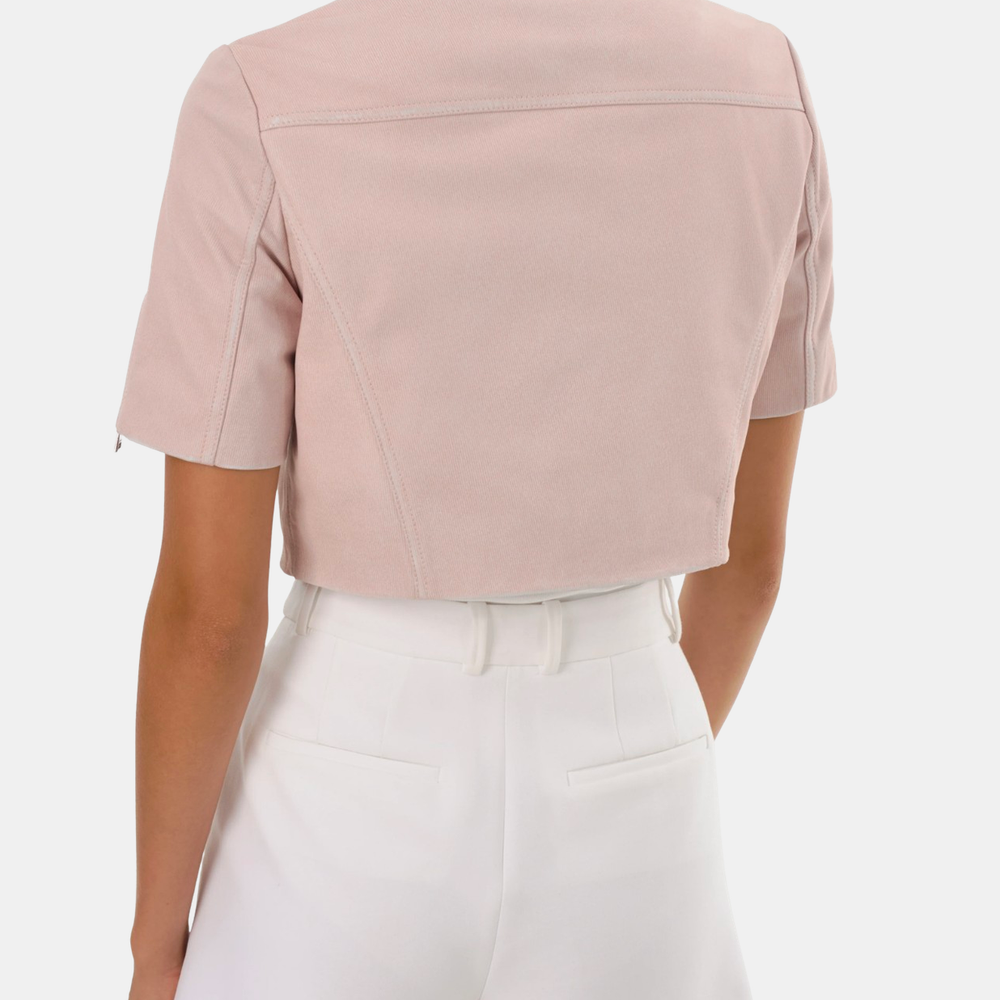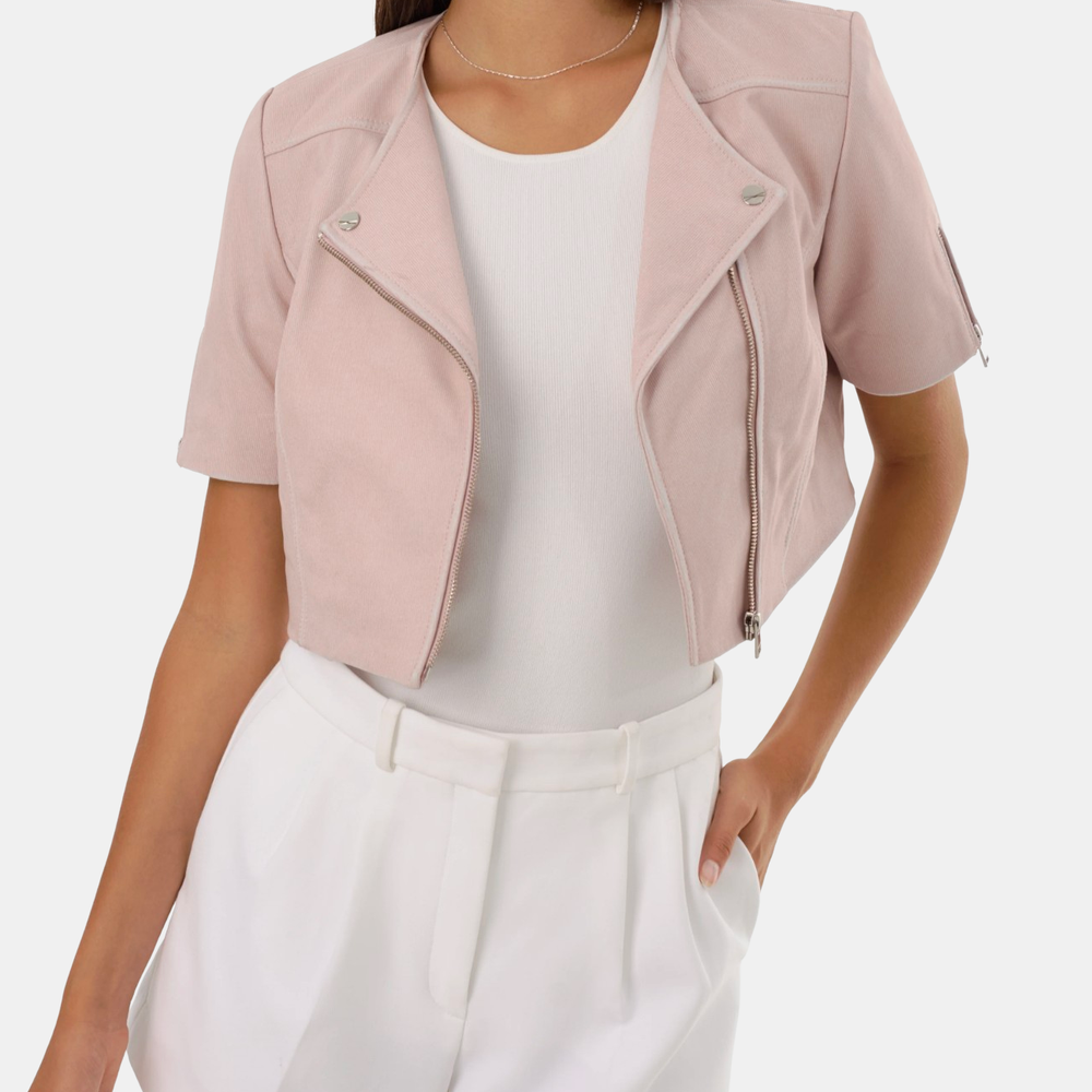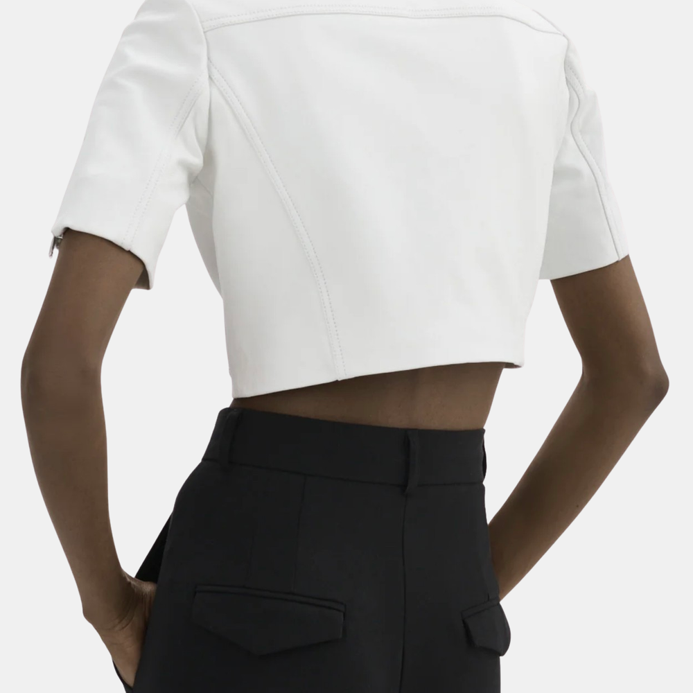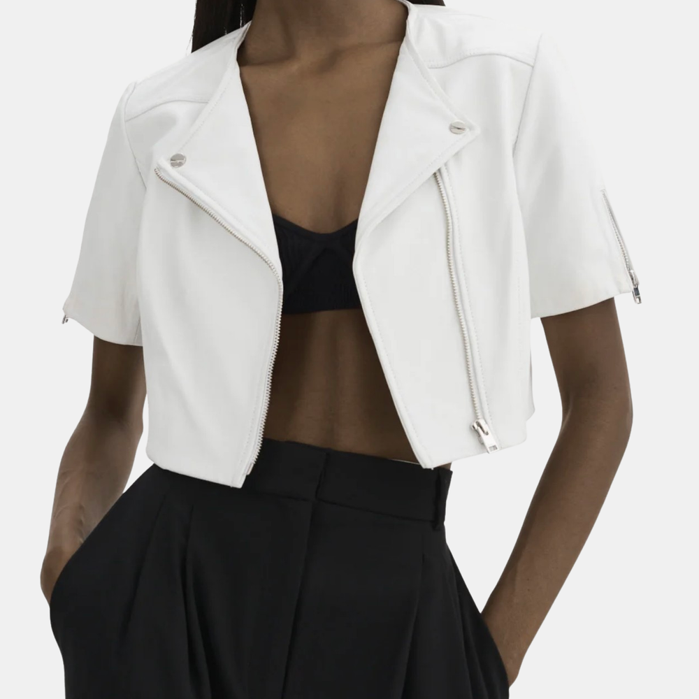 Unexpected in all the right ways, the Kirsi cropped biker jacket is an attractive choice for balmy evenings. Featuring classic biker elements from the asymmetrical closure to the snap lapels & gold branded hardware this beauty hits right at the hips to define your silhouette. You'll fall for its soft-to-the-touch lamb leather body. Lightweight and breathable, this top piece makes a flawless day to night transition. Shown in Bone, White, and Pink Denim.
