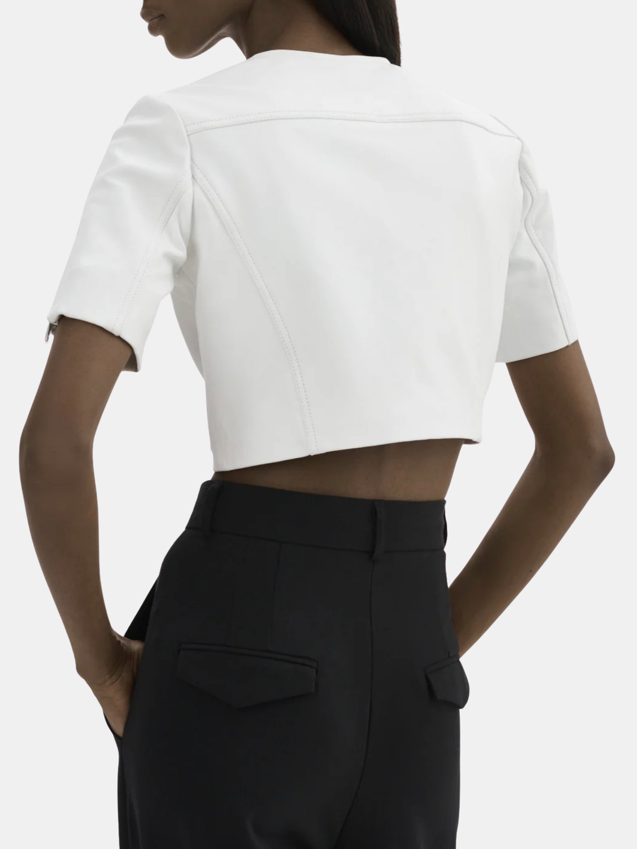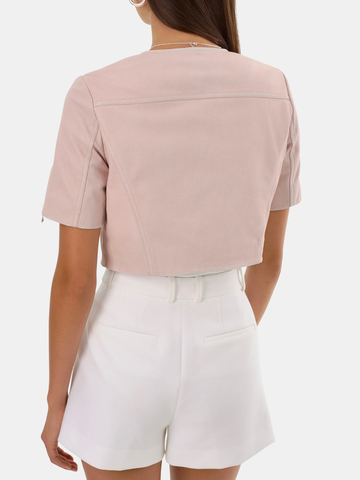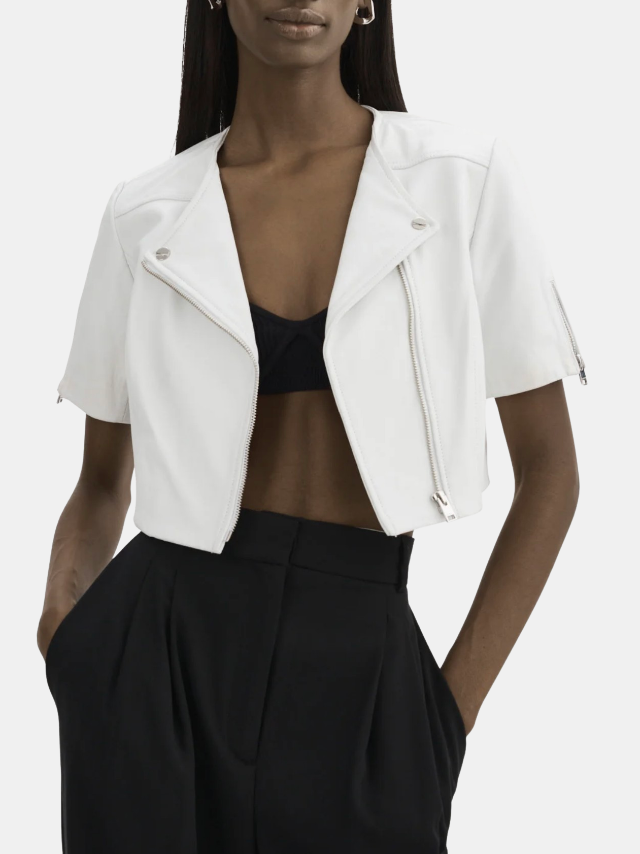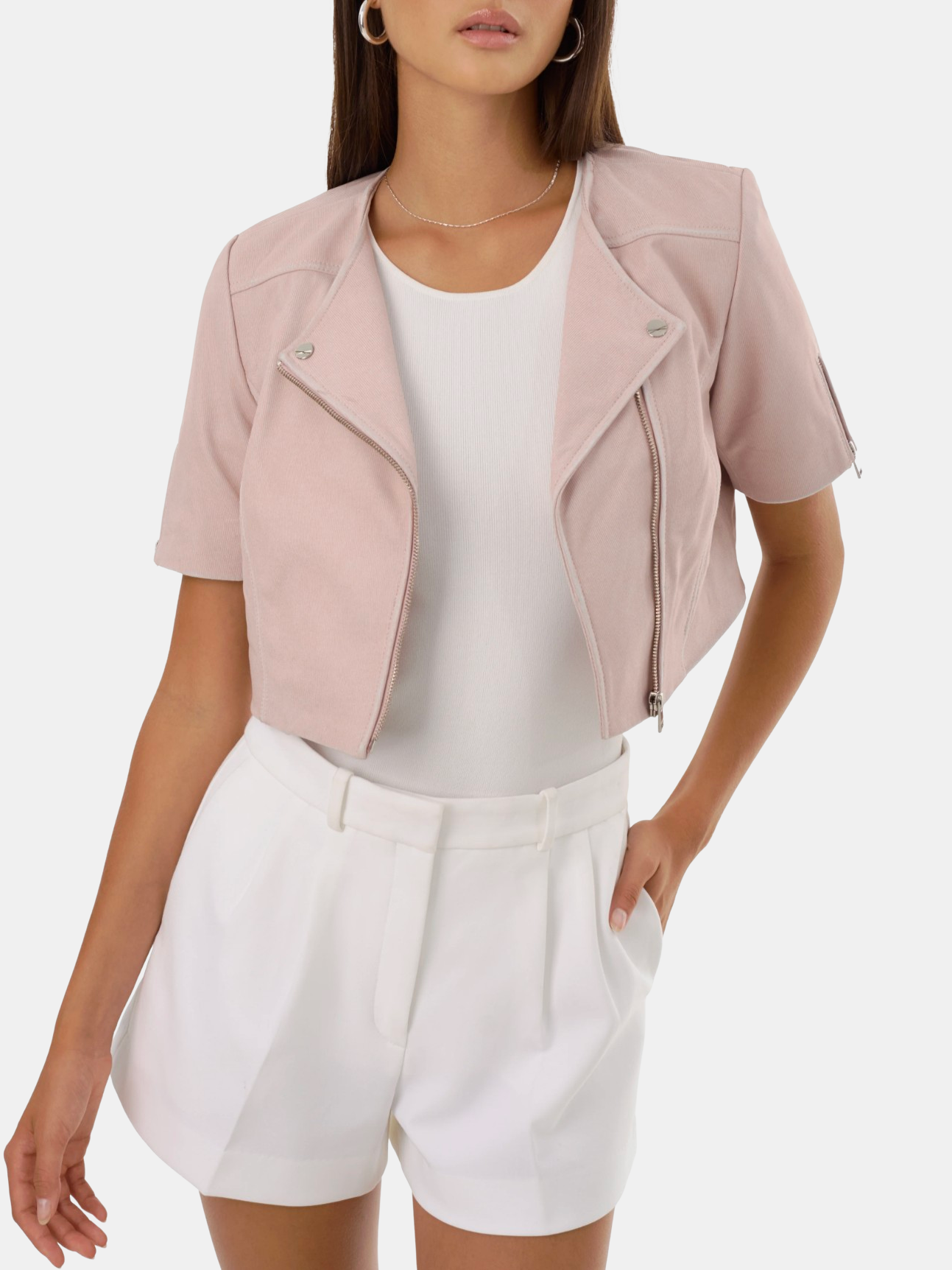 Unexpected in all the right ways, the Kirsi cropped biker jacket is an attractive choice for balmy evenings. Featuring classic biker elements from the asymmetrical closure to the snap lapels & gold branded hardware this beauty hits right at the hips to define your silhouette. You'll fall for its soft-to-the-touch lamb leather body. Lightweight and breathable, this top piece makes a flawless day to night transition. Shown in Bone, White, and Pink Denim.