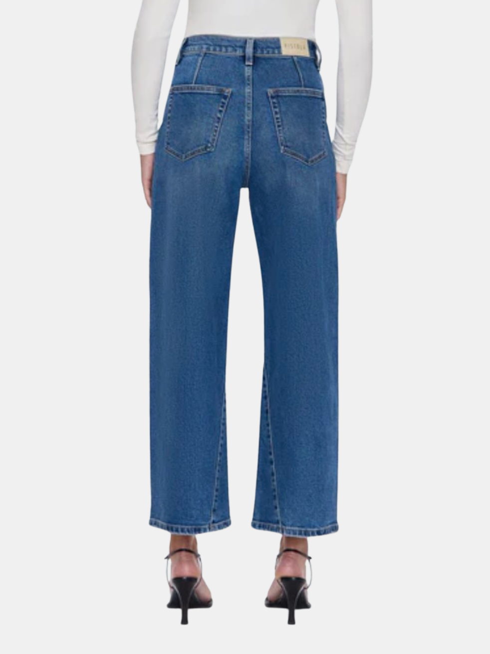 The new must-have jean with a twist. Kyra sits confidently at a high rise with our signature bowed leg silhouette and cropped 28" inseam. The subtle curve creates dimension while the wide ankle opening adds modern proportion with a new wide angle for the season. Fashion detail seaming, including a twisted seam that moves forward and yoke seams in the back, brings modern denim classic sophistication. Crafted from our signature comfort stretch denim in Soho, a medium vintage wash with subtle fading that feels both contemporary and timeless. Shown in Soho.
