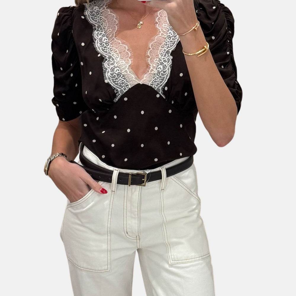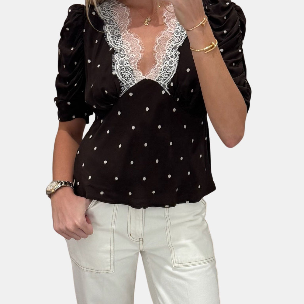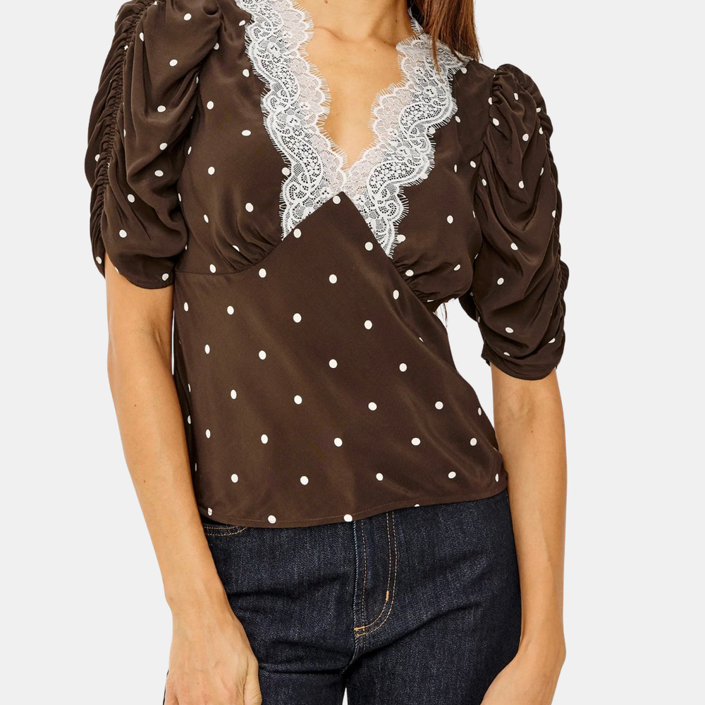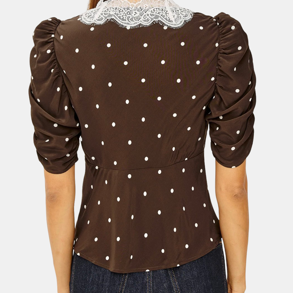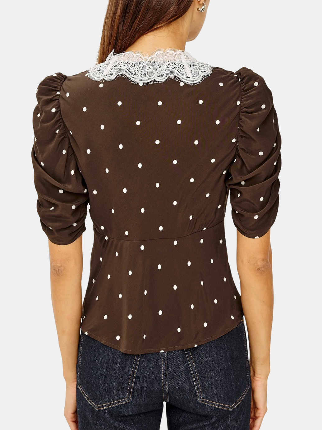 Cut from luxurious crepe with a subtle sheen and fluid drape, the Lazara captivates with a lace-trimmed V-neckline and charming polka-dot print. Three-quarter puff sleeves with gentle ruching add flattering shape and movement for versatile day-to-night sophistication. Shown in Polka Dot.