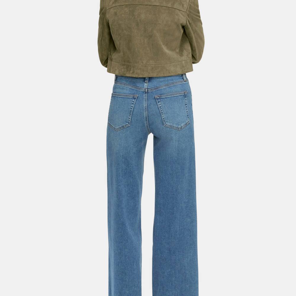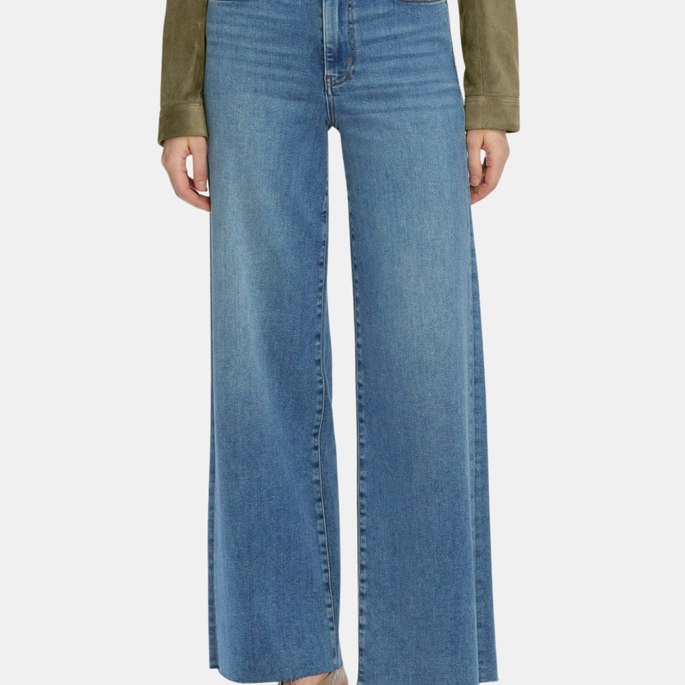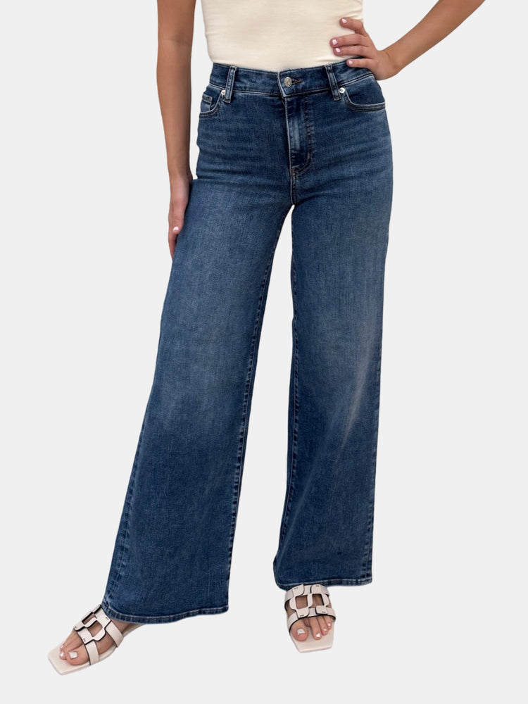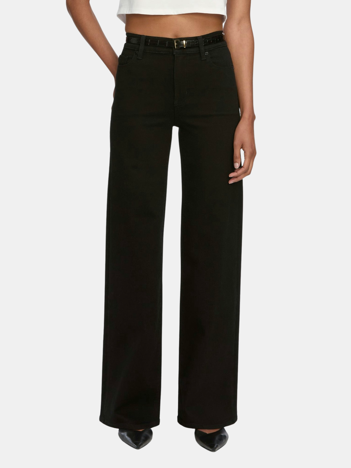 Step into a perfect fusion of timeless elegance and modern comfort with a high-rise, wide-leg silhouette. These palazzo jeans are designed with a flattering high rise, fitted hip, and subtle wide-leg flare that hits at the floor. Crafted from a sustainable, ultra-stretch cotton blend for soft and comfortable wear. Shown in Tribute, Black, and Flip Raw.