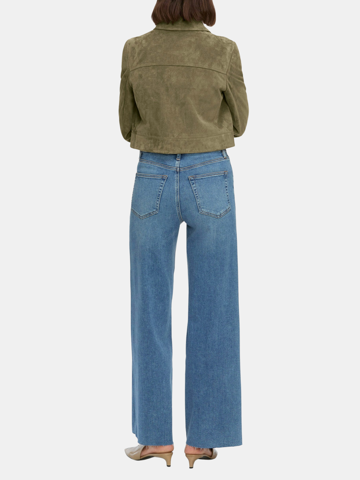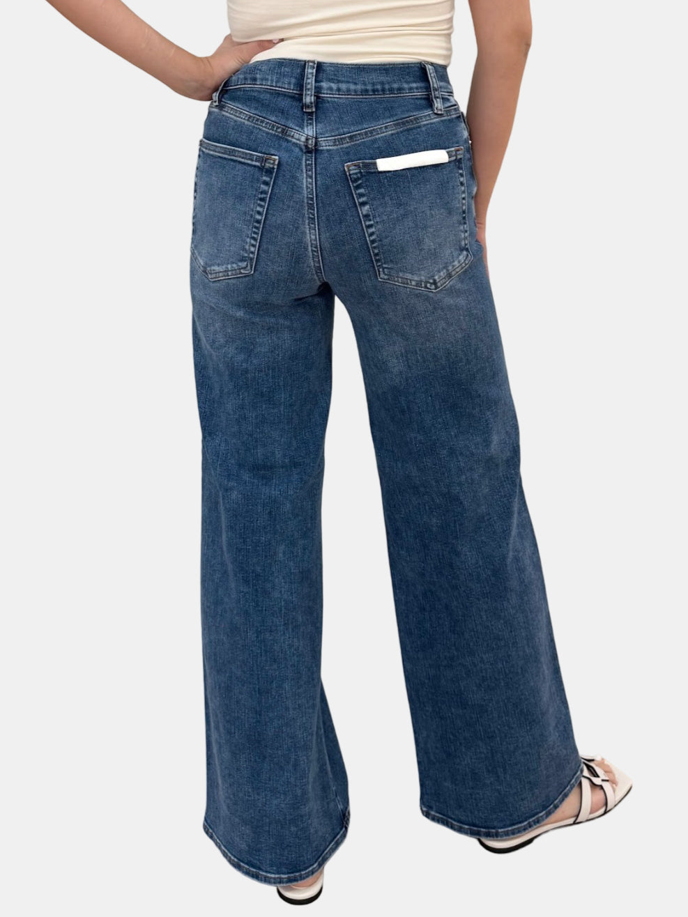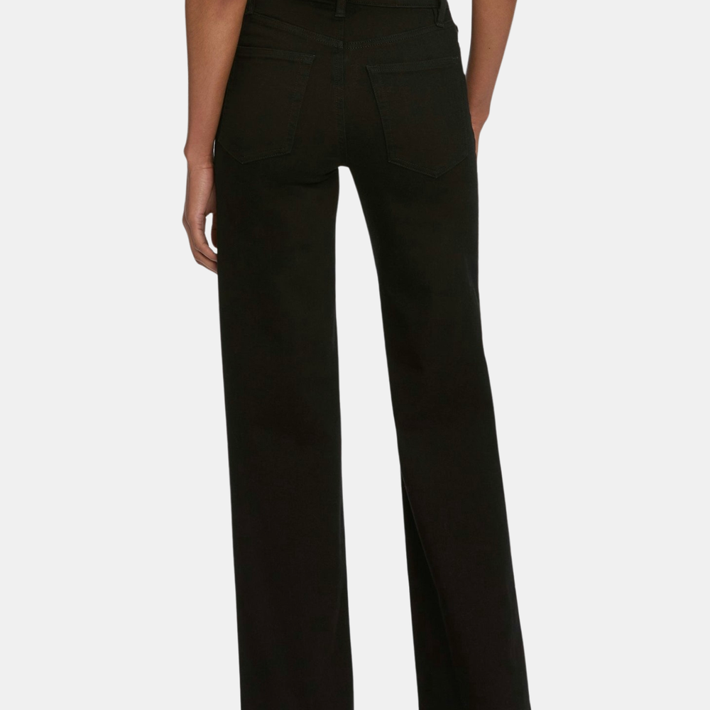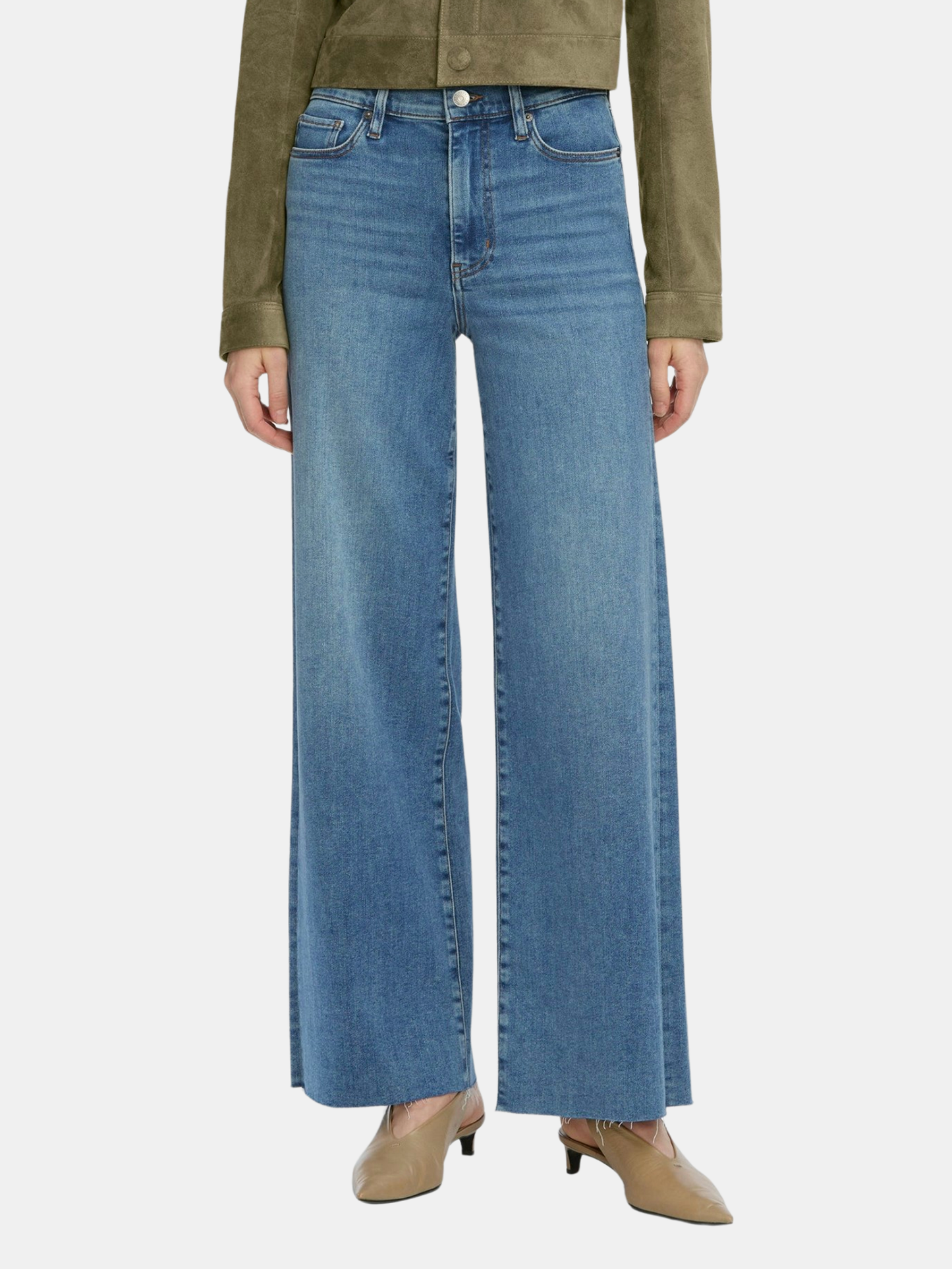 Step into a perfect fusion of timeless elegance and modern comfort with a high-rise, wide-leg silhouette. These palazzo jeans are designed with a flattering high rise, fitted hip, and subtle wide-leg flare that hits at the floor. Crafted from a sustainable, ultra-stretch cotton blend for soft and comfortable wear. Shown in Tribute, Black, and Flip Raw.