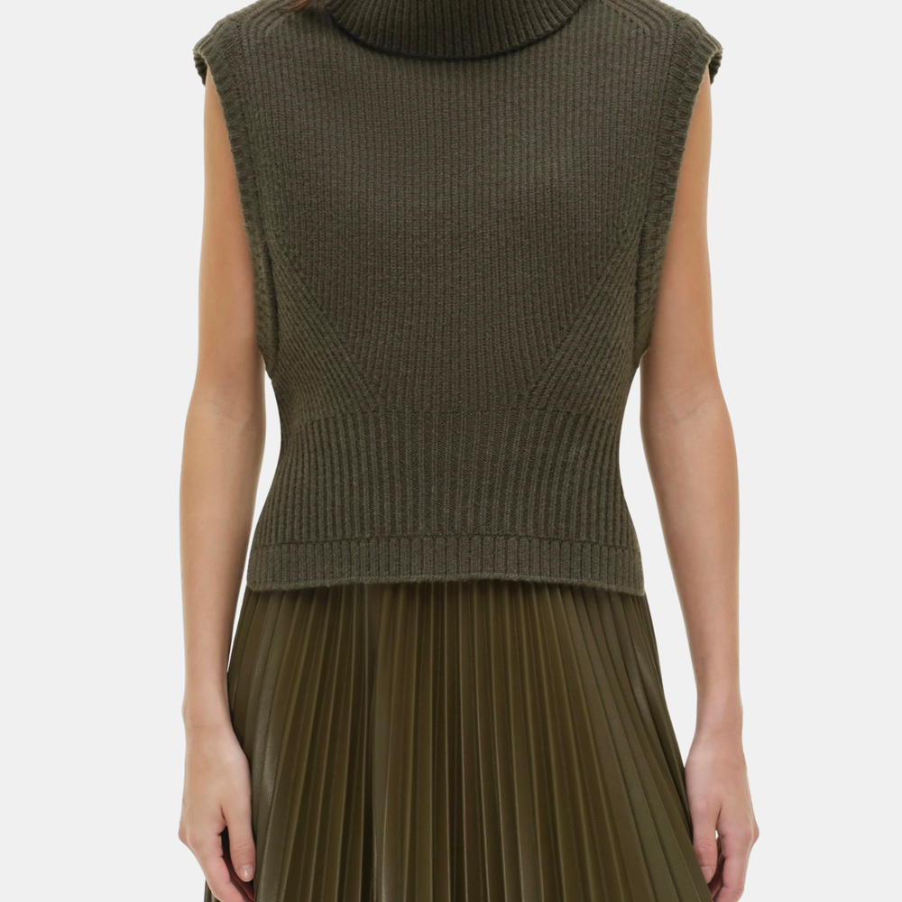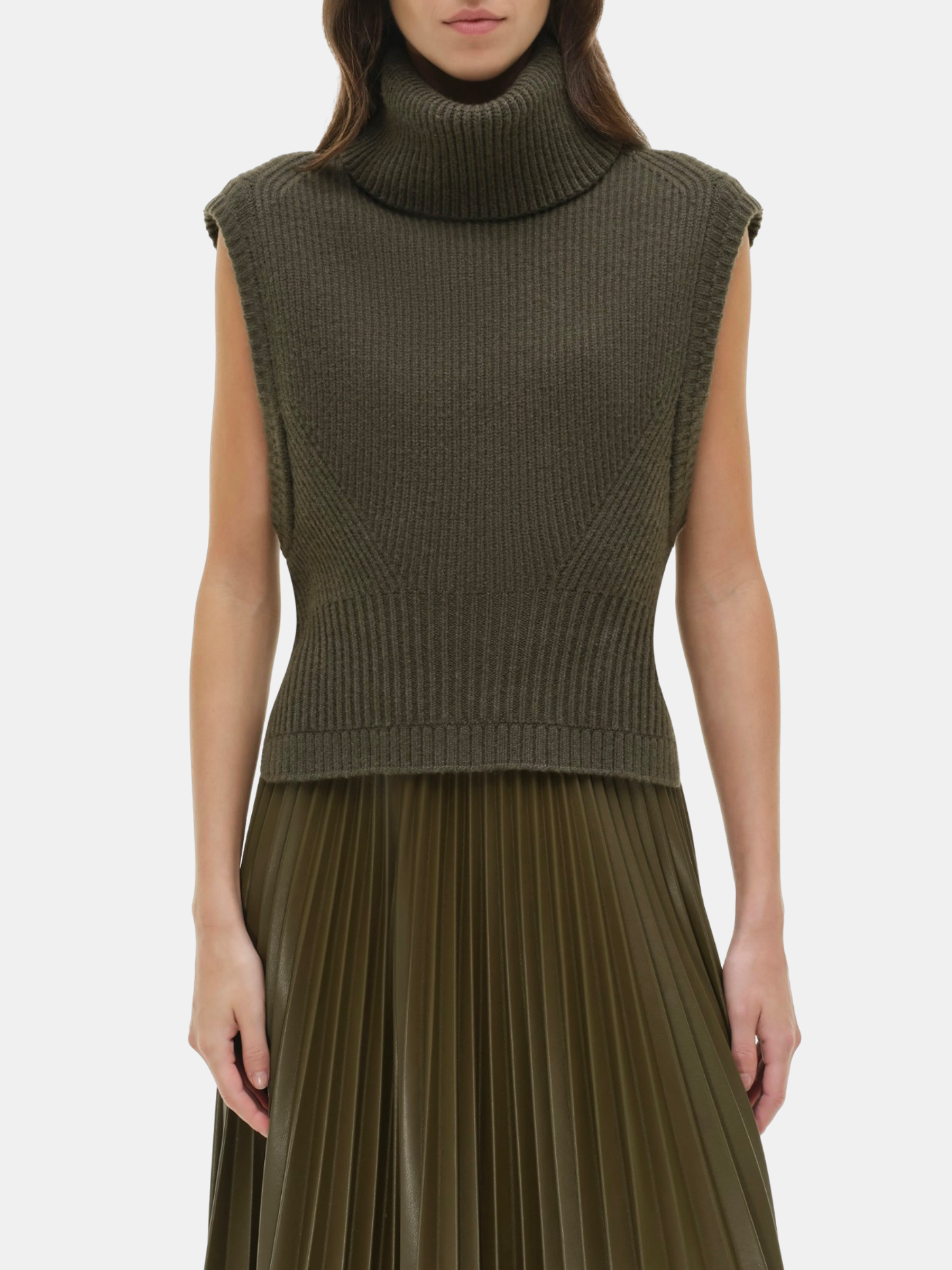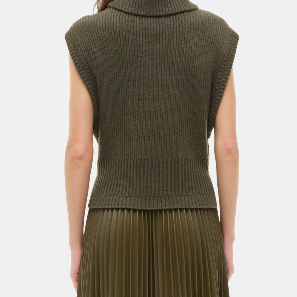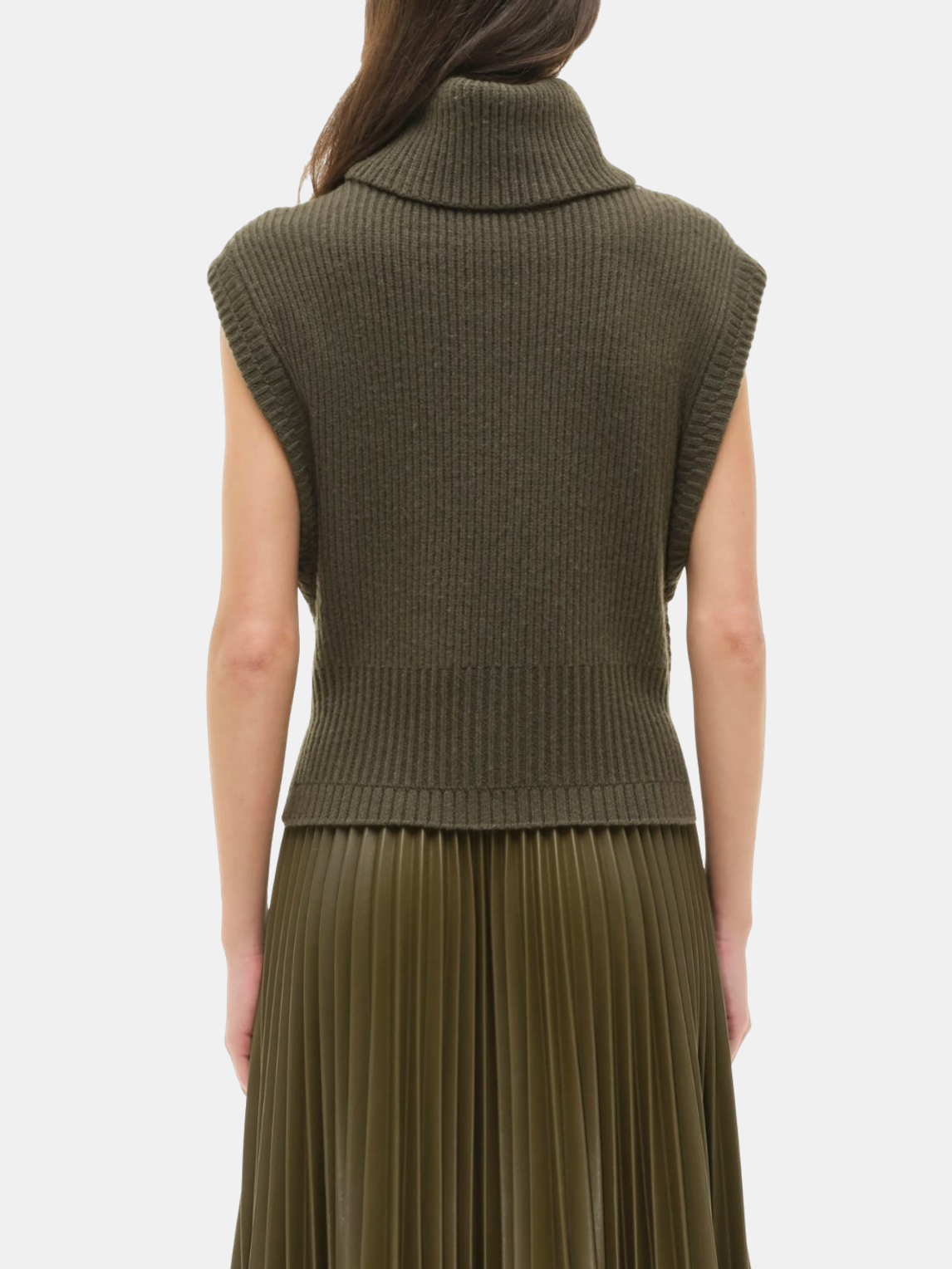 A wool cashmere blend sleeveless top that features a turtleneck and barely grazed shoulders. Shown in Alligator and Oatmeal.