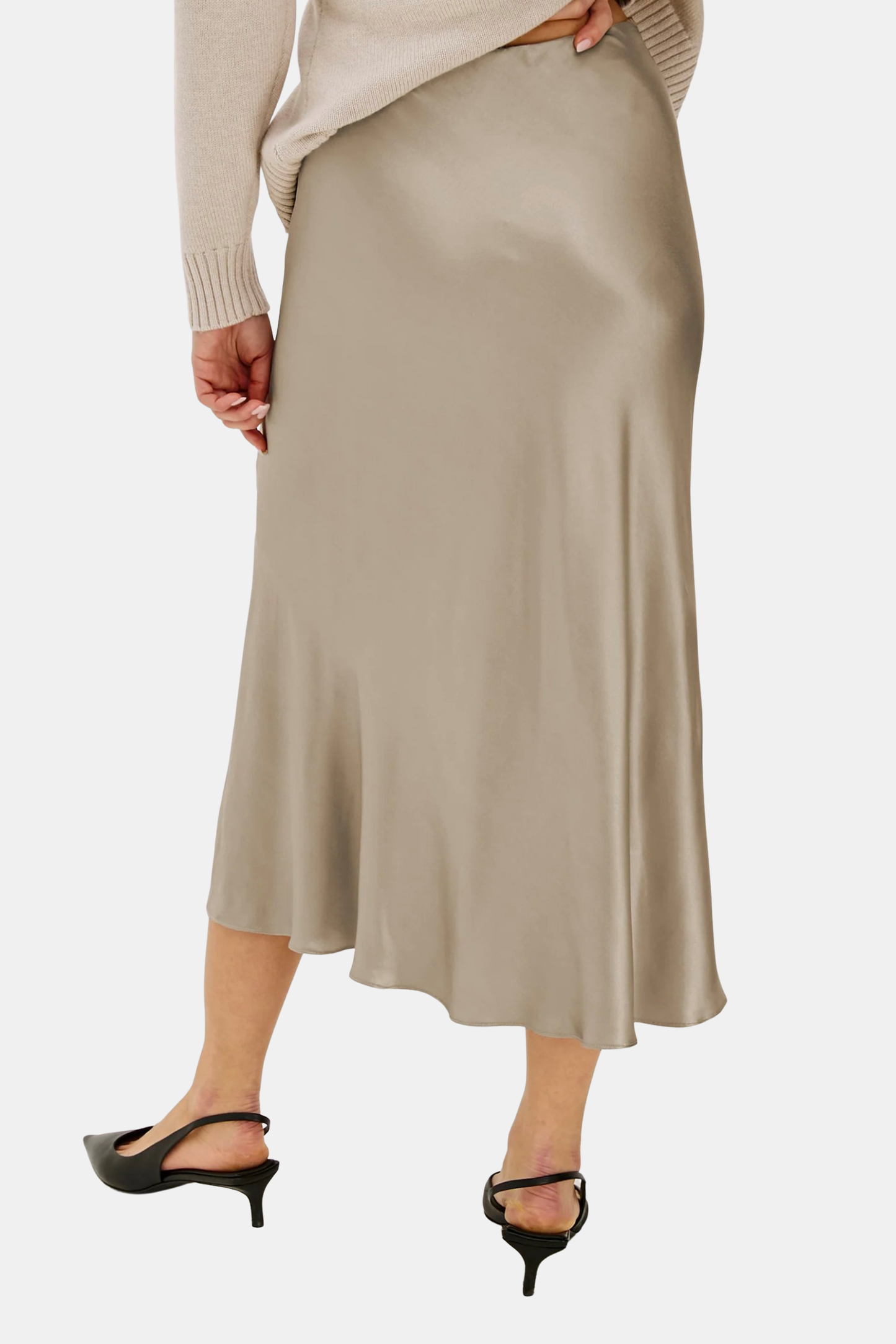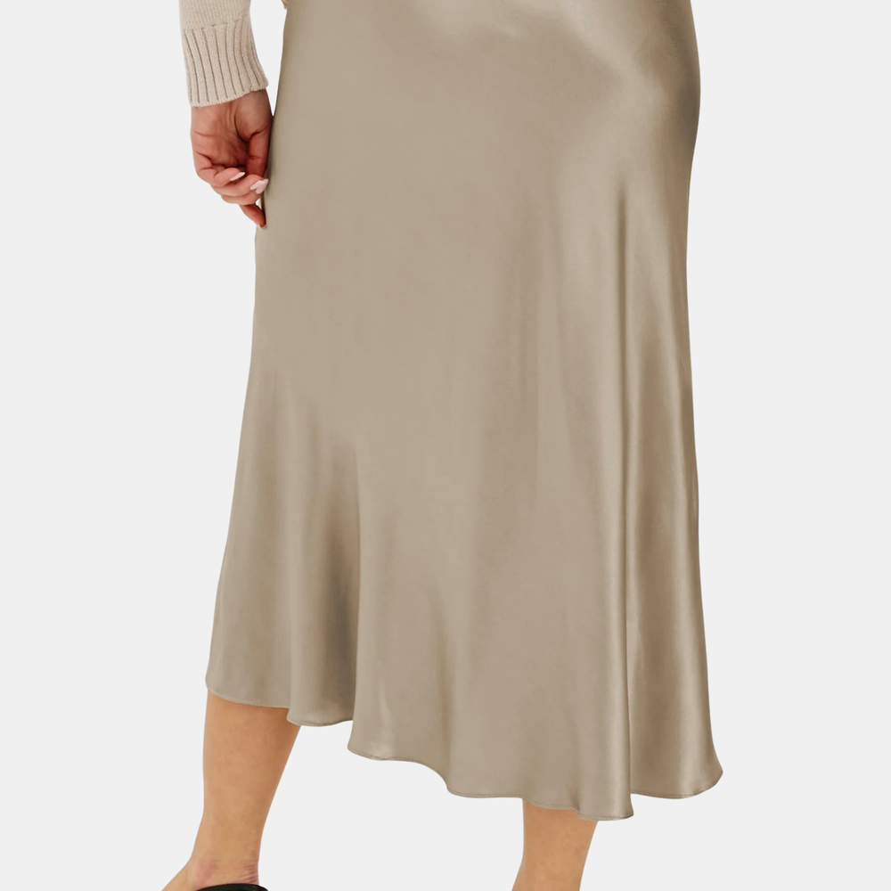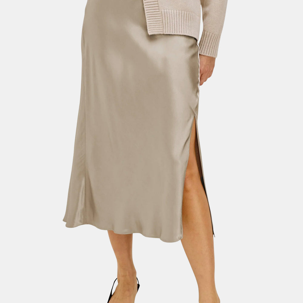 Meet your new go-to midi. Cut from smooth satin back crepe, this slip-style skirt drapes beautifully and feels as good as it looks. A front-facing slit adds just the right amount of movement. Shown in Mink.