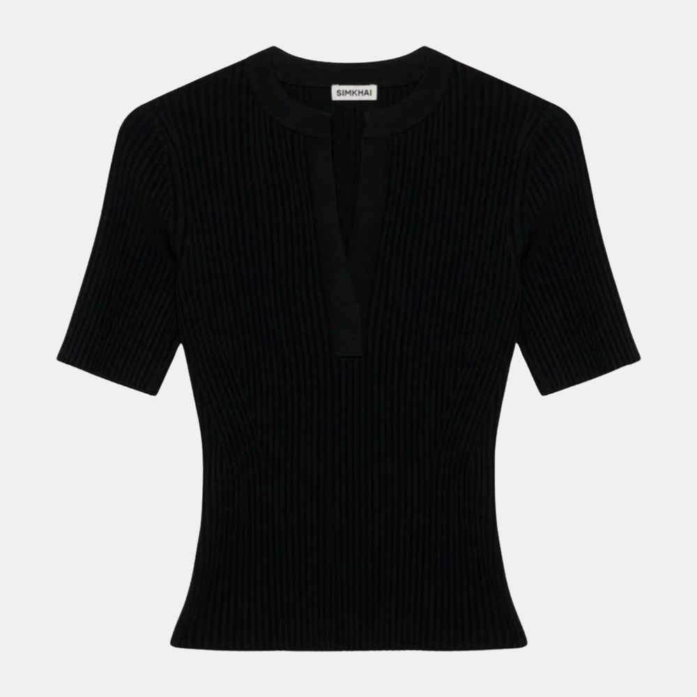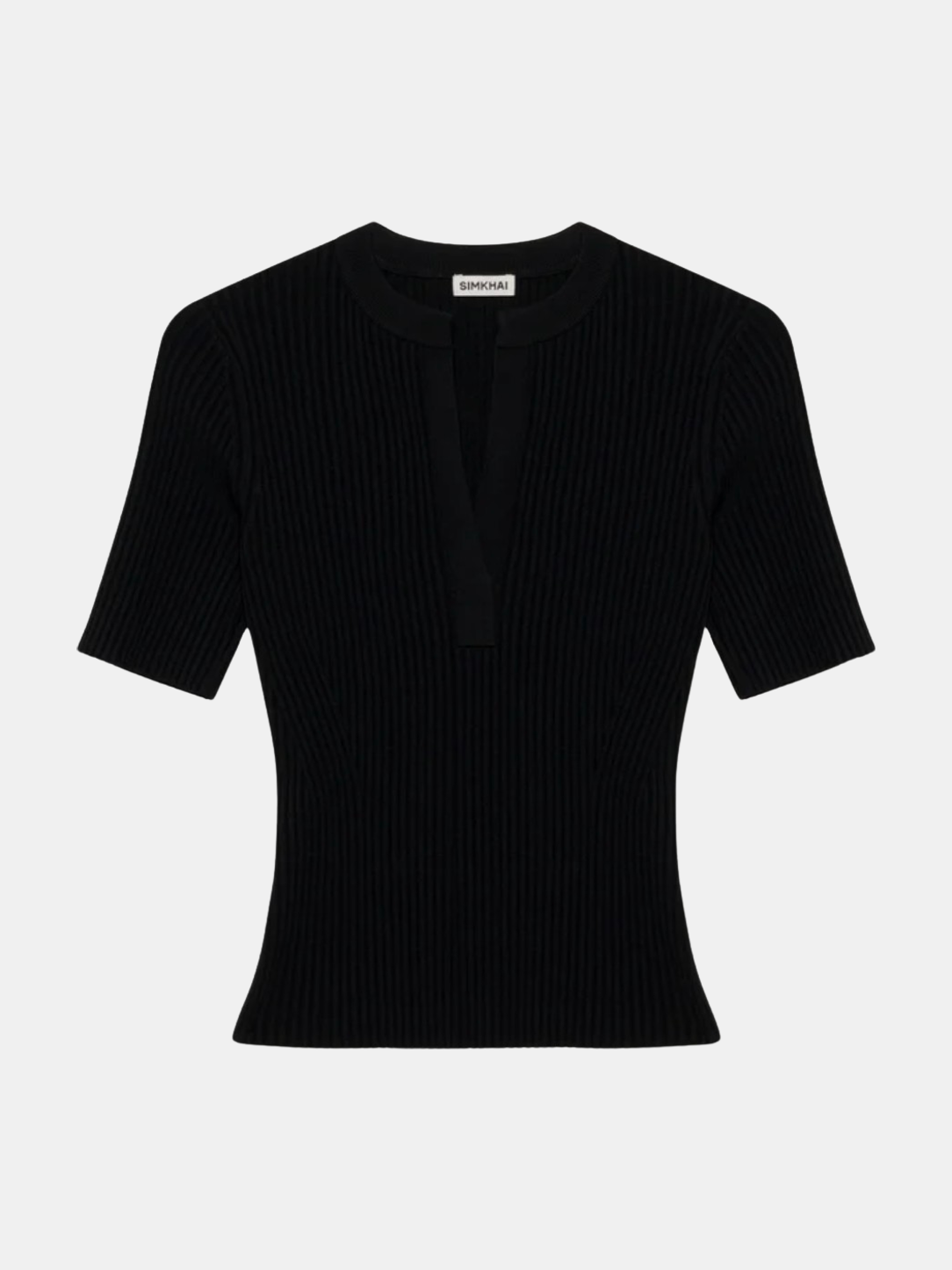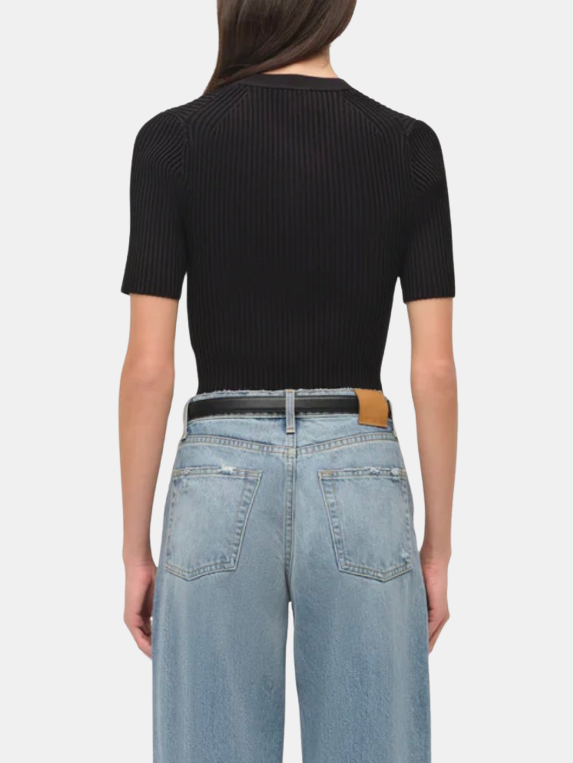 Crafted from a dense rib knit that molds smoothly to the form, this short-sleeve top features a clean open neckline with a minimalist placket detail. Streamlined and versatile, it brings quiet structure to everyday dressing. Shown in Black.