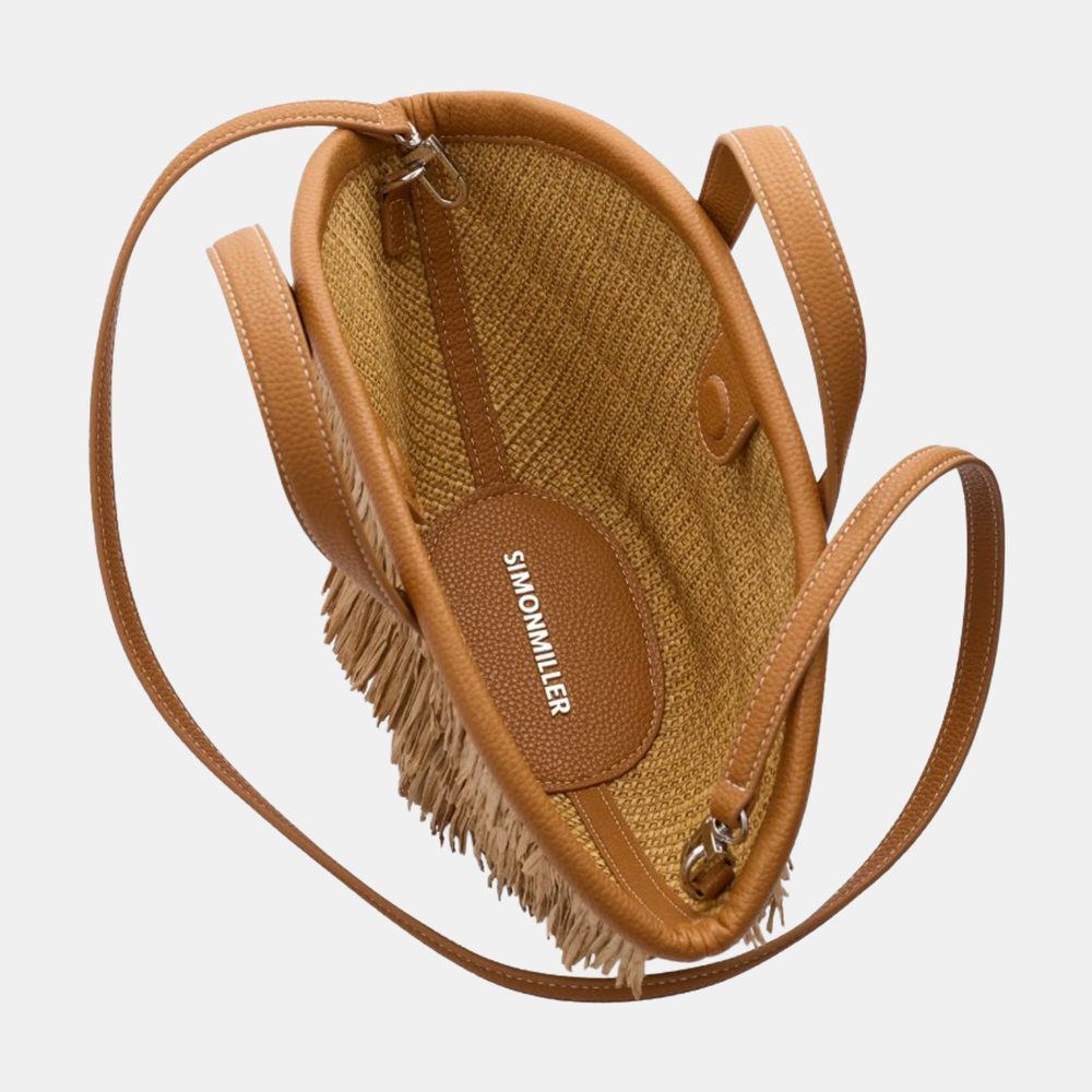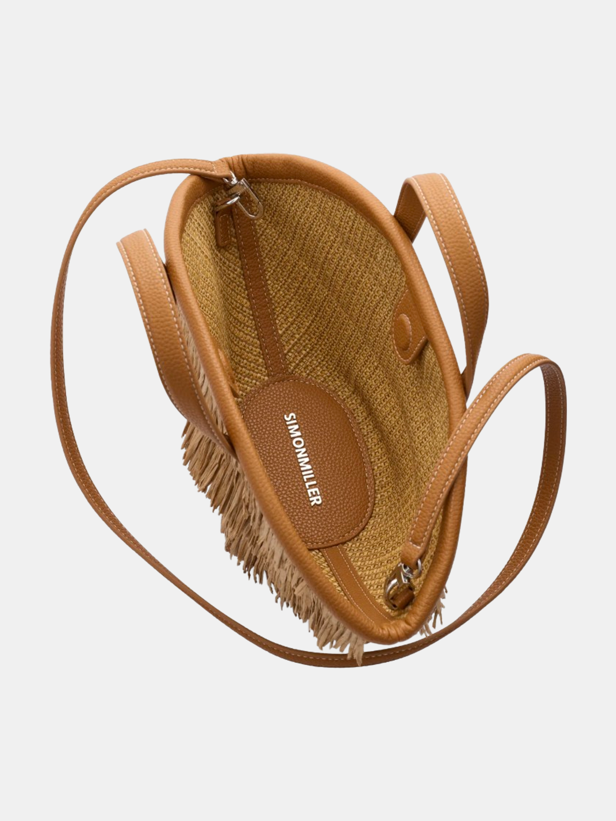 Mini fringe bag with short handle and long strap. Has a magnetic closure. Shown in Natural.