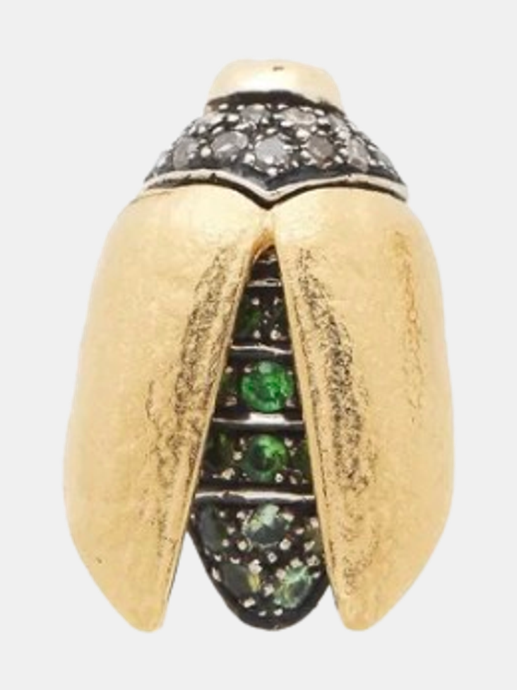 Taking flight with its stunning gold wings, this elegant mini scarab stud is fashioned in 18K yellow gold and sterling silver. Embellished with brown diamonds and Tsavorite, this delicately crafted earring makes a subtle yet striking statement. Shown in Gold.