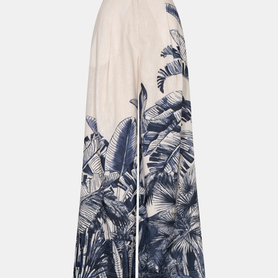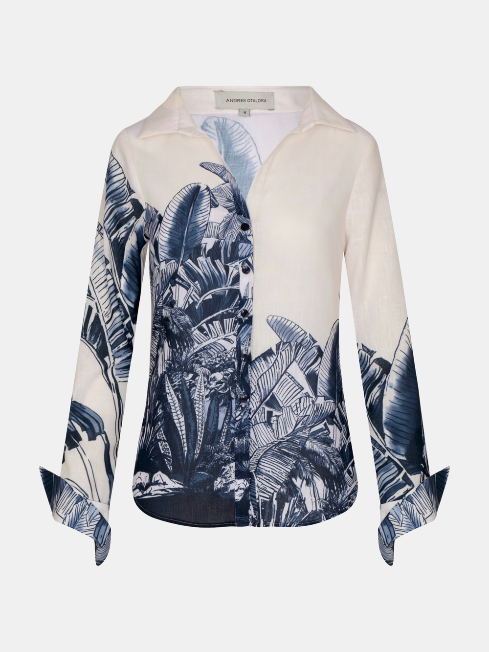 The Nomada blouse, made of 100% Linen in an attractive navy caribe print, combines elegance and comfort. Its light and fluid design is ideal for any occasion. Shown in Navy Caribe.