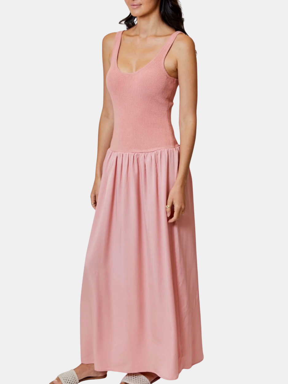 This drop-waist tank dress features a sleek, fitted bodice and a flowy woven skirt for a relaxed yet refined silhouette. Effortlessly versatile, it's perfect for warm days and easy layering. Shown in Blush.