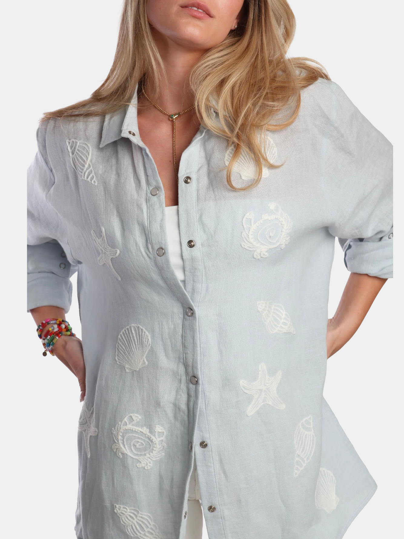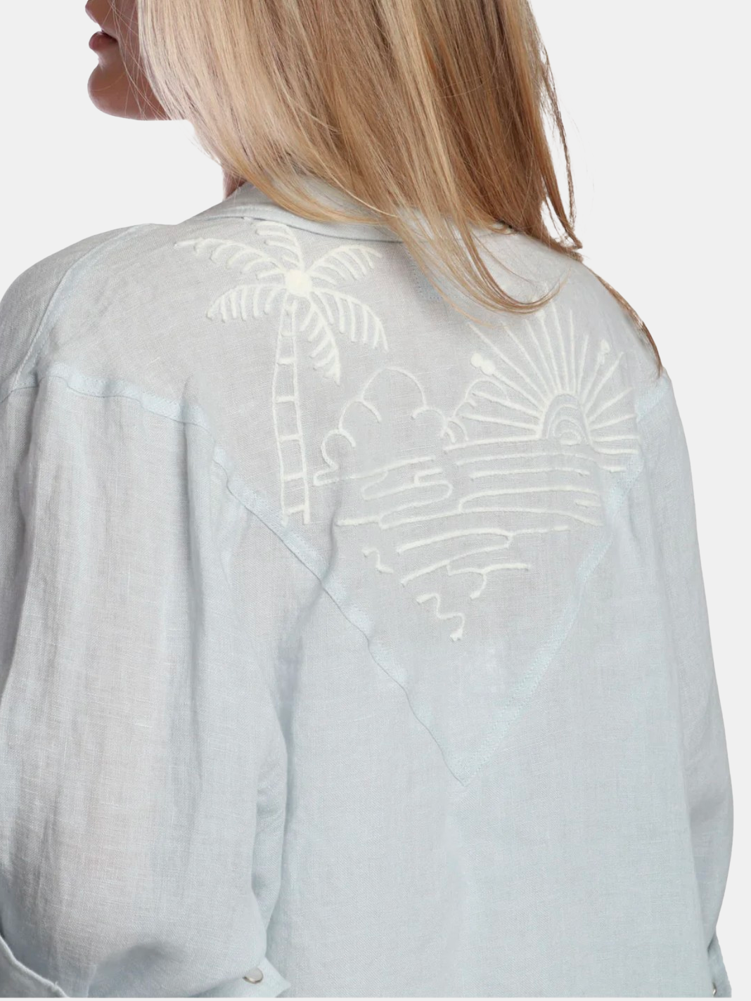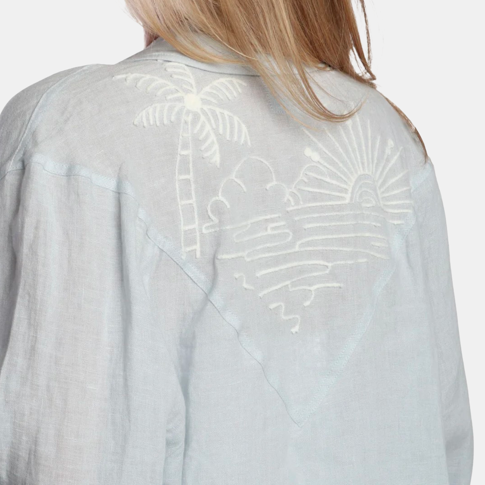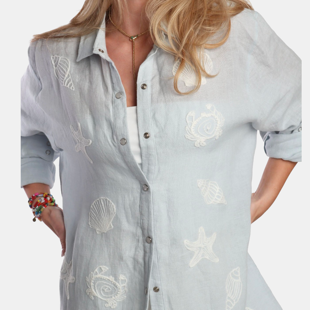Set sail in style with this pale blue linen button-down shirt, featuring intricate nautical embroidery, pearl snap buttons, and a flattering V-back. Lightweight, breezy, and perfect for coastal days or crisp summer evenings. Shown in Powder Blue and Mocha.