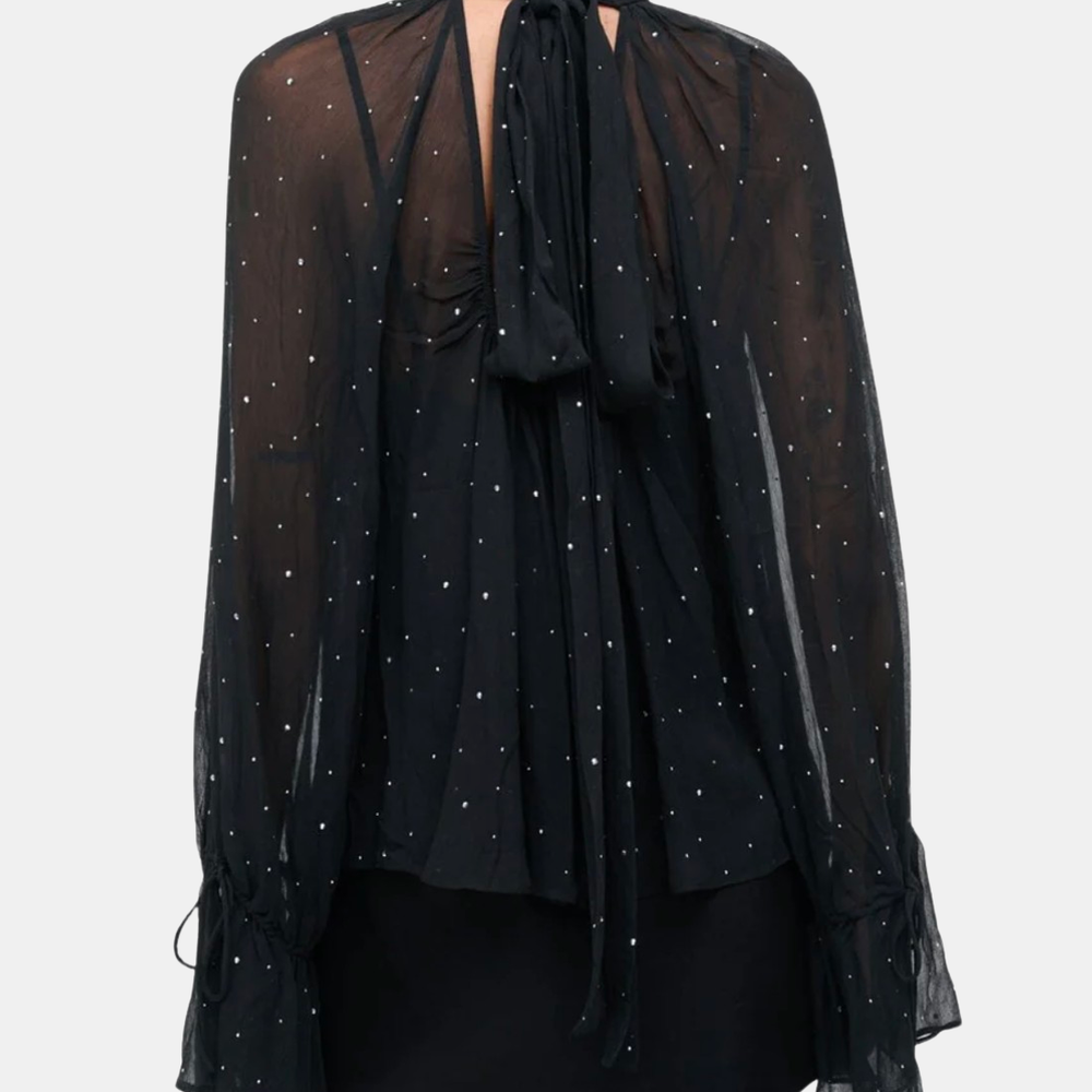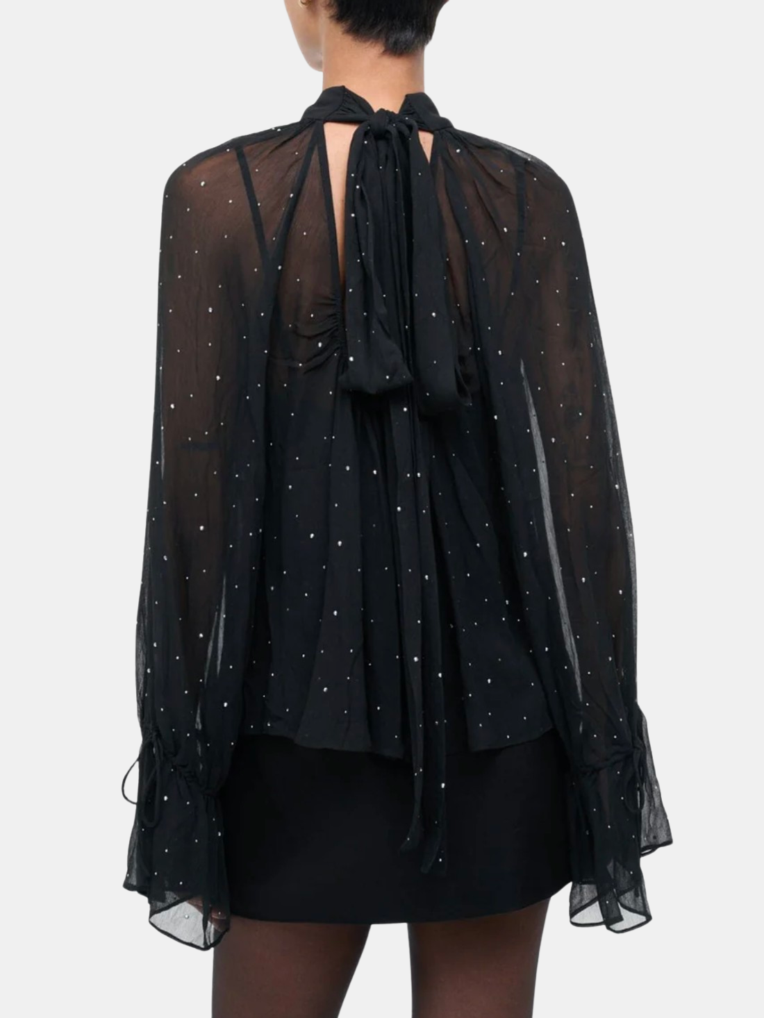 The perfect party top, this style is made from an embellished crinkle chiffon fabric and features a high neck with bow-tie detail at the back. Poet sleeves and shirring at the neckline create volume and drama with movement, with a removable under slip for added versatility. Shown in Black.