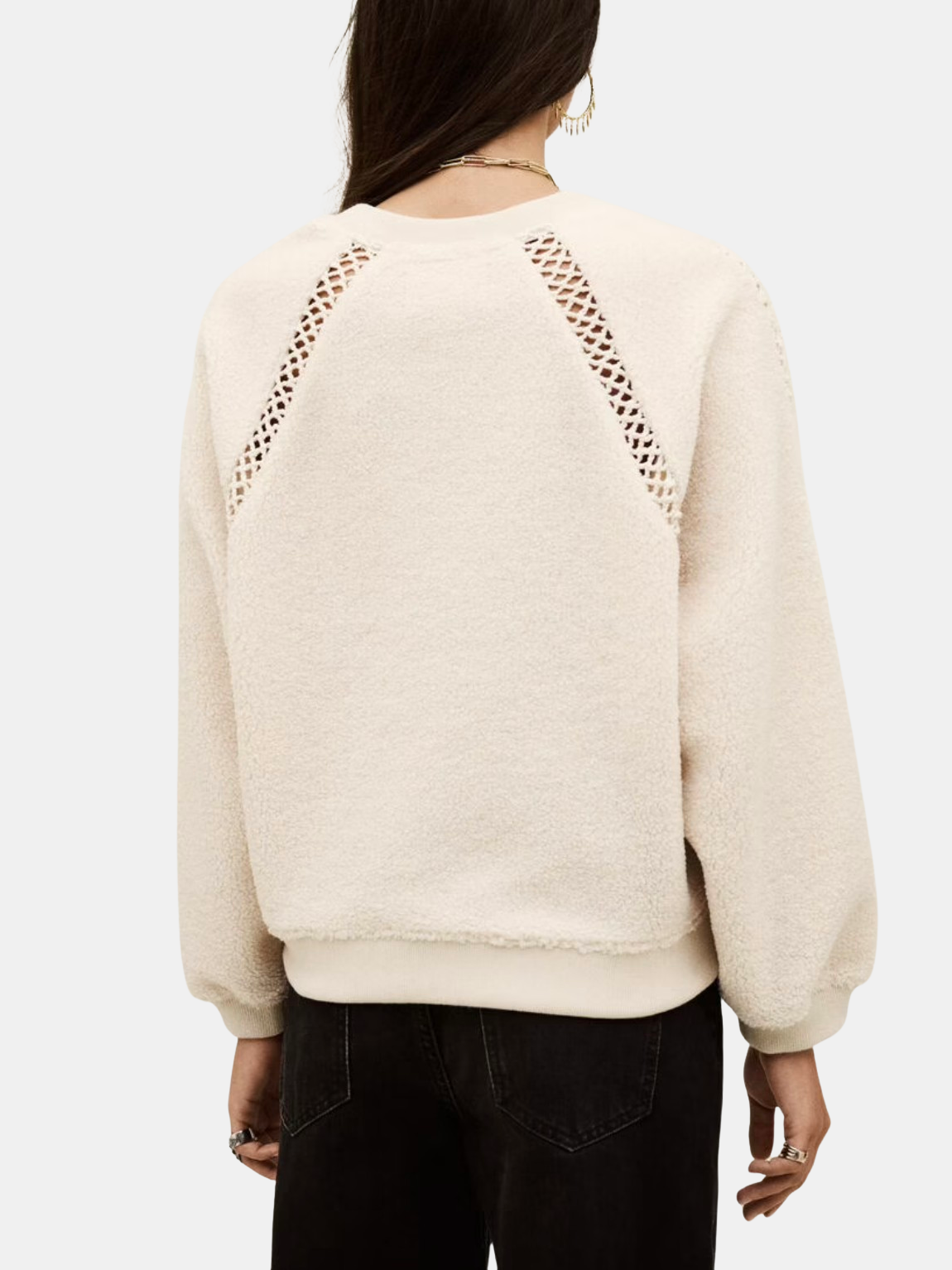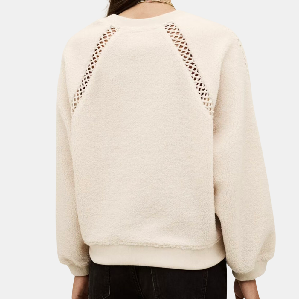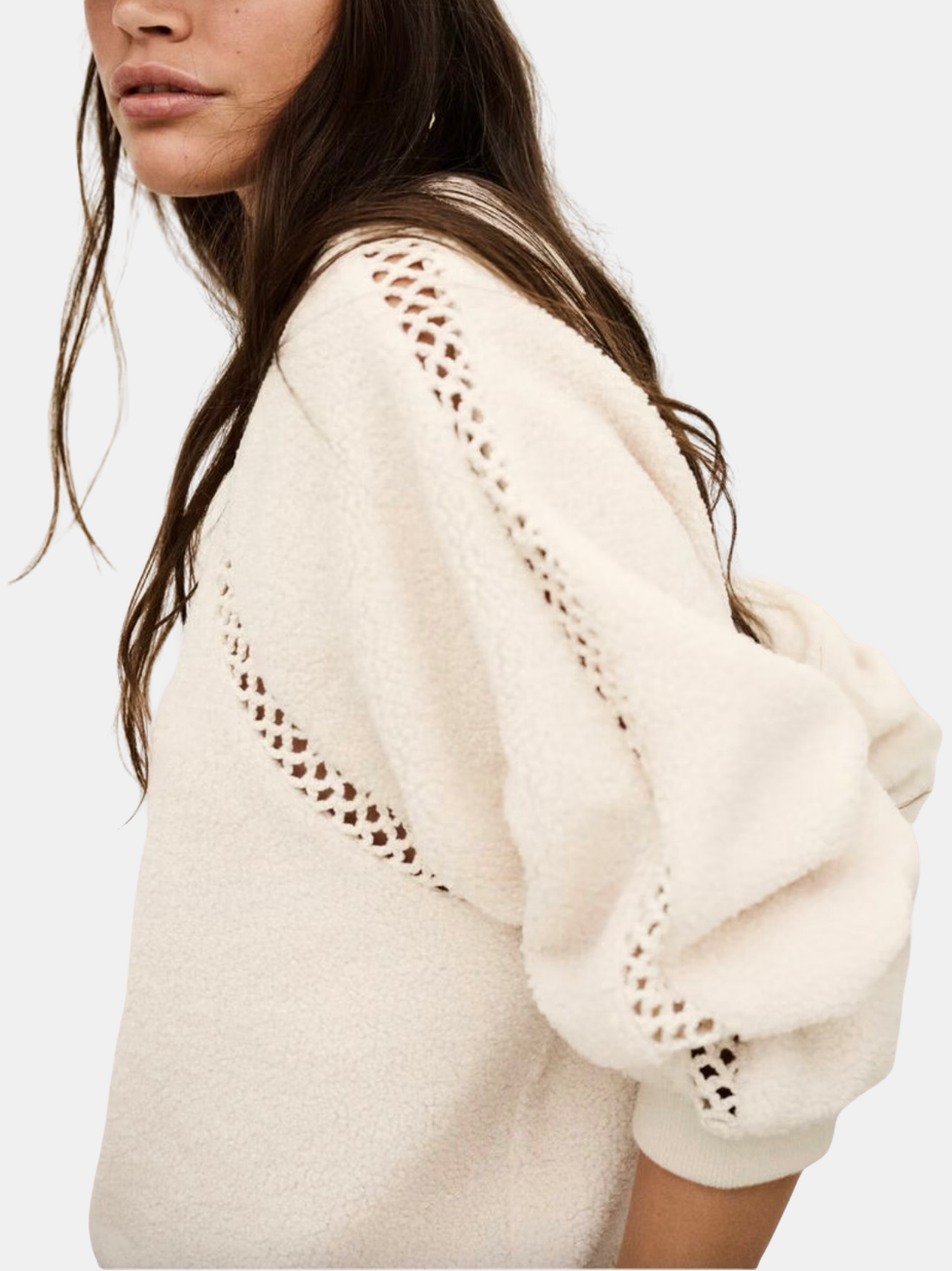 The Sweet Sweatshirt is a cozy, cropped top made from loopback fabric. It features long sleeves, a round neckline, a straight cut, and unique openwork detailing. The hem is designed to be fitted. Shown in Ecru.