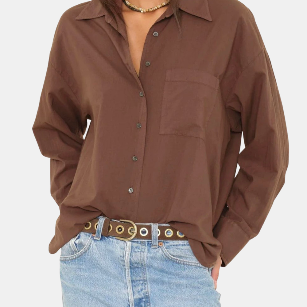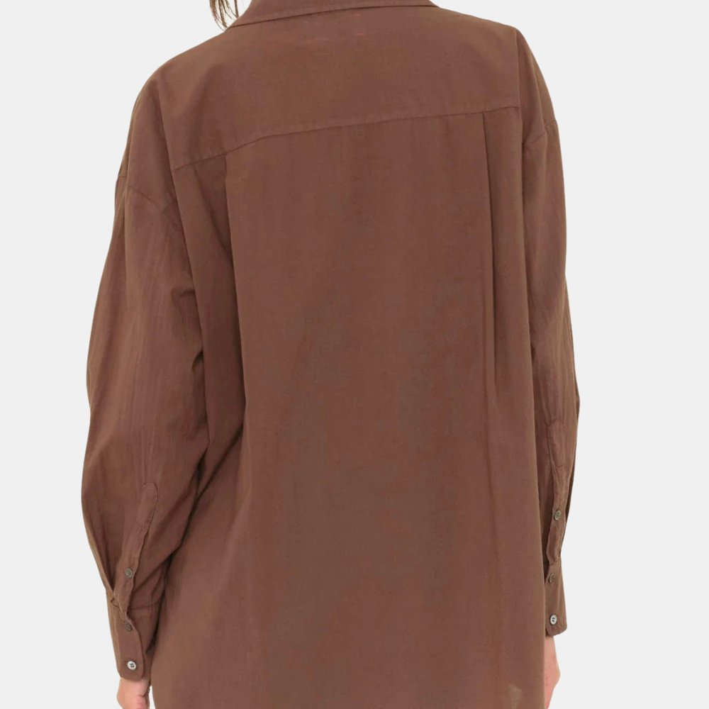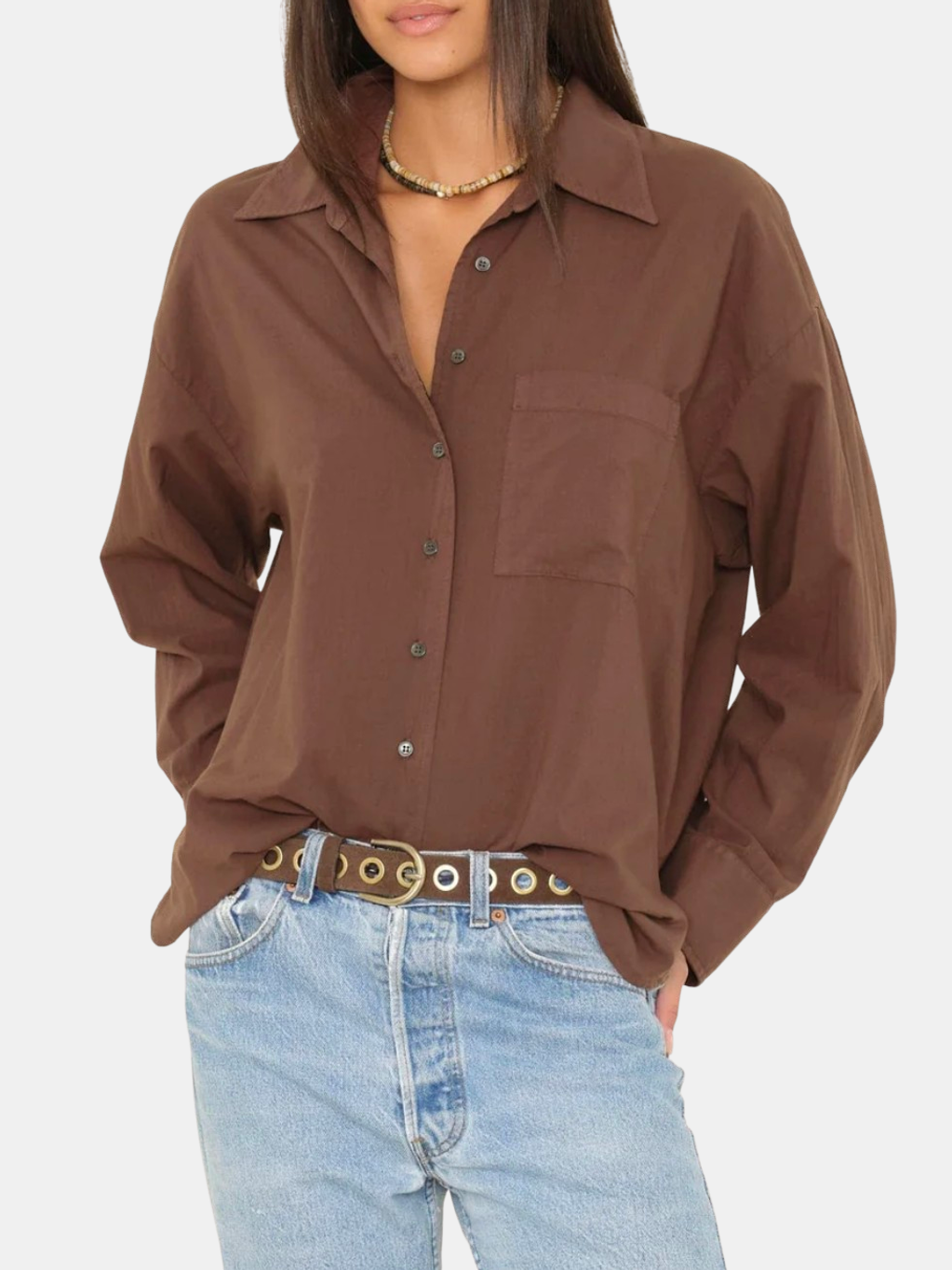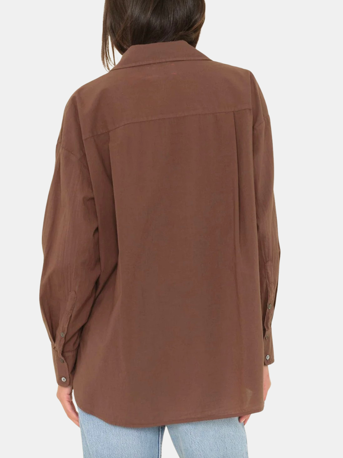 Easy does it. Sydney is made in a lightweight woven cotton poplin for a lived-in look and feel. This oversized button-down shirt has a left chest patch pocket. Shown in White and Stallion.