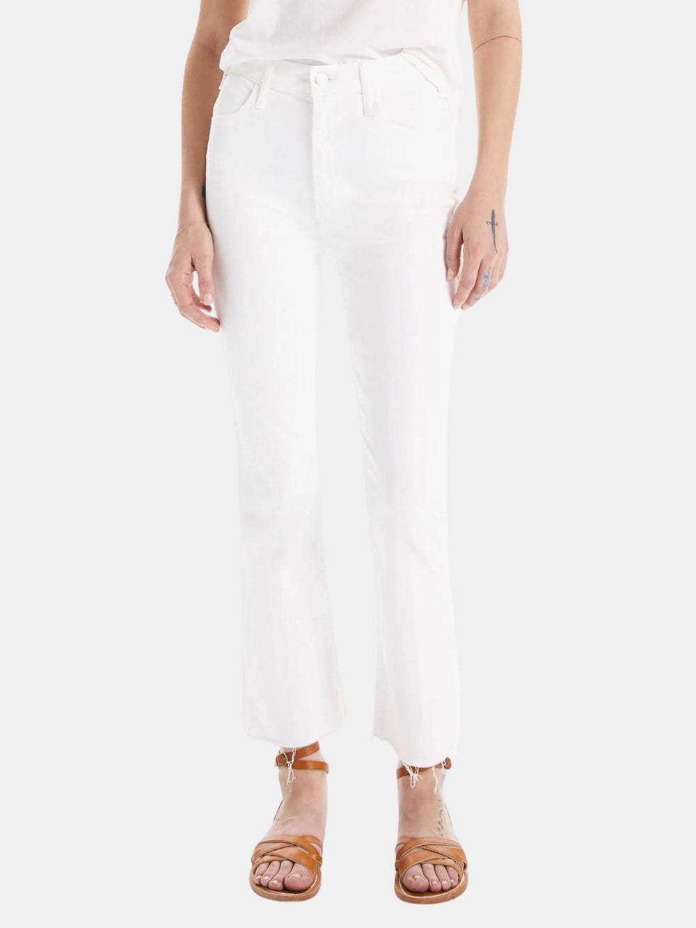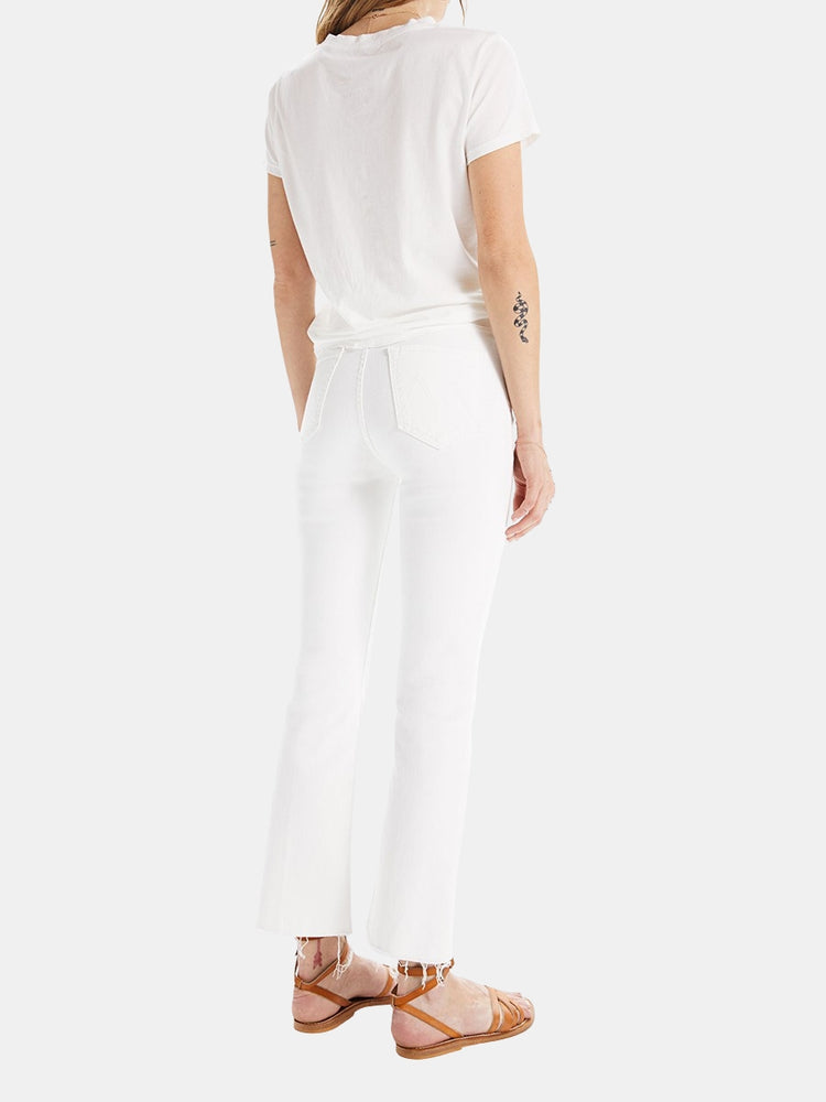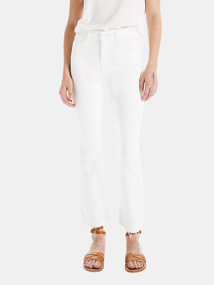 Mirror, mirror. This bestselling high-rise flare has an ankle-length inseam and a raw hem. Made from stretch fabric, Fairest Of Them All is a white denim. Shown in Fairest of Them All.