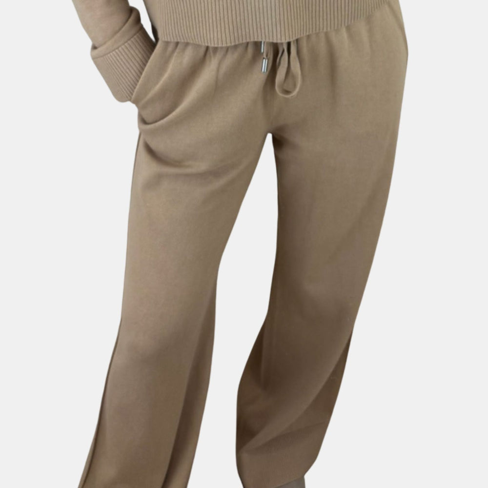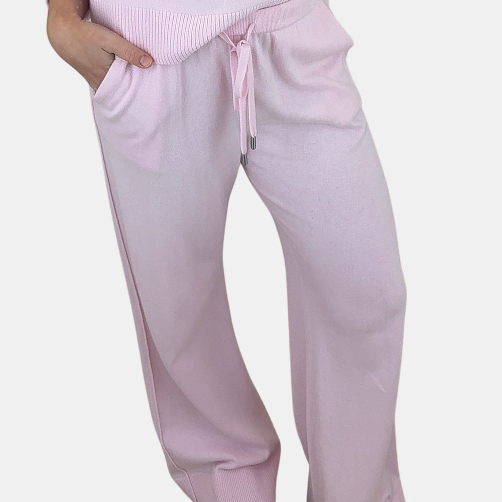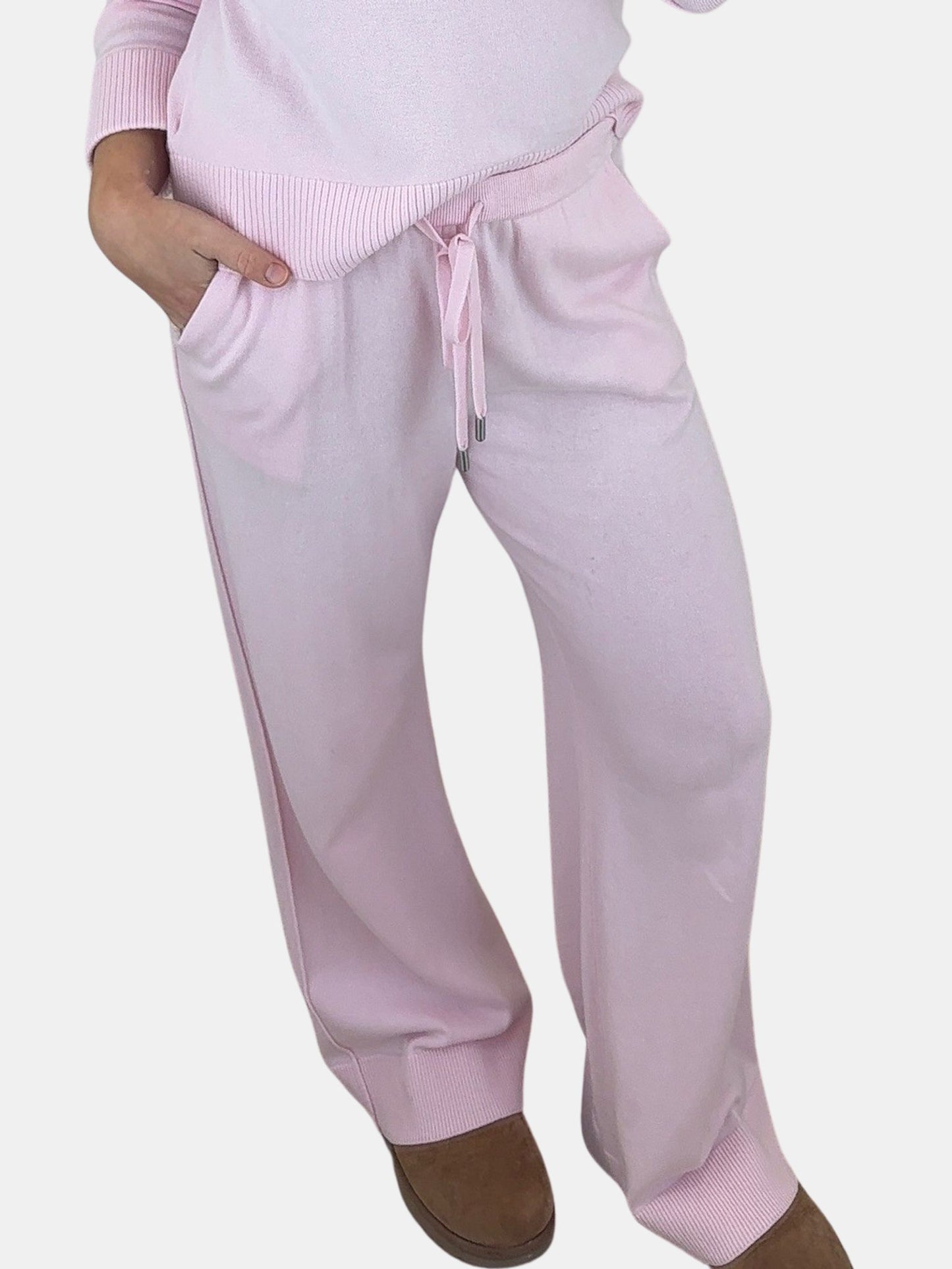 This wide-leg pant is knit in a cotton-cashmere blend, balancing softness with ease. A drawstring waistband and fluid drape emphasize comfort while maintaining refined proportion. Ribbed hems finish the silhouette with subtle structure, highlighting the artisanal knitwork. Pair with the Long Sleeve Polo for a matching set. Shown in Ballet Pink and Light Camel.
